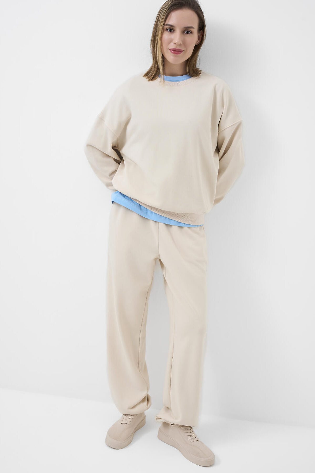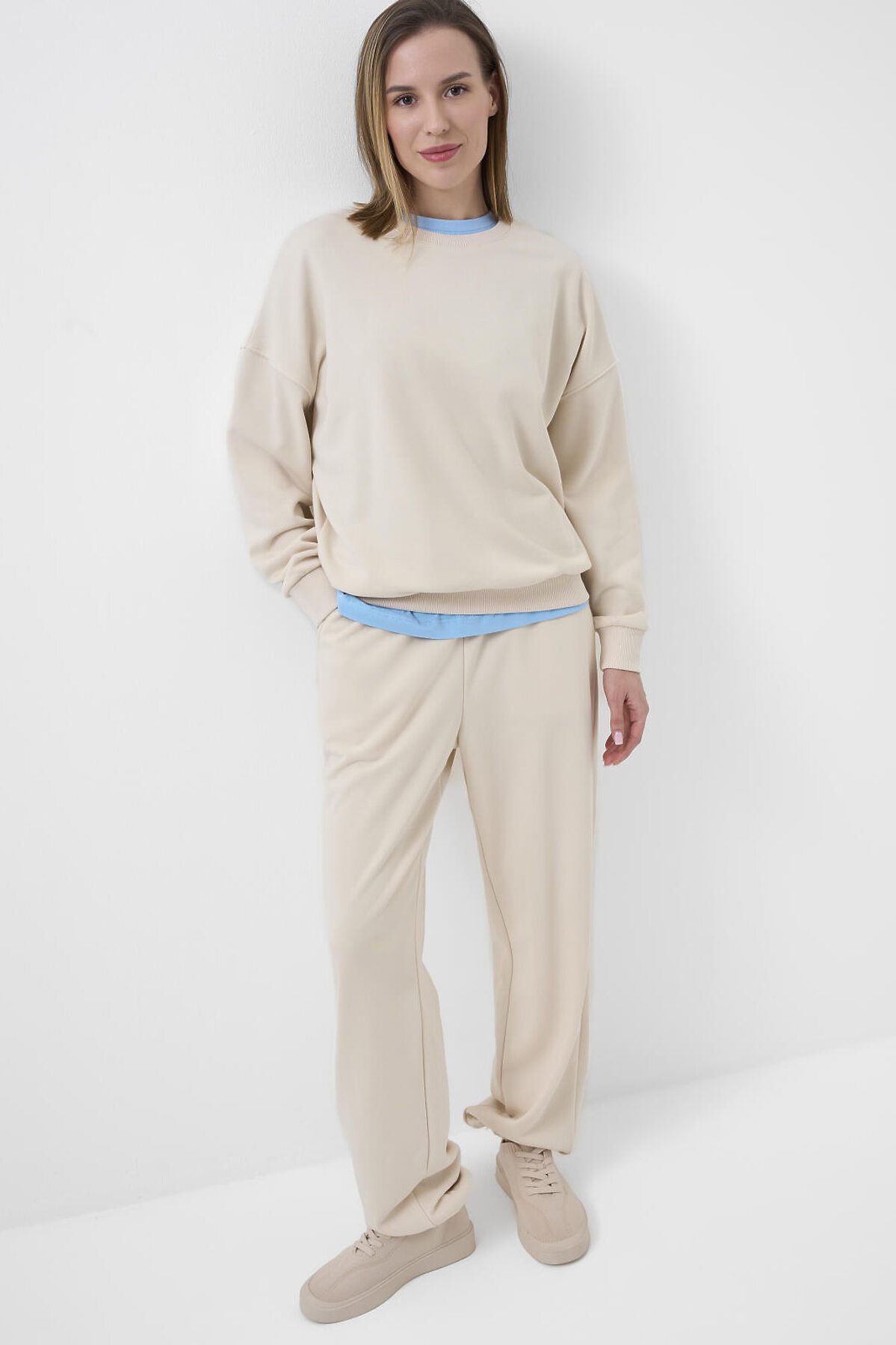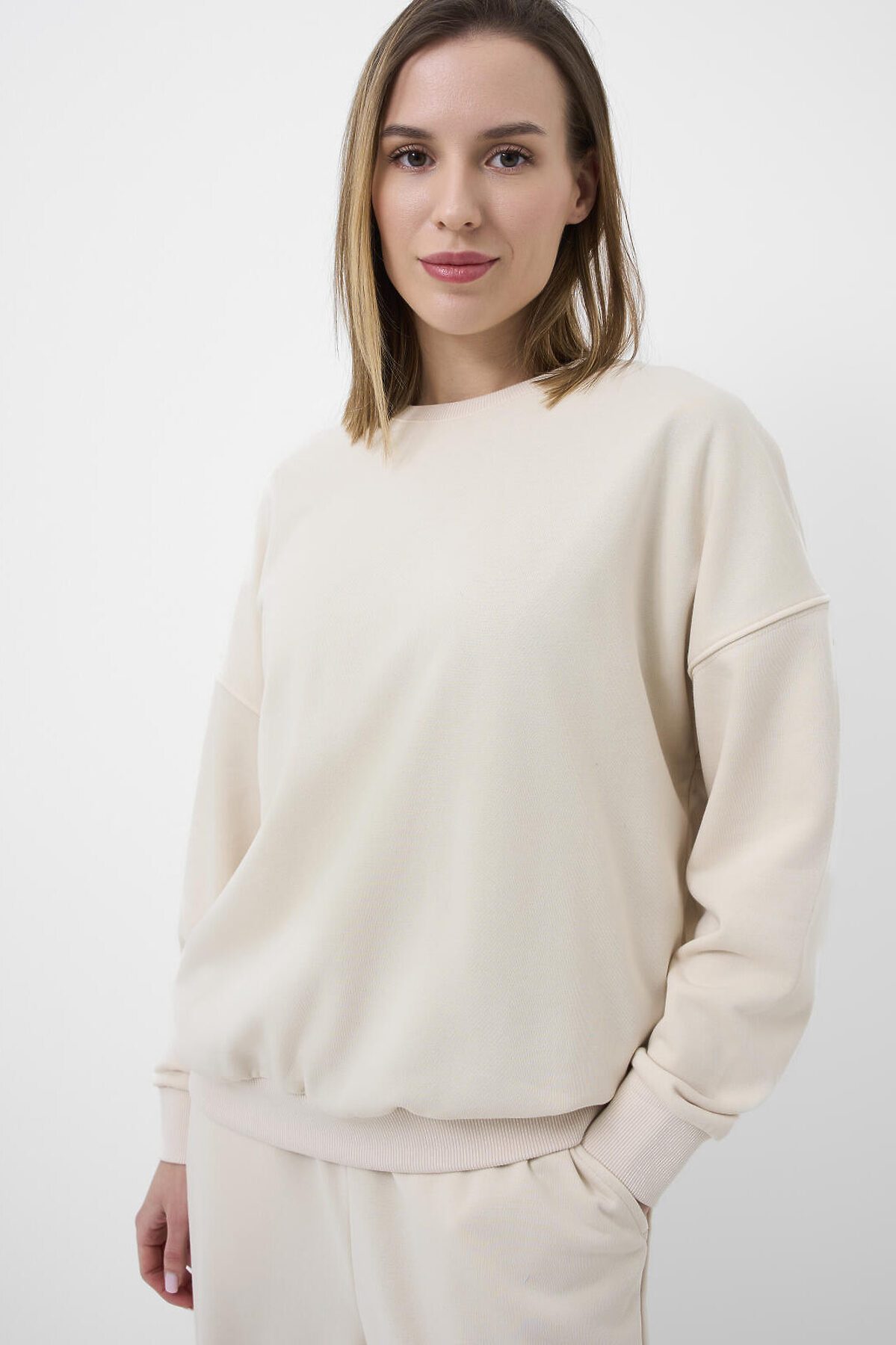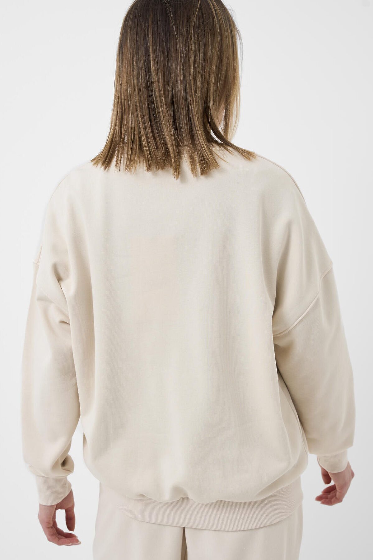 Женский молочный свитшот оверсайз. Выполнен из хлопкового футера без начеса. Горловина, манжеты и низ изделия выполнены из эластичного риба, что обеспечивает комфортную посадку.