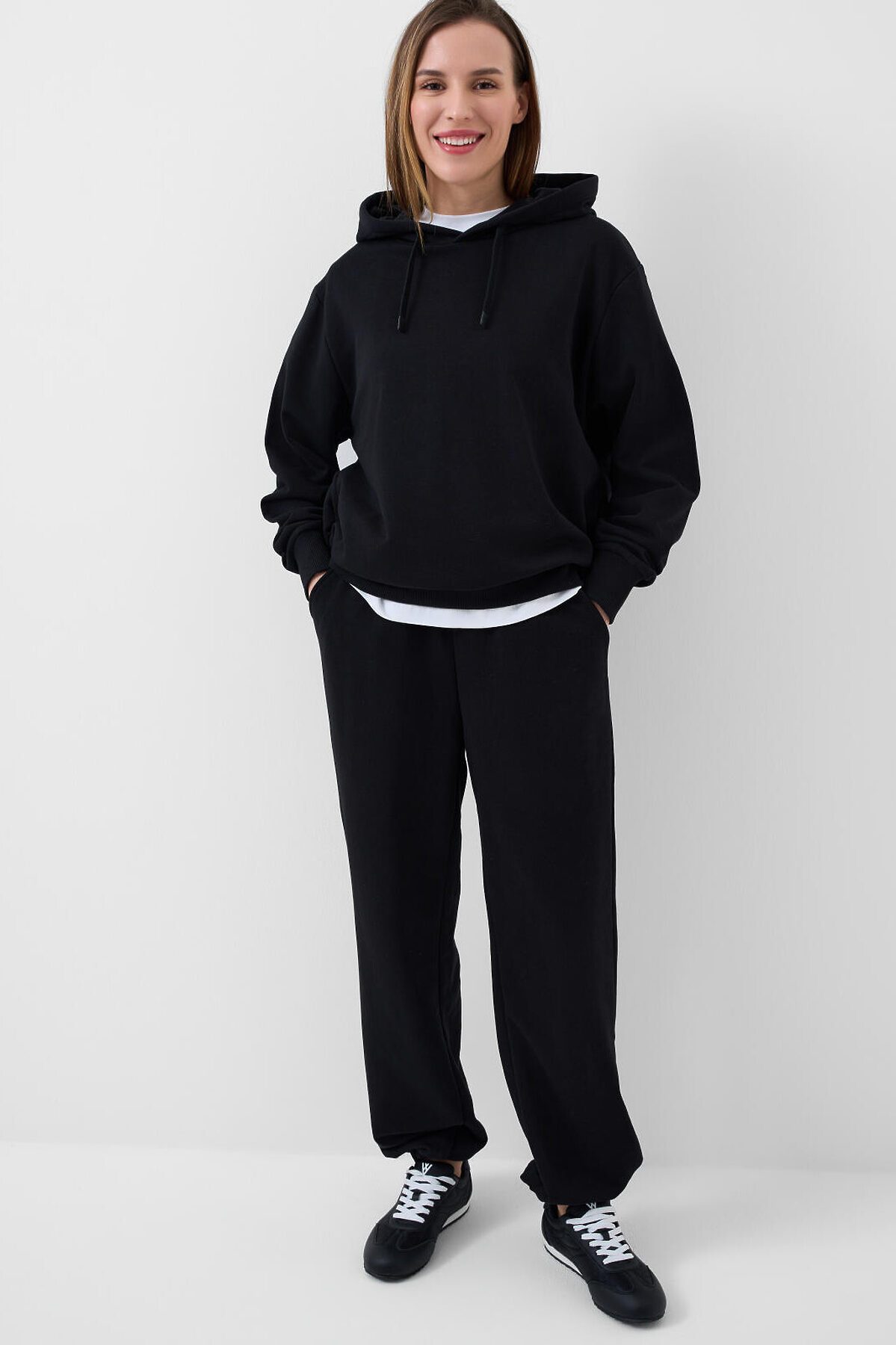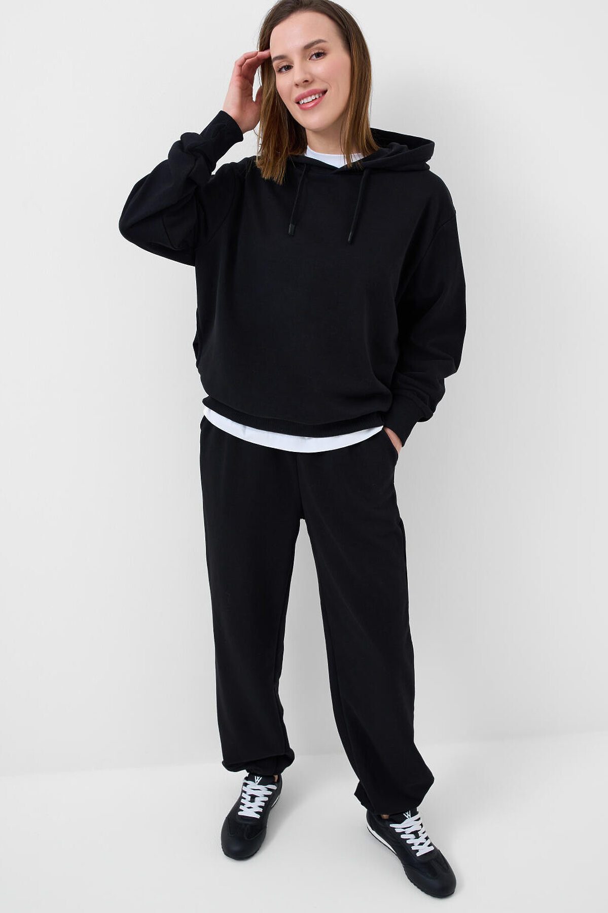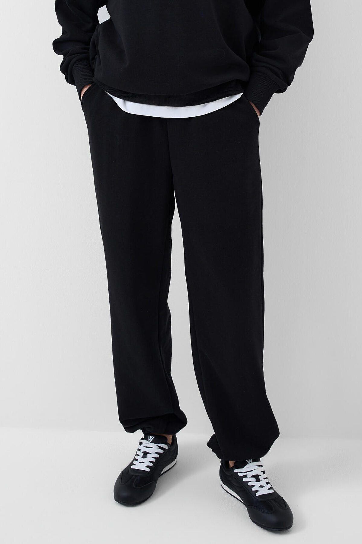 Спортивные базовые женские брюки. Выполнены из хлопкового трикотажа футер без начеса. Модель свободного кроя со средней посадкой на талии. Пояс на резинке, дополнительно регулируется шнурком. По бокам — удобные карманы. В нижней части брючин предусмотрена резинка для лучшей посадки.