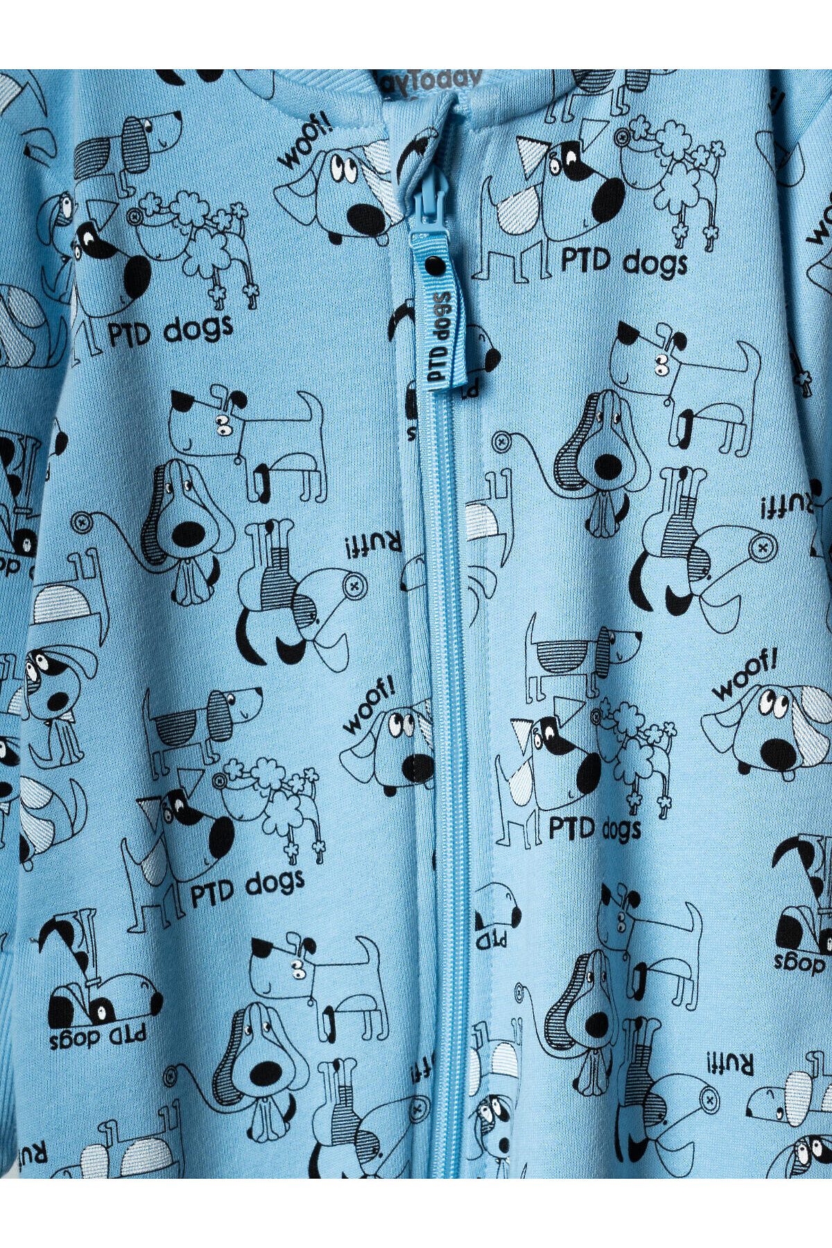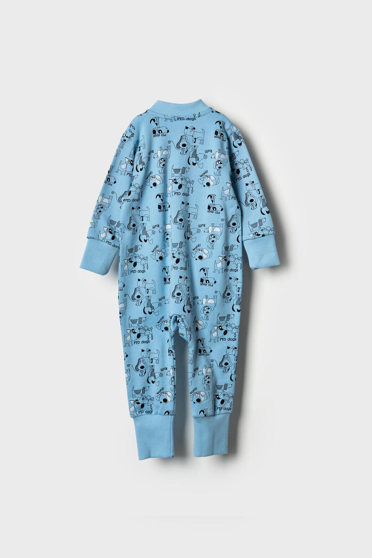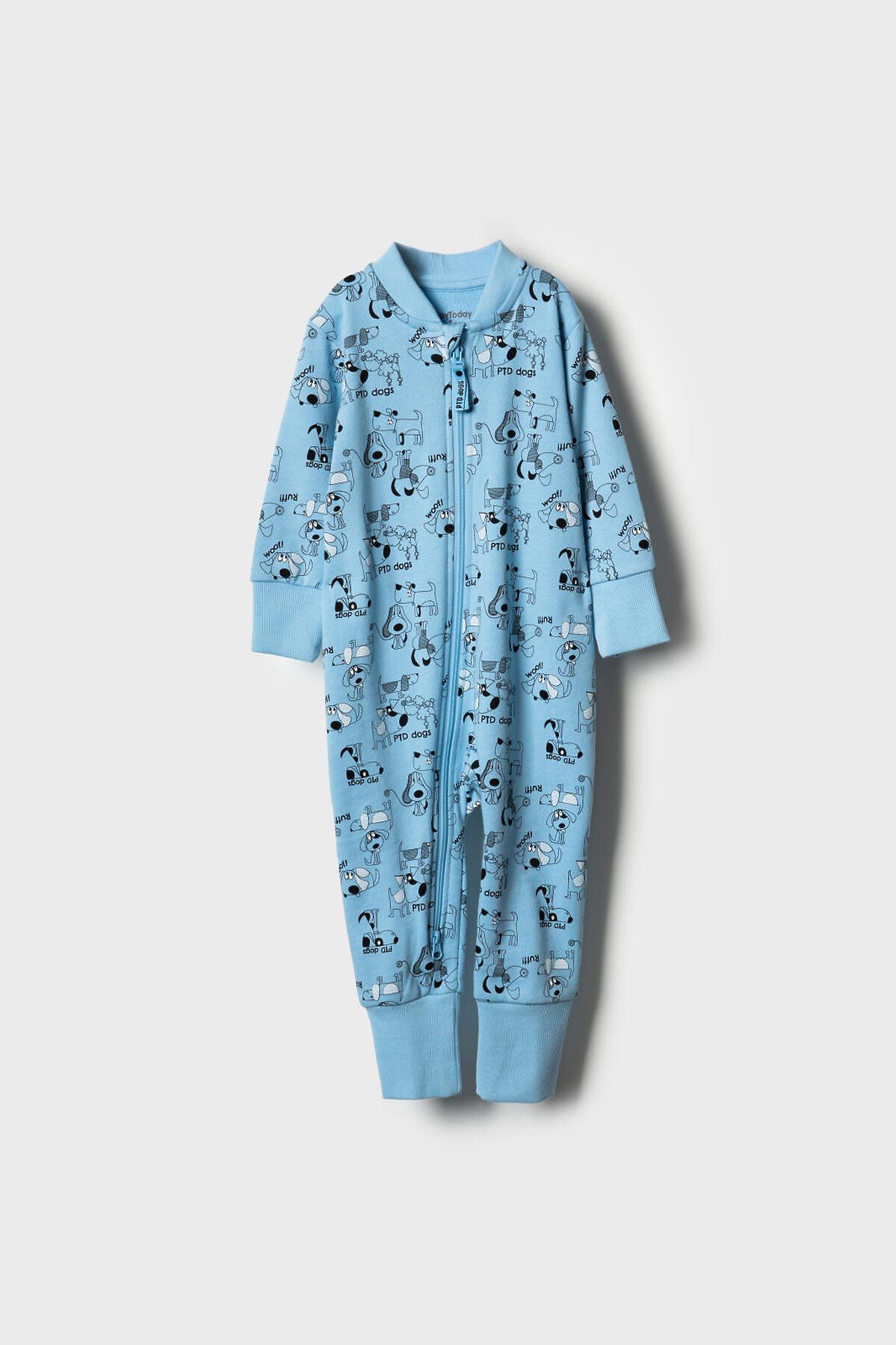 Детский комбинезон для новорождённого мальчика. Выполнен из мягкого, хлопкового трикотажа. Дизайн - весёлые принты с собаками. У комбинезона длинные рукава и штанишки, а манжеты на них выполнены из рельефного риба. Застёгивается на удобную молнию, которая идёт по диагонали, что облегчает переодевание малыша. Горловина круглая, также отделана рибом.