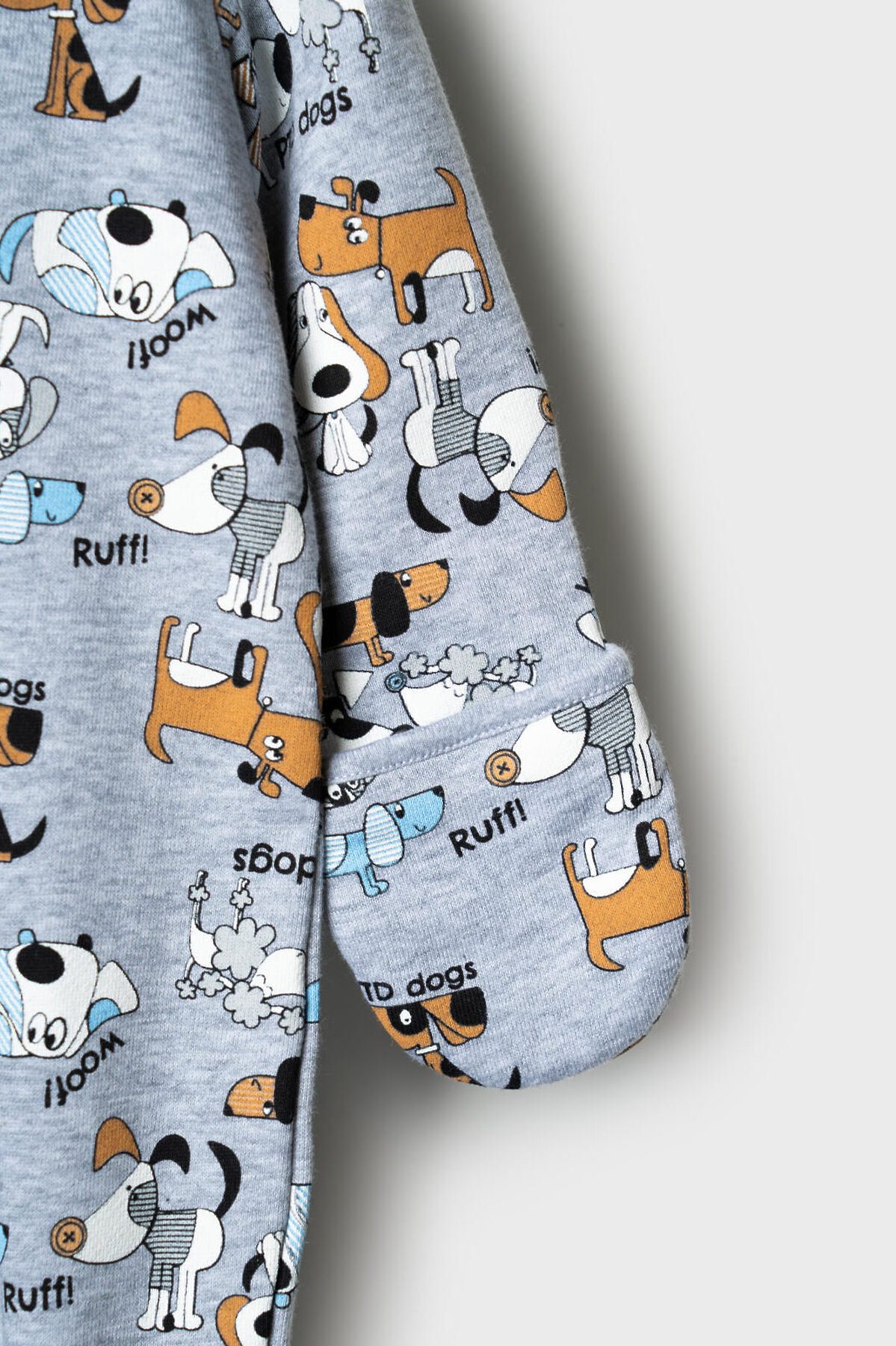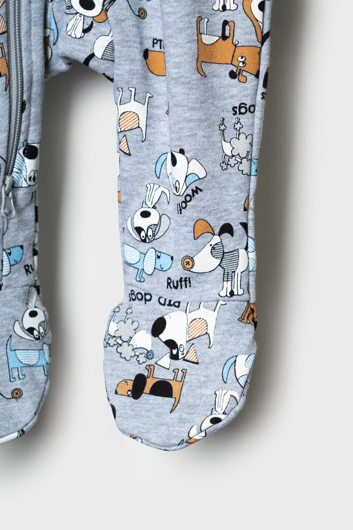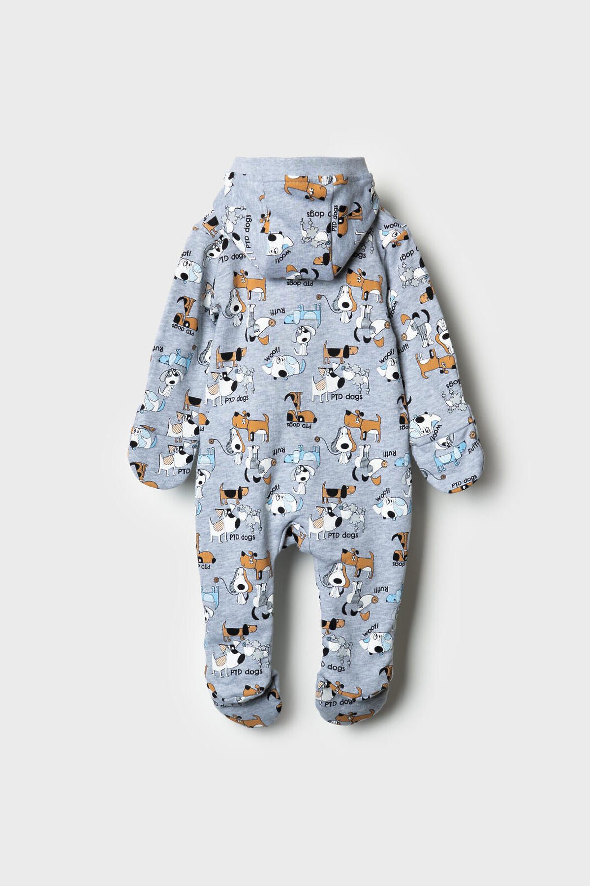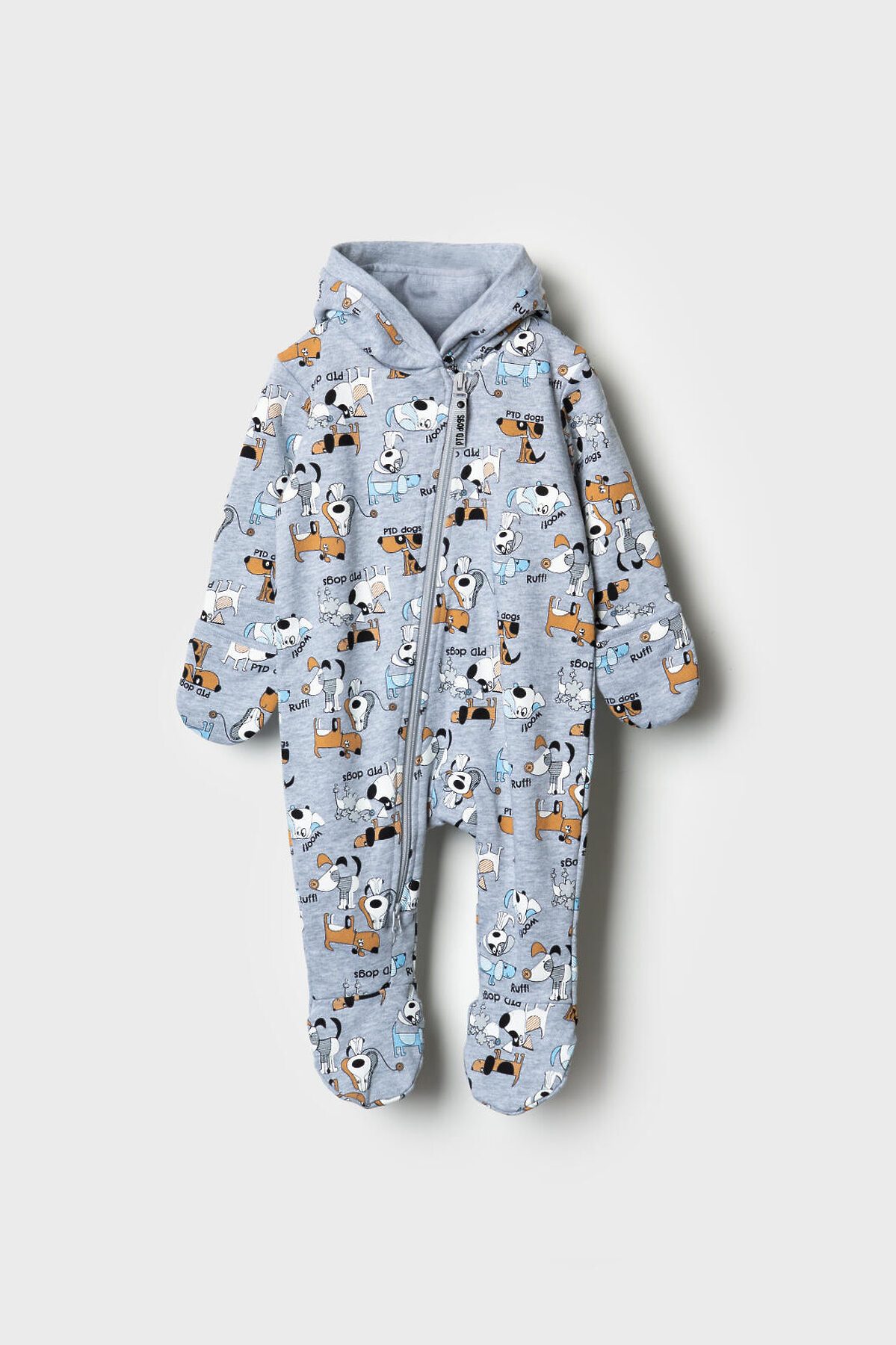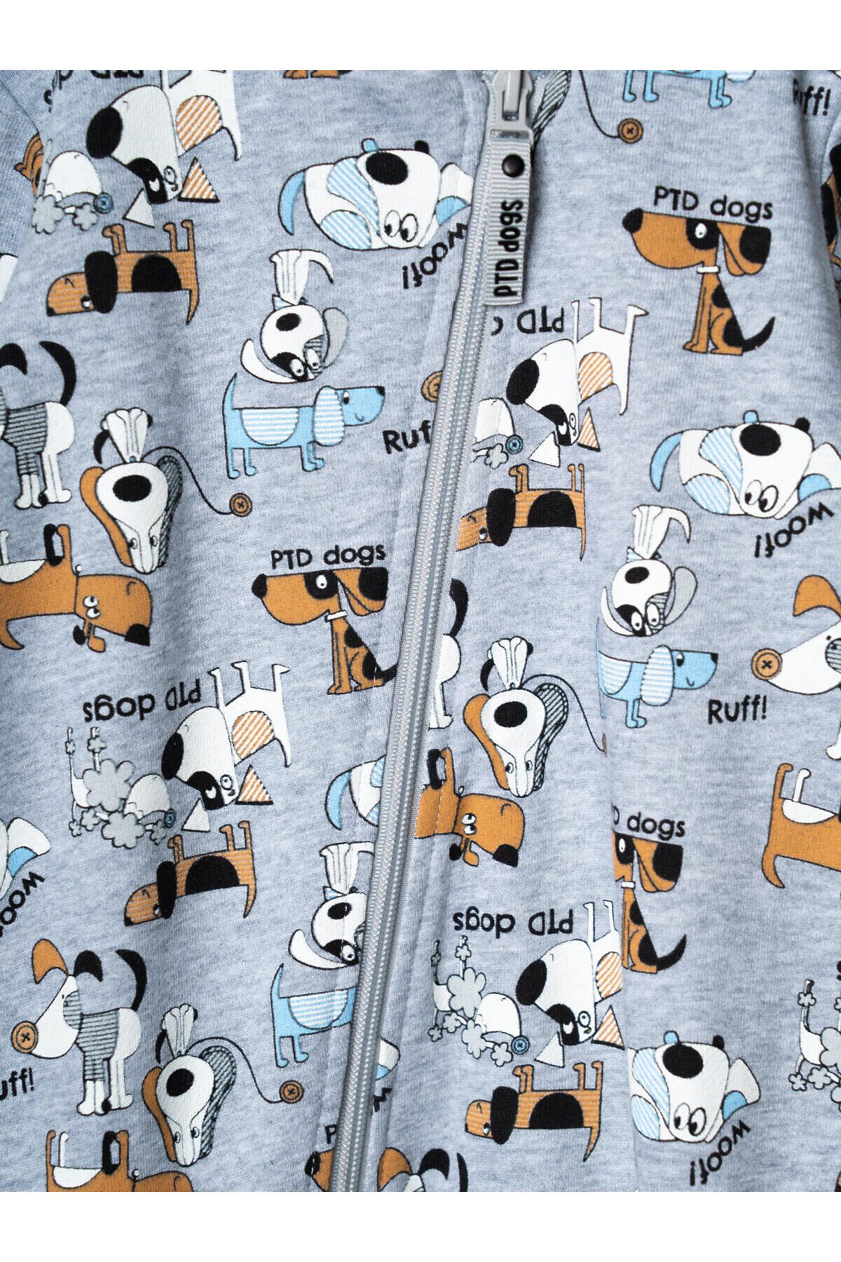 Детский комбинезон для новорожденного мальчика. Модель из мягкого, хлопкового трикотажа. Комбинезон с весёлым принтом – на ткани изображены мультяшные собачки и надписи. Капюшон, длинные рукавички и закрытые ножки - хорошо защищают малыша от прохлады. Молния расположена асимметрично – от капюшона до шва между ножками, что удобно при переодевании. Внутри есть мягкая подкладка.
