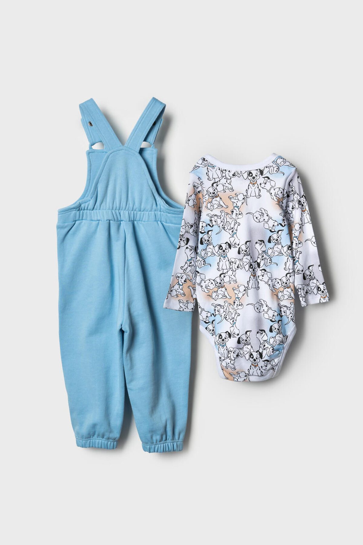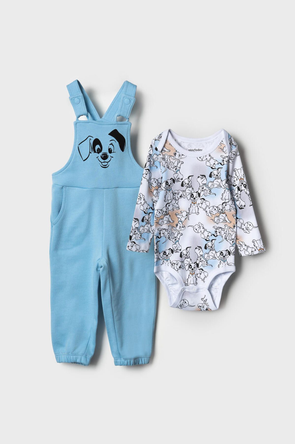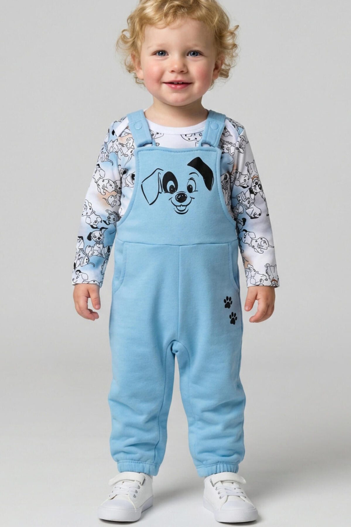 Комплект детский для мальчика. Состоит из двух изделий: боди с длинным рукавом и удобный полукомбинезон. Боди выполнен из мягкого хлопкового трикотажа интерлок с ярким принтом героев «101 далматинец», с застёжкой на кнопках внизу для легкого переодевания. У боди два ряда кнопок - растет вместе с малышом. Полукомбинезон — однотонный хлопковый, на широких перекрестных бретелях, с резинкой на спинке и удобными карманами. На груди размещён крупный рисунок мордочки щенка, а сбоку — милые следы лапок.