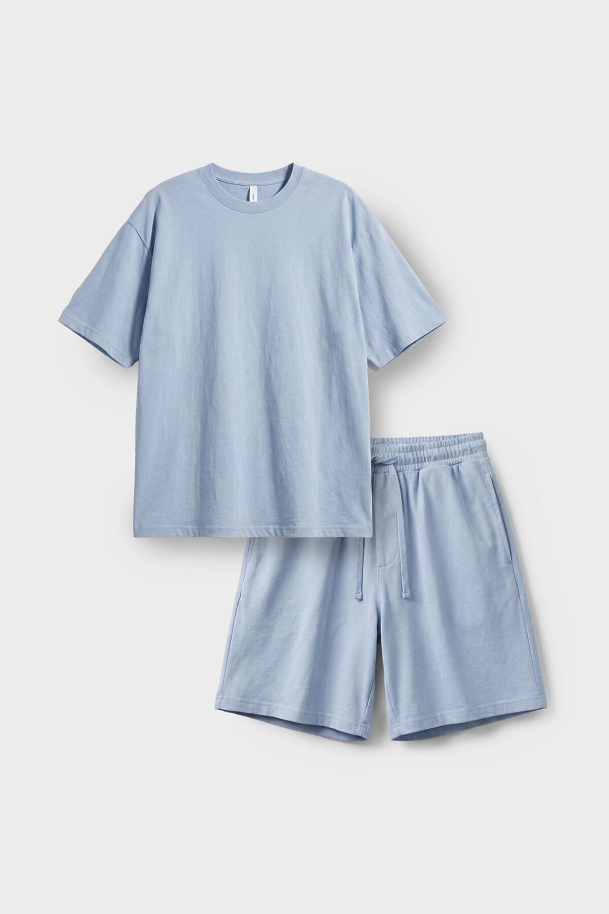 Женский базовый костюм. Состоит из футболки и шорт. Выполнен из хлопкового трикотажа. Футболка оверсайз, с коротким рукавом. Шорты свободные, с эластичным поясом и шнурком для регулировки посадки. По бокам расположены карманы.