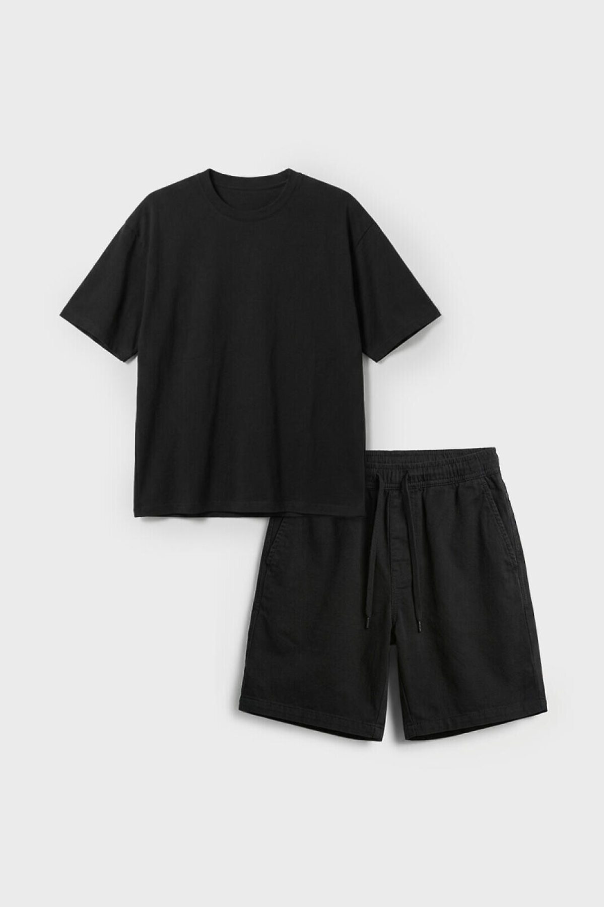 Женский базовый костюм. Состоит из футболки и шорт. Выполнен из хлопкового трикотажа. Футболка оверсайз, с коротким рукавом. Шорты свободные, с эластичным поясом и шнурком для регулировки посадки. По бокам расположены карманы.