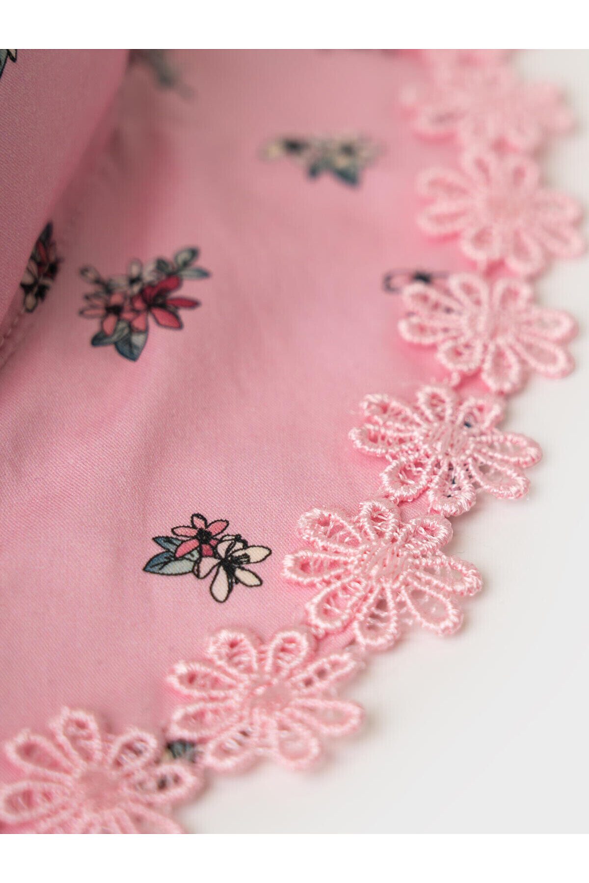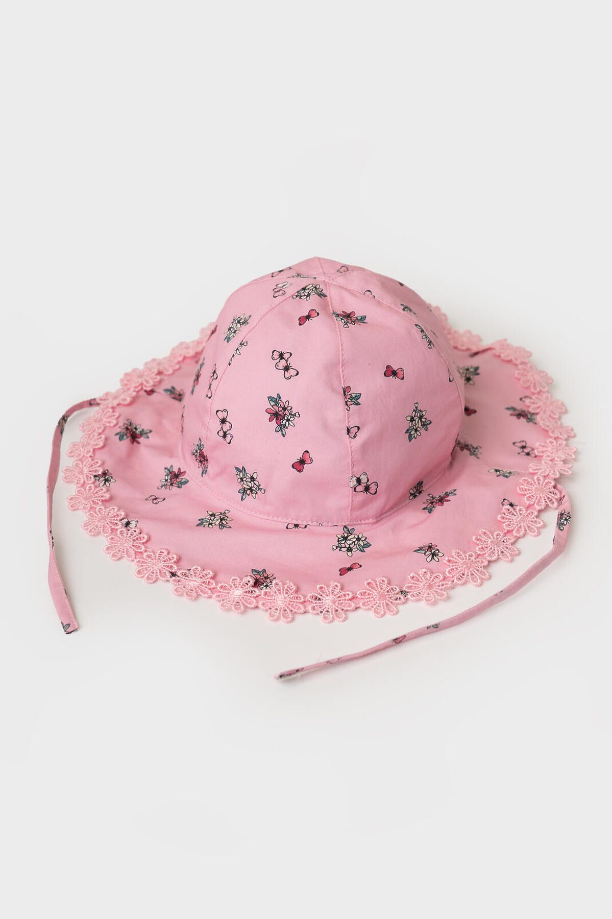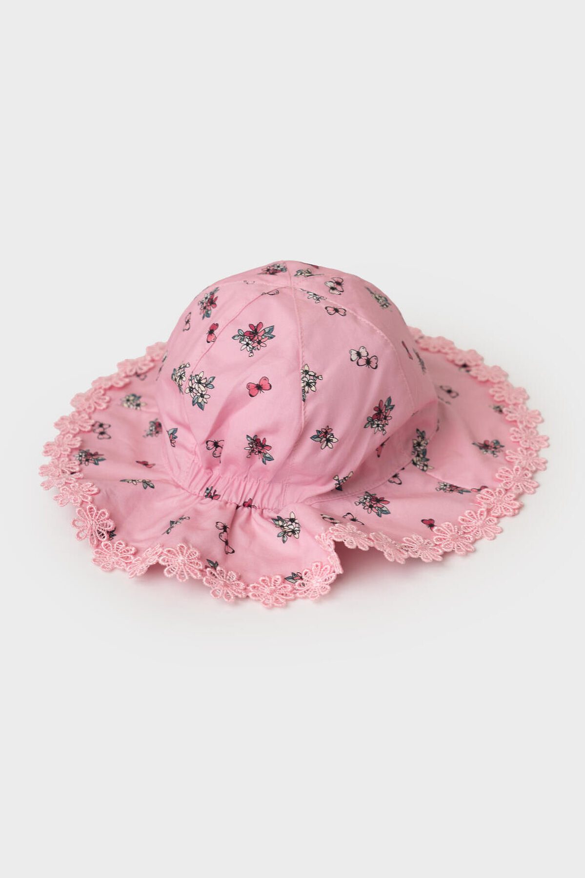 Детская панама для девочки. Модель выполнена в нежно-розовом цвете с красивым мелким рисунком — на ткани изображены цветочки, бантики и ягодки. Широкие поля украшены воланом, который по краю отделан кружевной тесьмой. Панама хорошо сидит на голове благодаря эластичной вставке на затылке и завязкам.