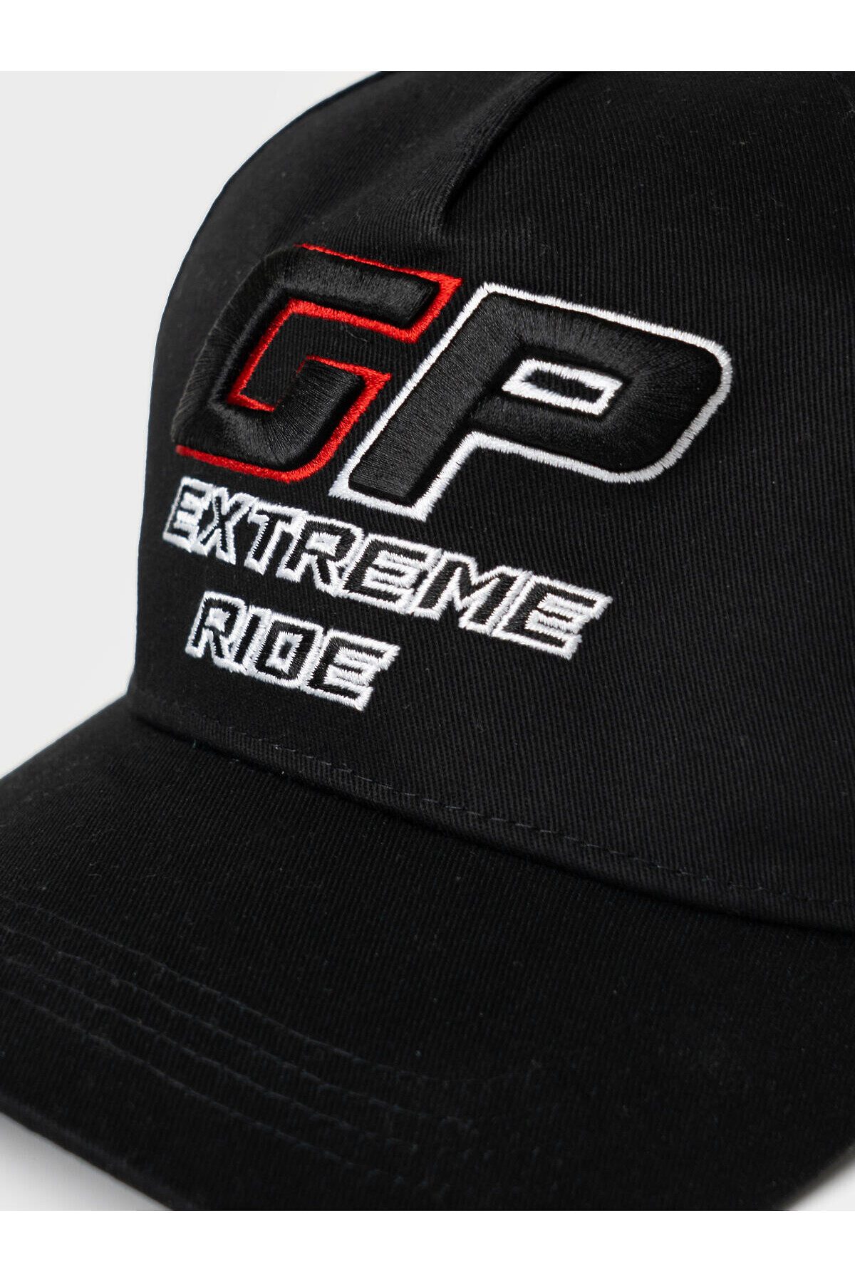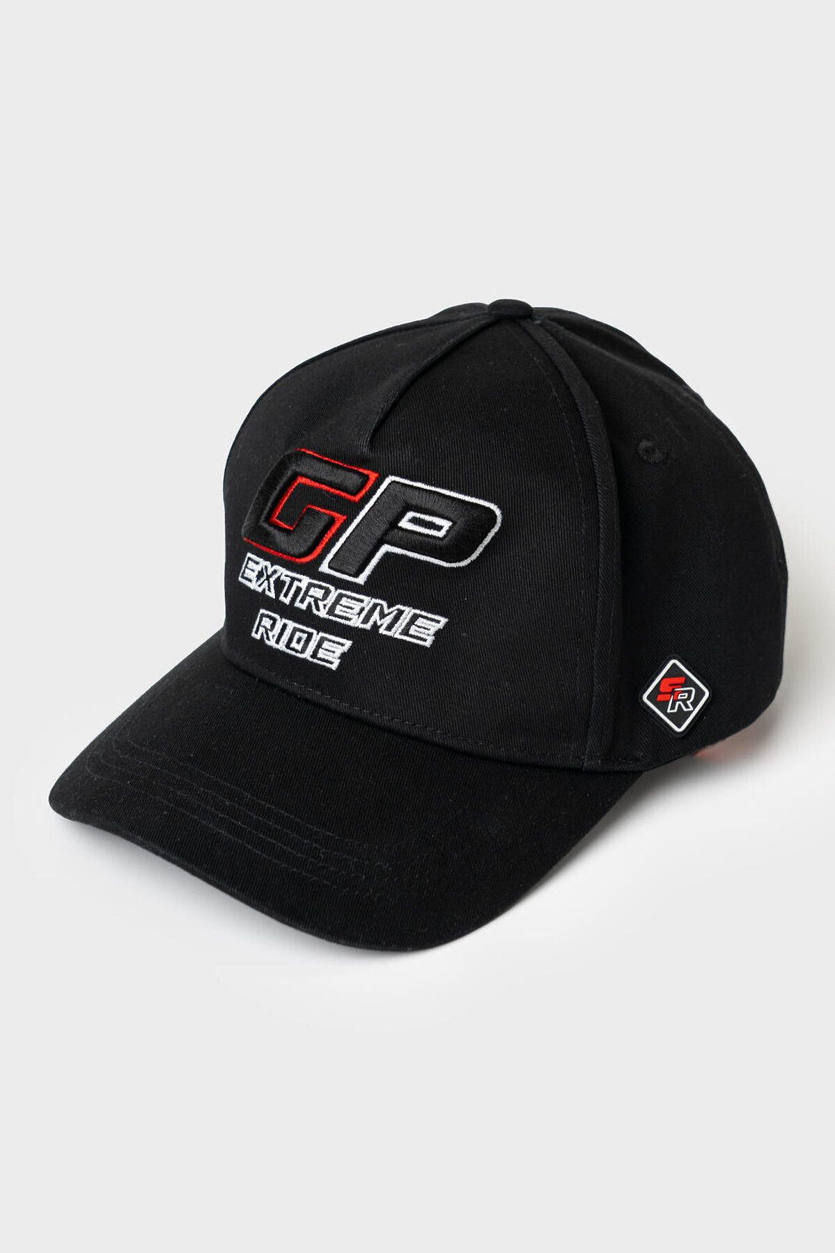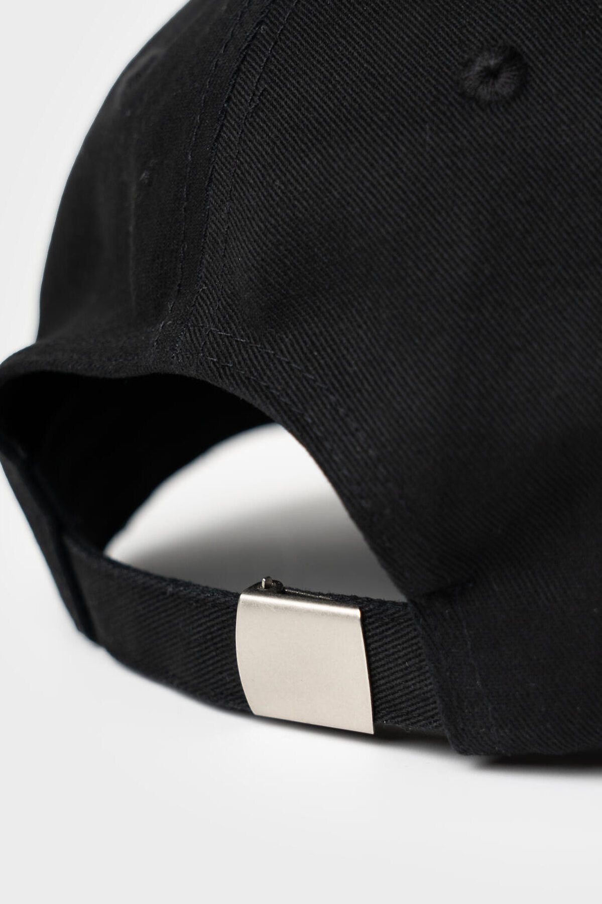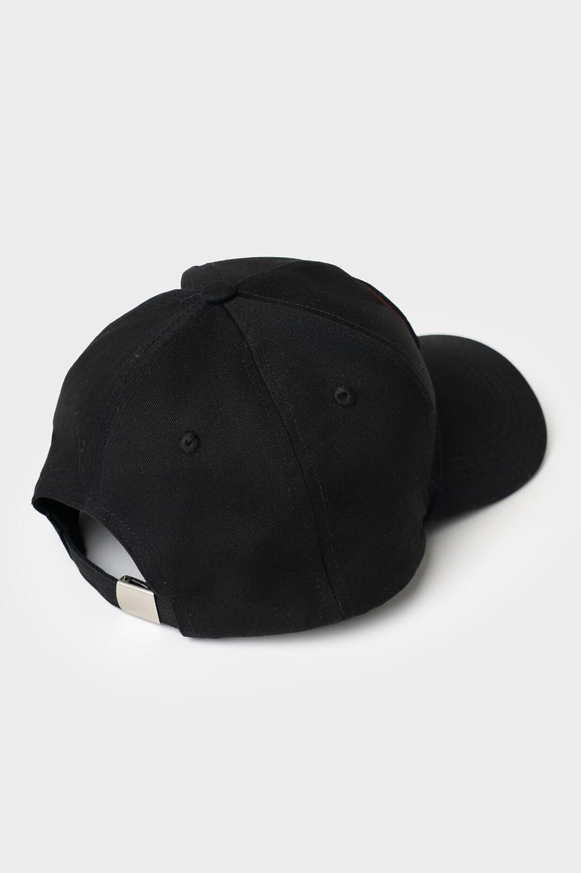 Мужская бейсболка из черного хлопкового текстиля с жестким изогнутым козырьком. На передней части вышит крупный логотип, а сбоку — фирменный силиконовый шеврон. Козырек украшен серым кантом, подчеркивающим форму. Размер можно отрегулировать с помощью металлической пряжки сзади. На верхней части — небольшая пуговица и вентиляционные отверстия.