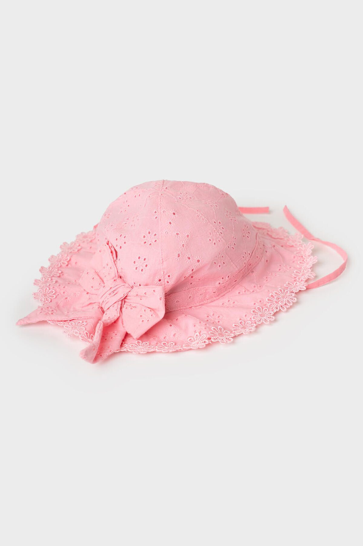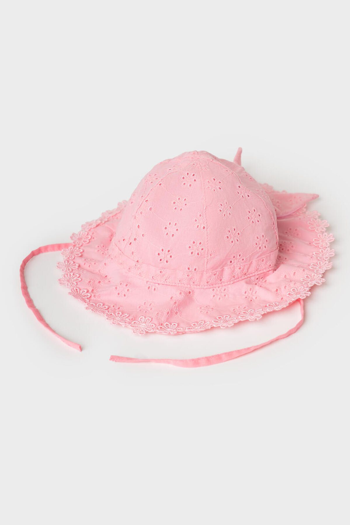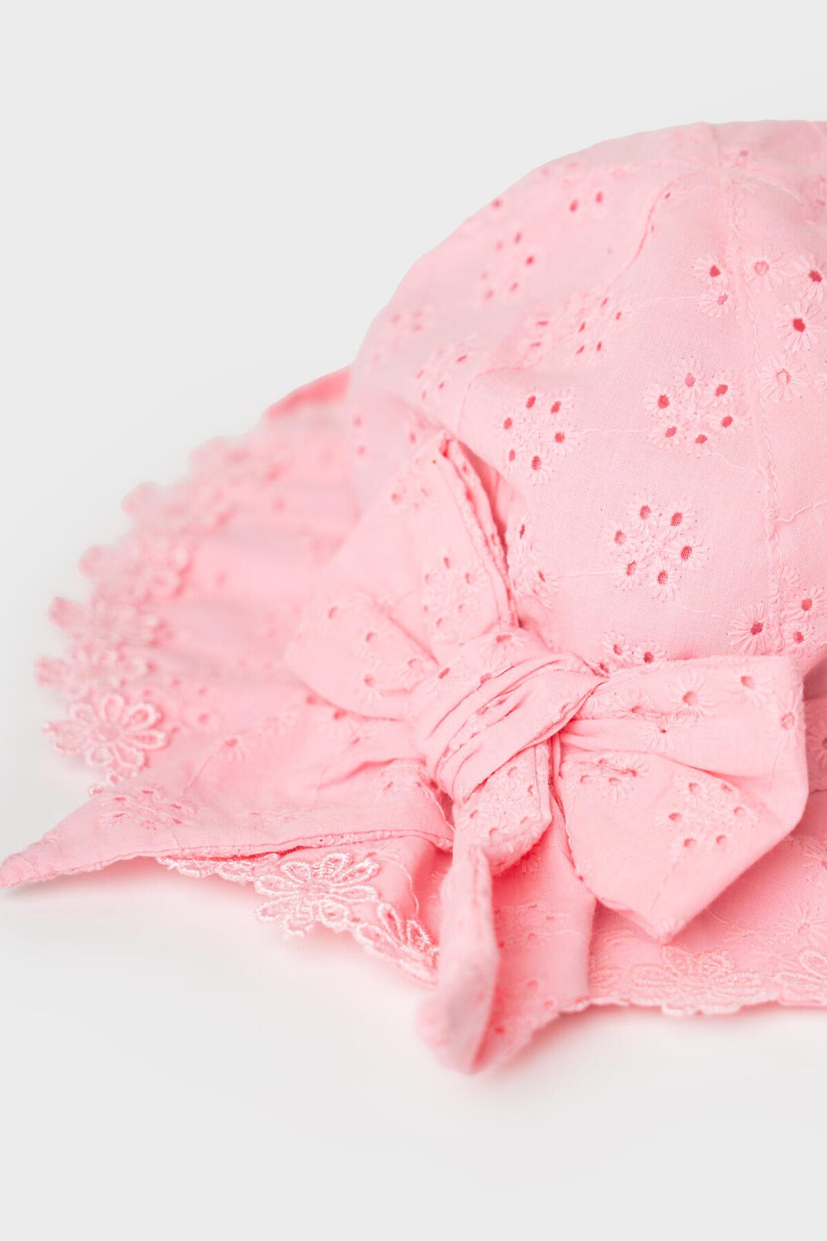 Летняя детская панамка для девочки. Модель с мягкими полями и крупным декоративным бантом сзади. Выполнена из тонкой хлопковой ткани с ажурным цветочным узором. По краю полей идет аккуратная кружевная отделка, которая придаёт изделию нежный и нарядный вид. Сзади предусмотрена эластичная резинка для лучшей посадки на голове. Панамка фиксируется с помощью завязок.