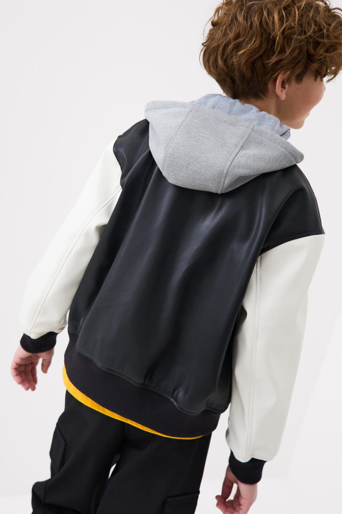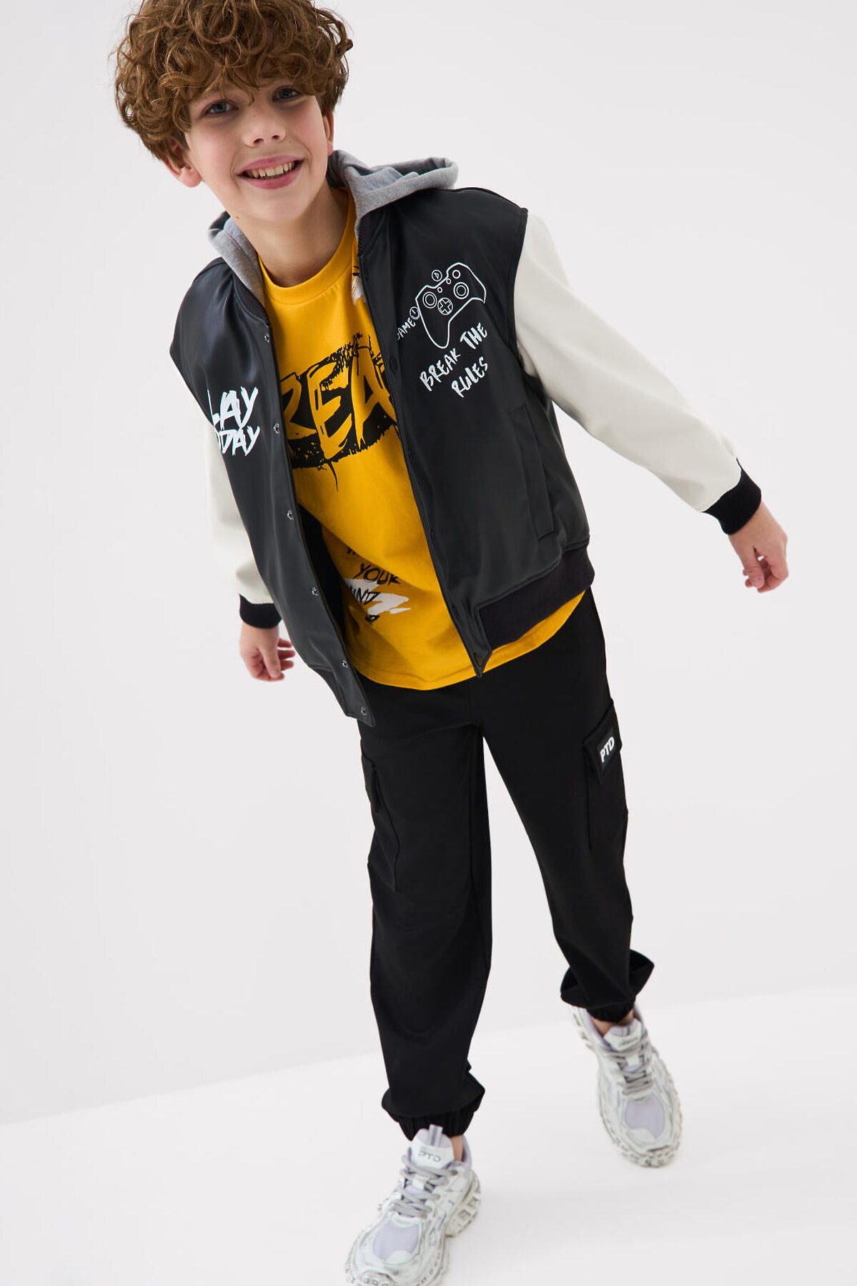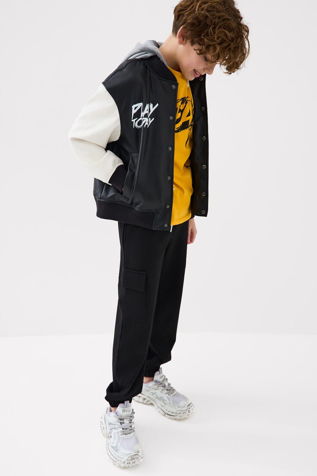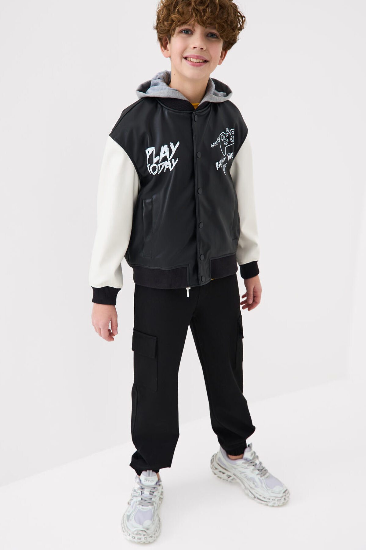 Бомбер для мальчика подростка. Температурный режим от +20°C до +10°C. Внутри гладкая подкладка. Застежка — на кнопки. Два боковых кармана. Низ и манжеты оформлены рибом. Капюшон — несъемный, с серой подкладкой. Внутри — дополнительные карманы. Бомбер подходит для повседневной носки и подчеркивает стильный городской образ.