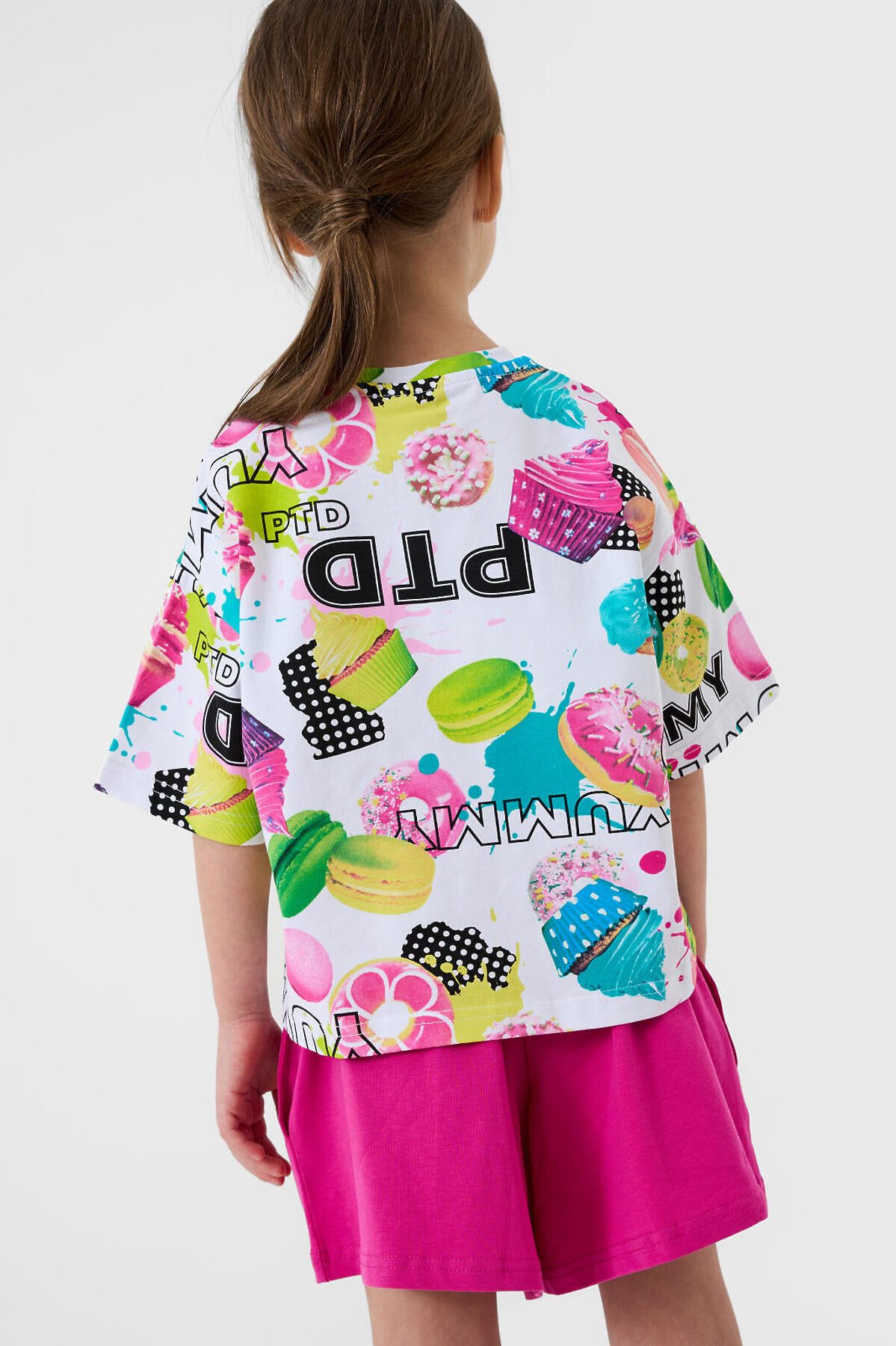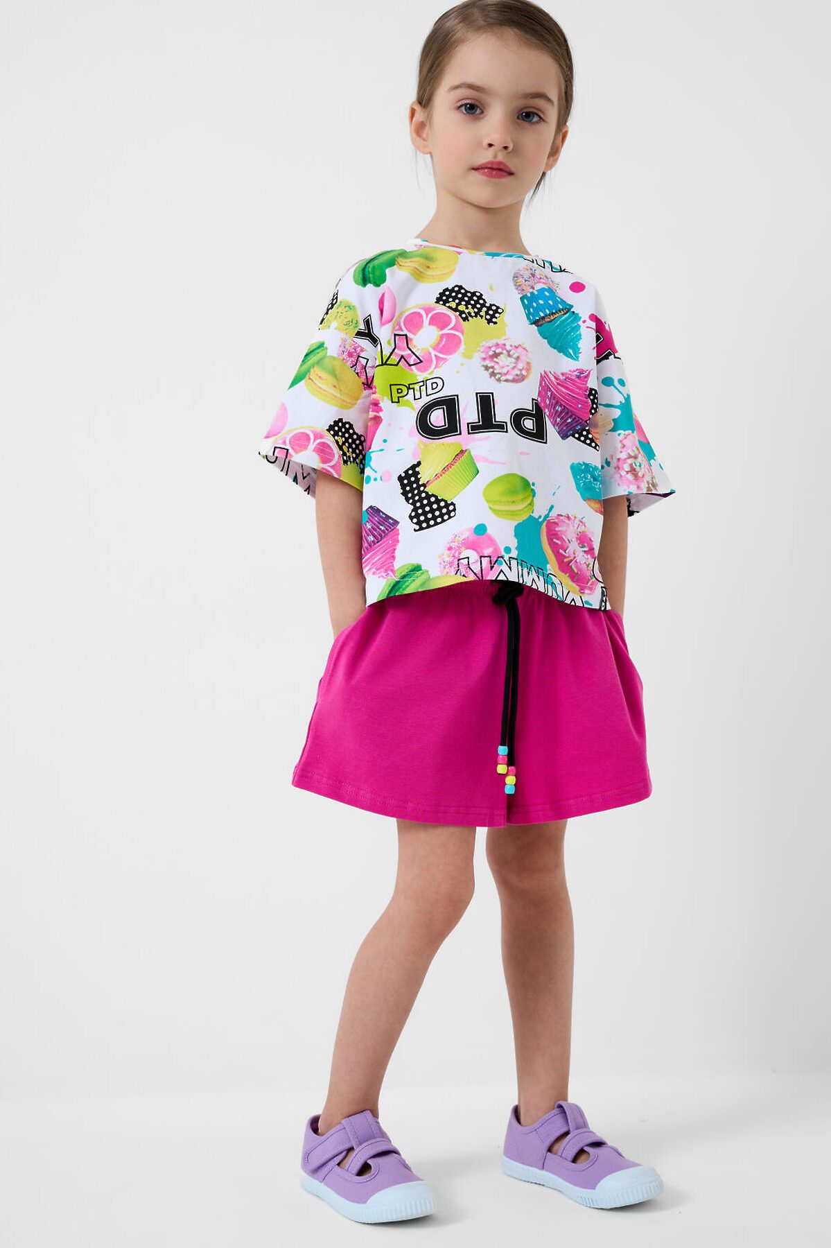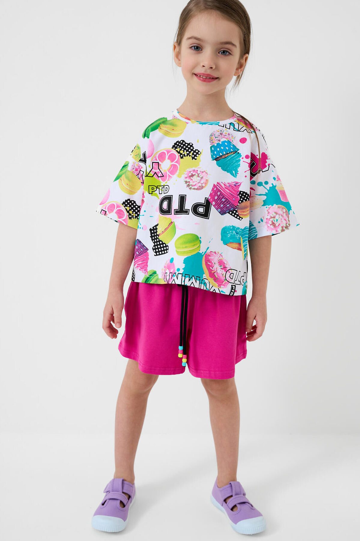 Детский костюм для девочки. Состоит из футболки с коротким рукавом и шорт. Выполнен из хлопкового трикотажа. Укороченная футболка оверсайз с красочным принтом. Шорты свободные, короткие, хорошо сидят на талии благодаря эластичному поясу и регулирующему шнурку. Удобные боковые карманы.