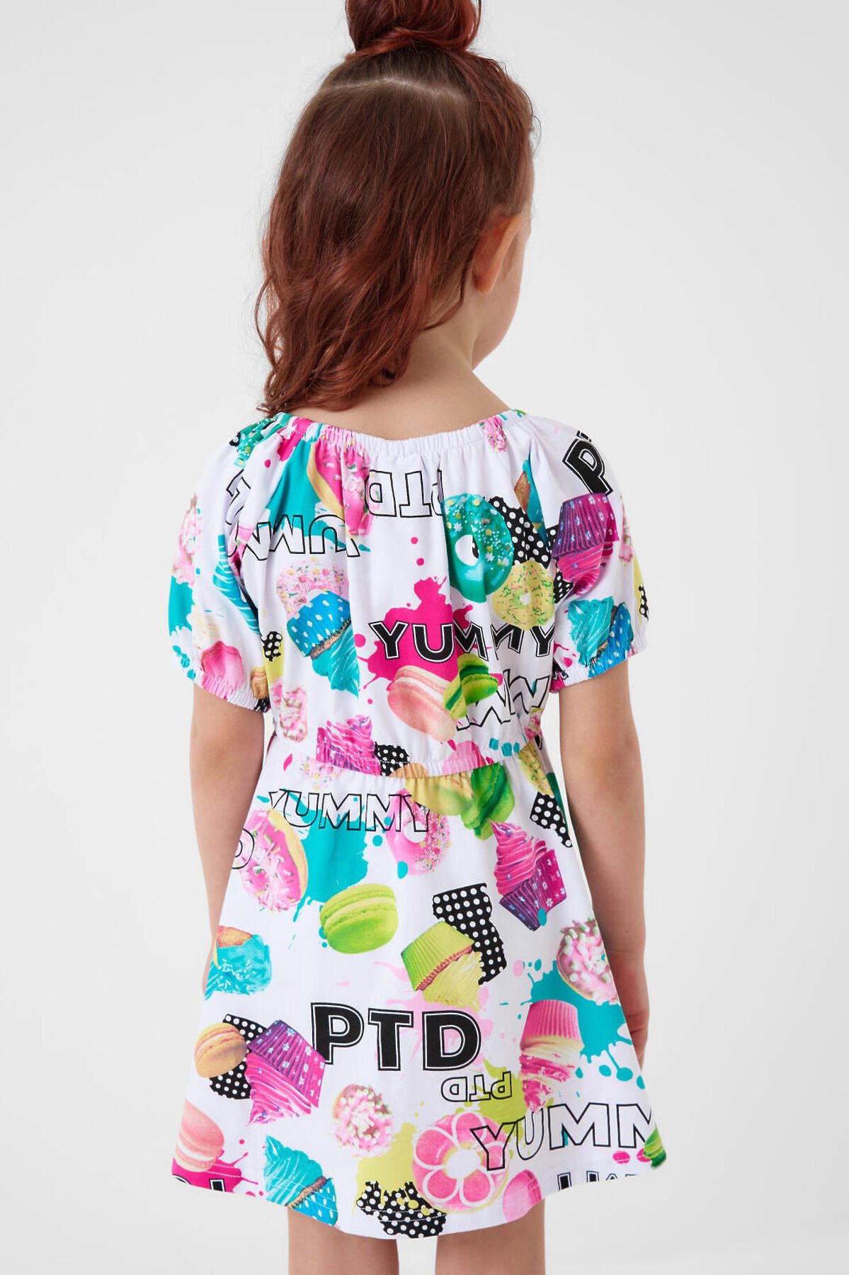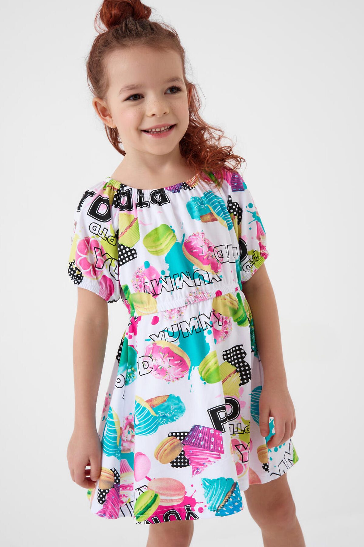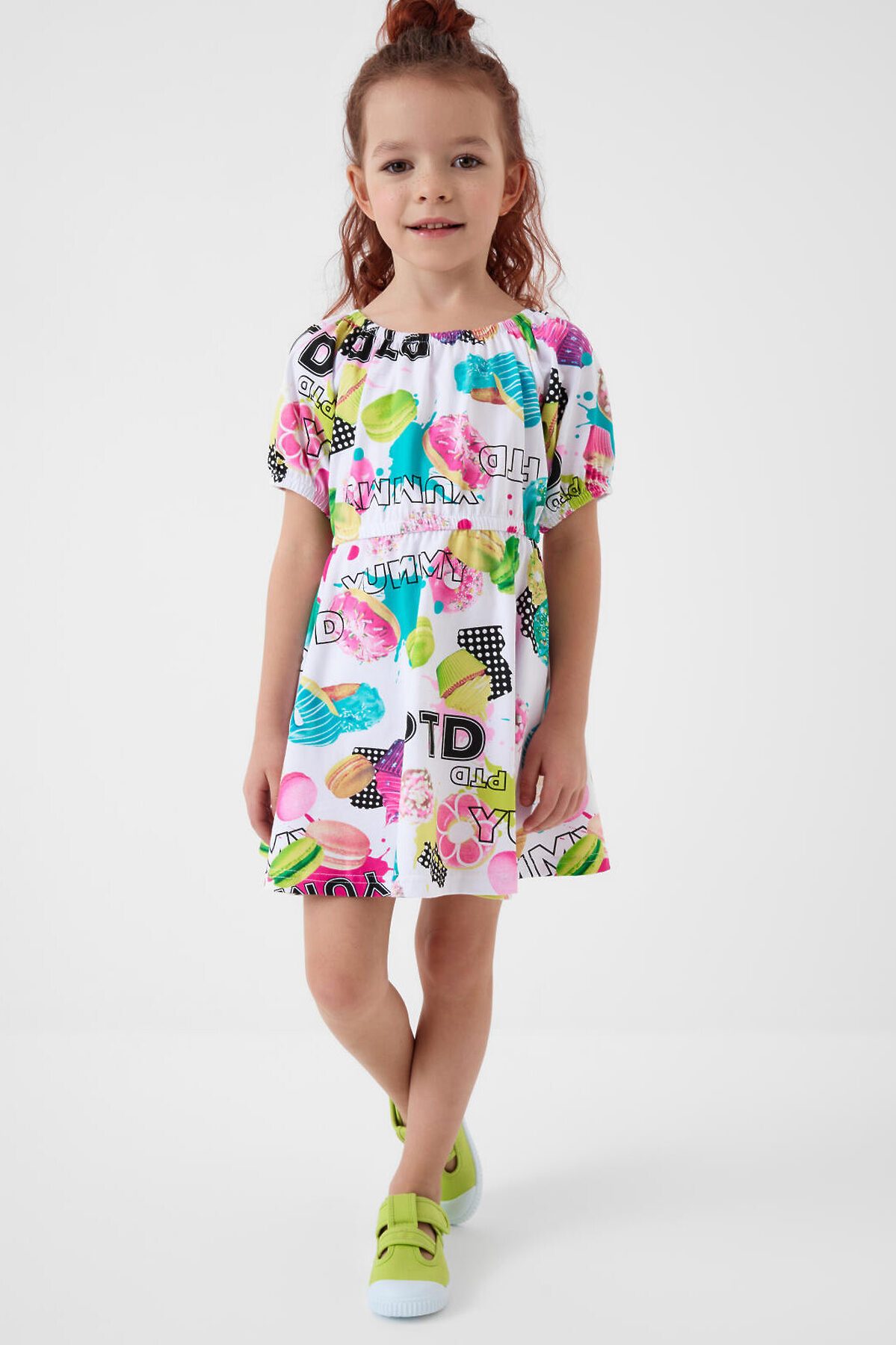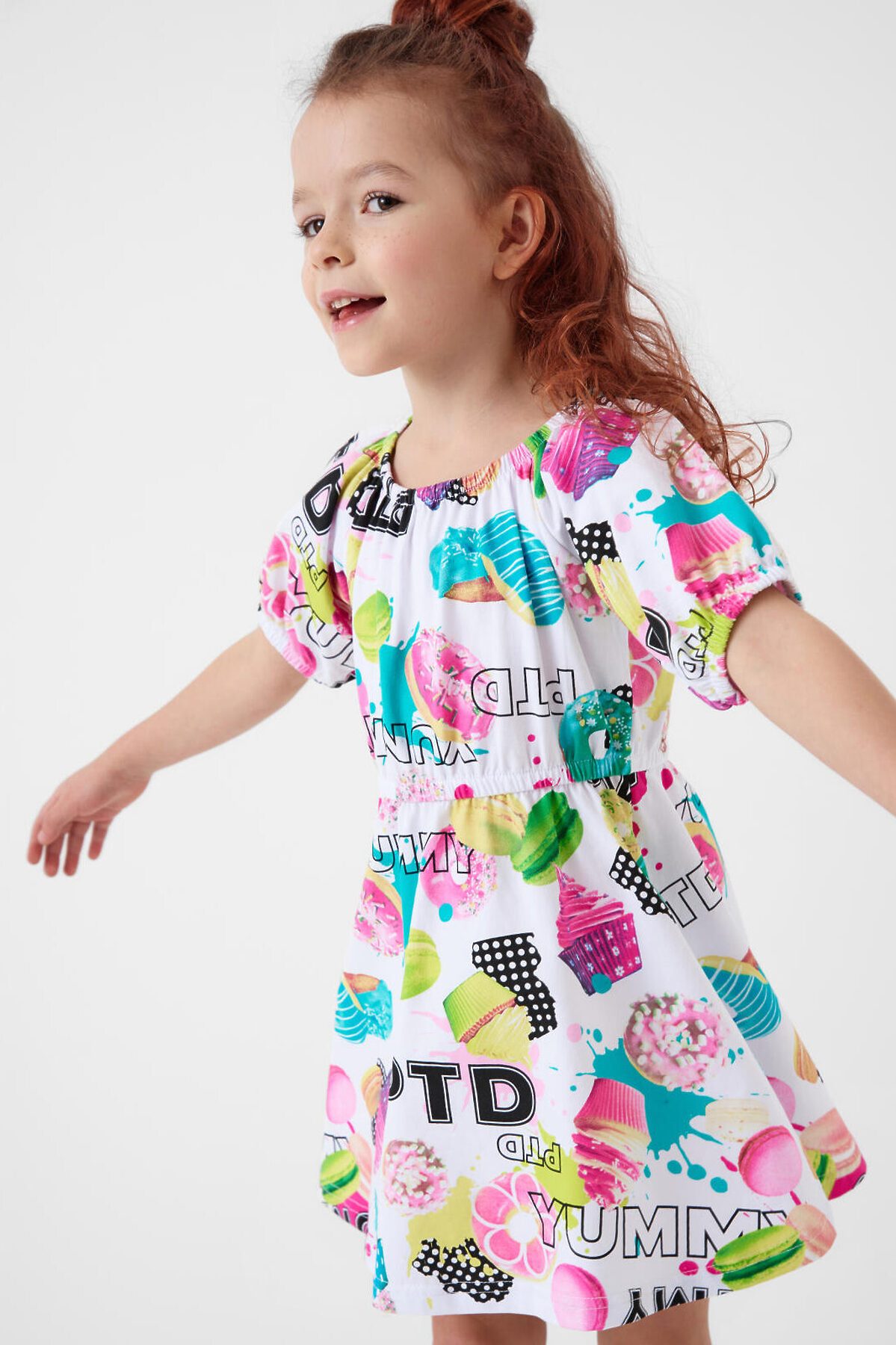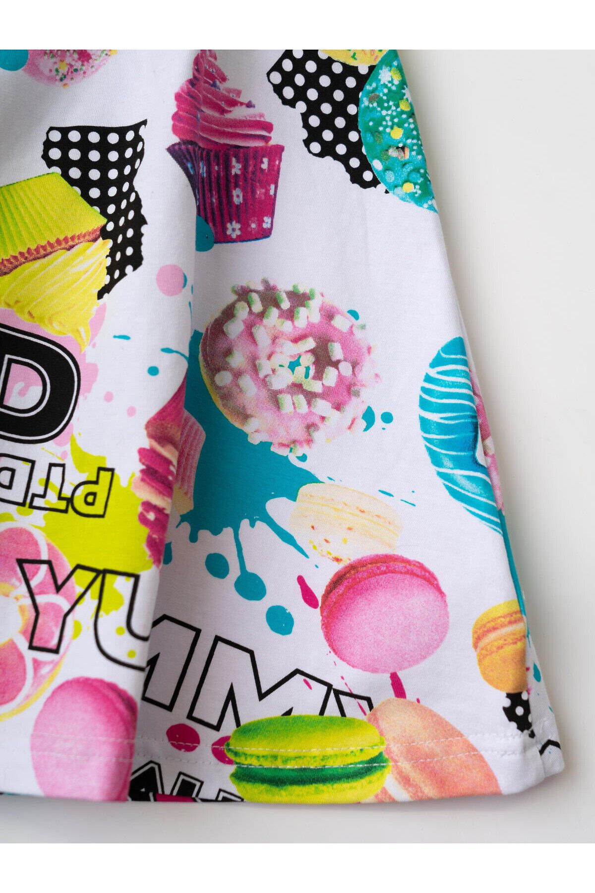 Яркое детское платье для девочки. Модель с короткими рукавами выполнено из хлопкового мягкого трикотажа джерси. Оно имеет свободный силуэт, приталено за счёт внутренней резинки на талии, что делает посадку комфортной. Рукава собраны по низу, а горловина аккуратно обработана эластичной резинкой. Платье украшено красочным принтом — с изображением капкейков, конфет, макарунов и ярких надписей. Платье длиной чуть выше колена.