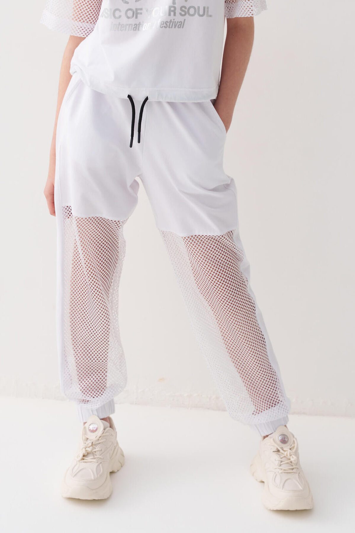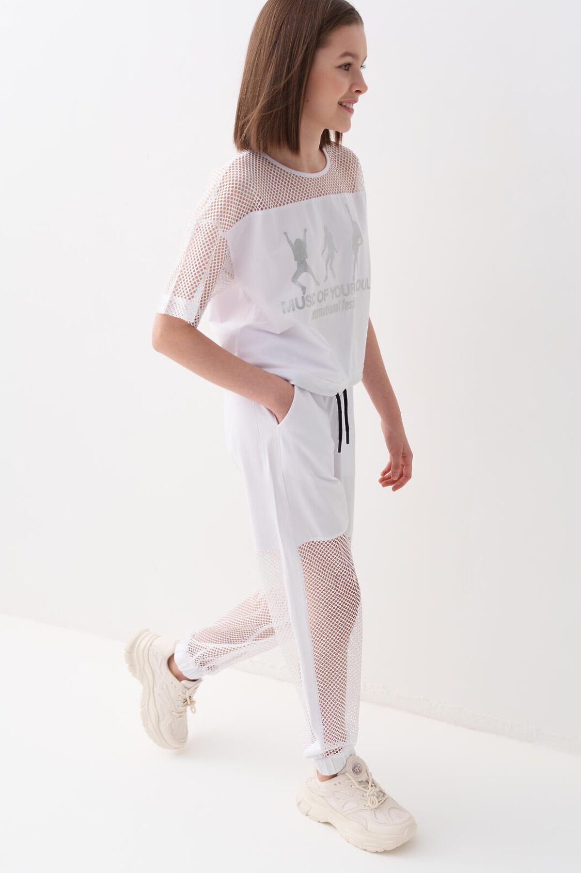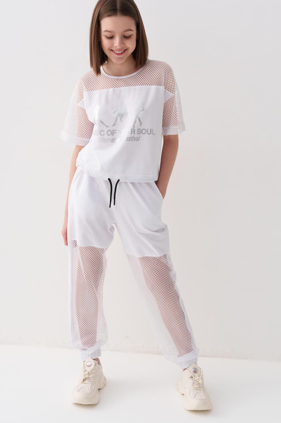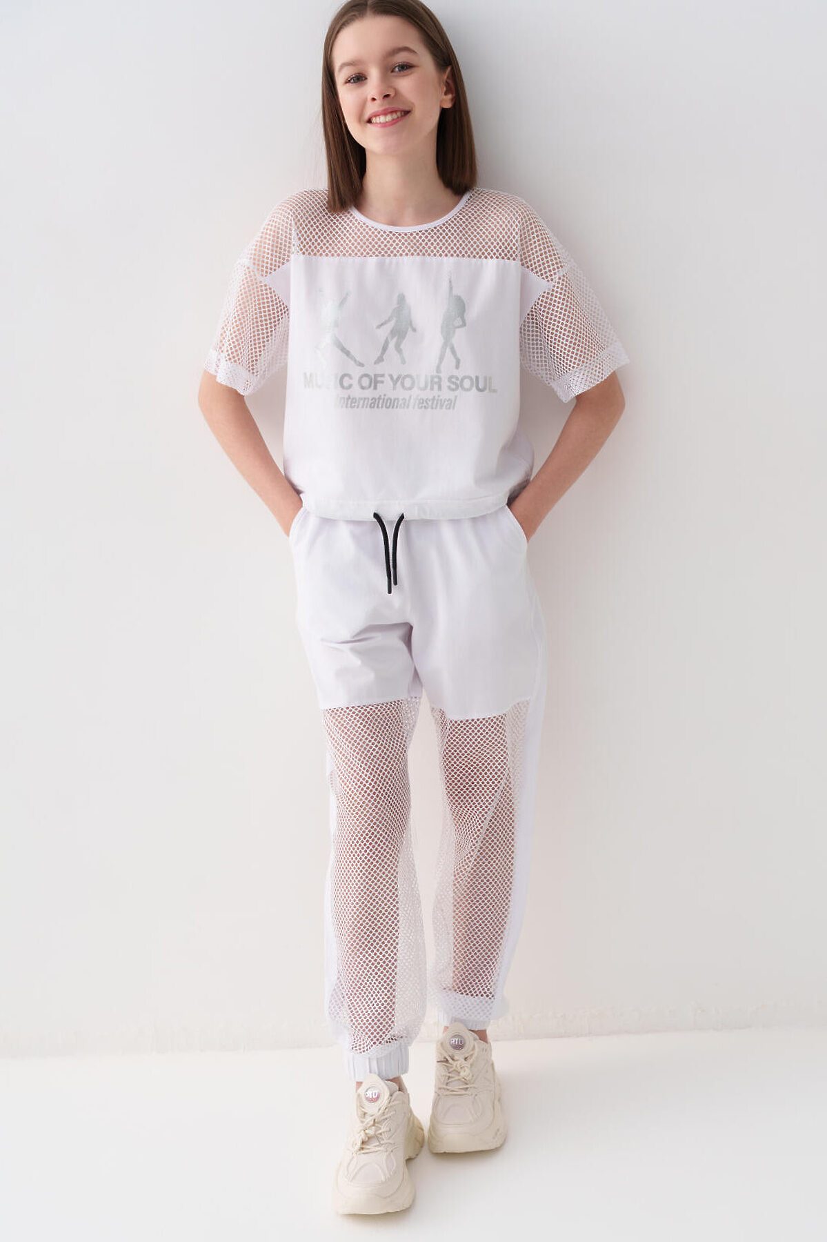 Стильные брюки для девочки подростка. Верхняя часть выполнена из плотного хлопкового трикотажа, а нижняя — из легкой прозрачной сетки, создающей модный контраст и эффект "двойного слоя". Брюки имеют эластичный пояс со шнурком и удобные боковые карманы. Низ брючин собран на резинку, благодаря чему брюки хорошо сидят по фигуре. По бокам и передней части расположены лампасы, добавляющие спортивный акцент.