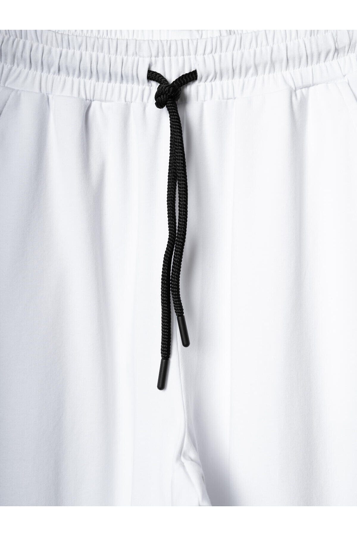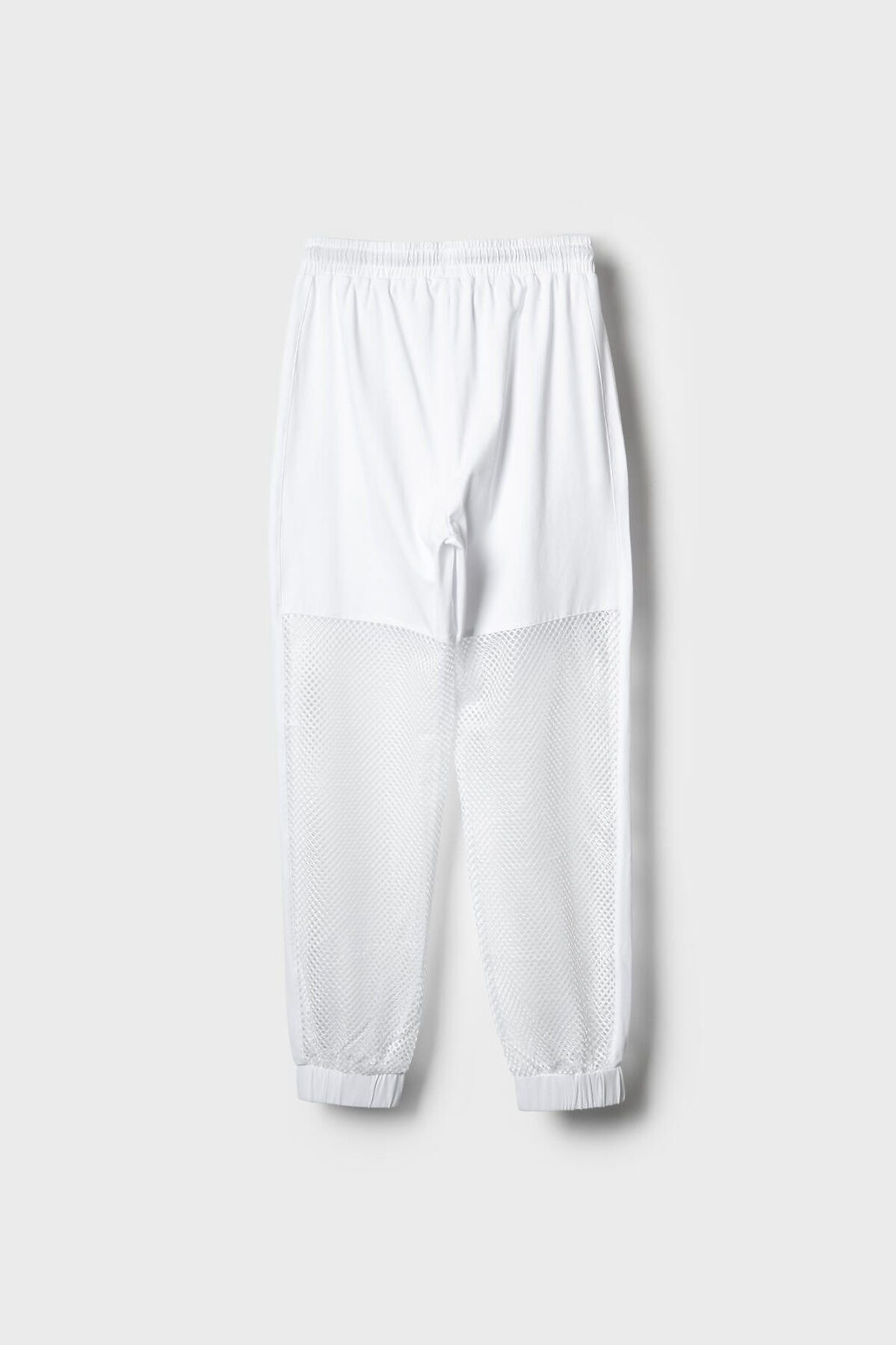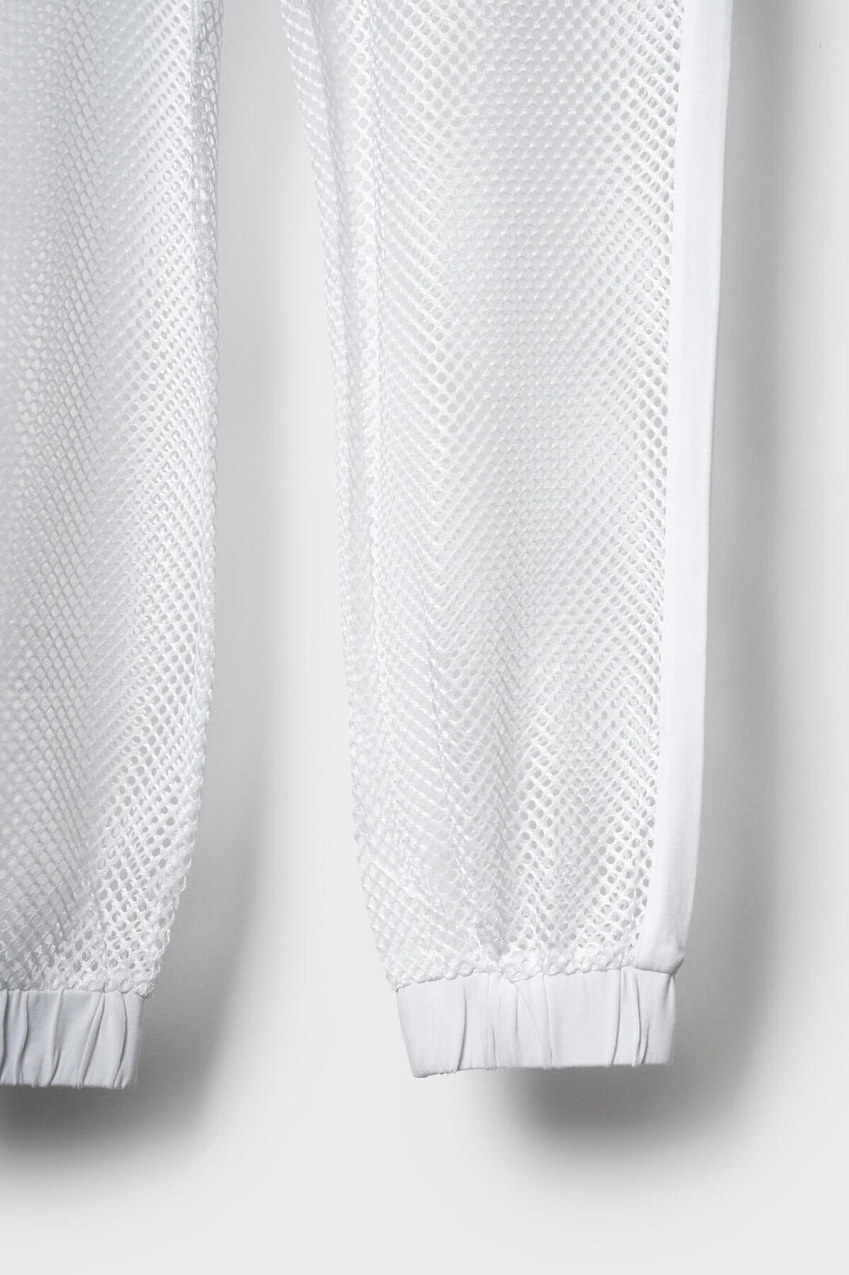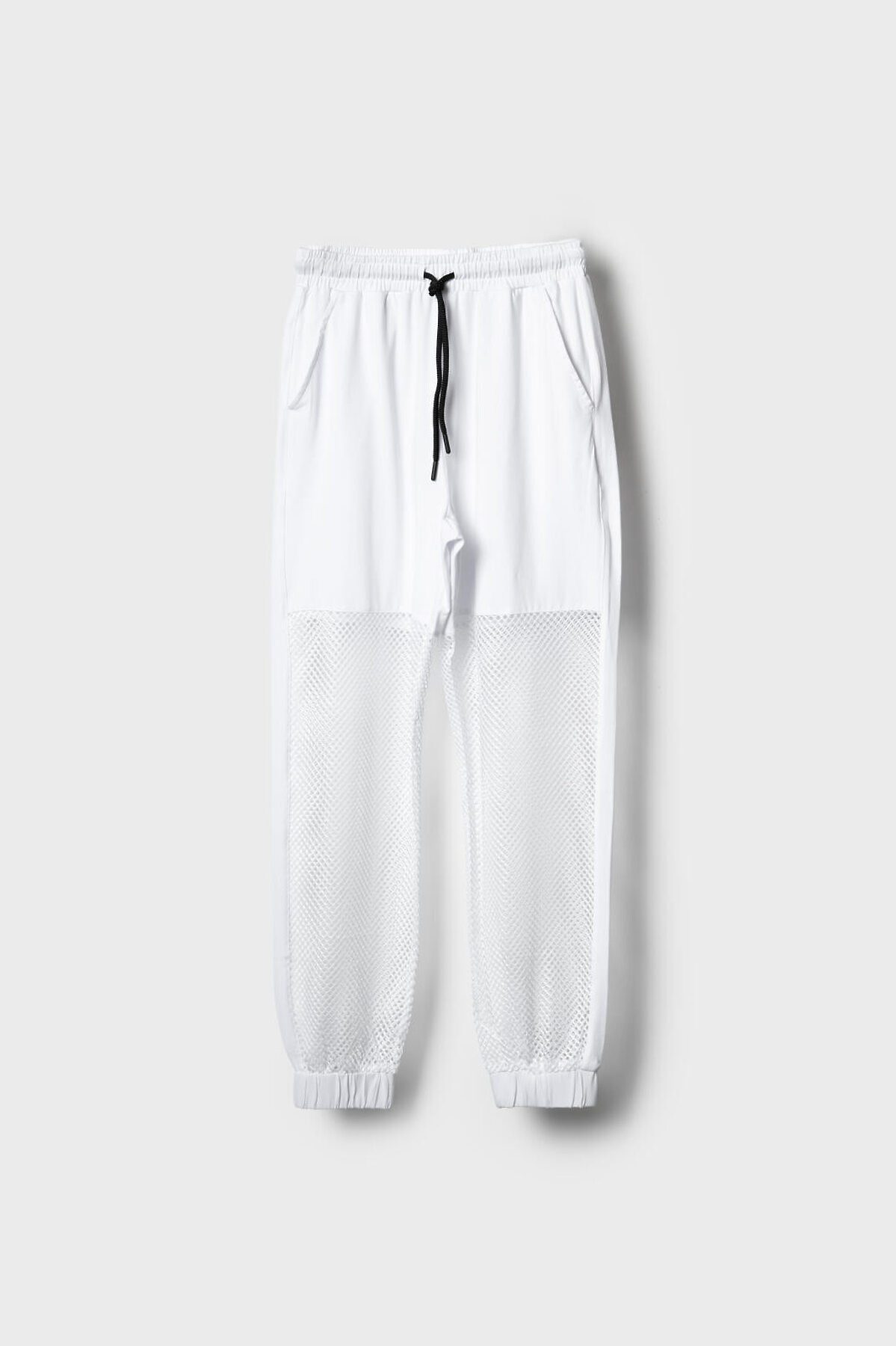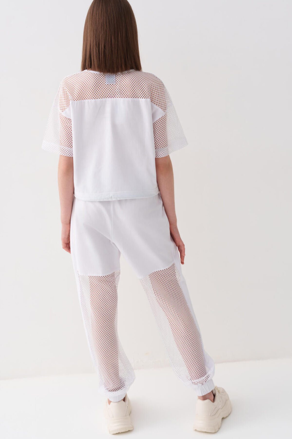 Стильные брюки для девочки подростка. Верхняя часть выполнена из плотного хлопкового трикотажа, а нижняя — из легкой прозрачной сетки, создающей модный контраст и эффект "двойного слоя". Брюки имеют эластичный пояс со шнурком и удобные боковые карманы. Низ брючин собран на резинку, благодаря чему брюки хорошо сидят по фигуре. По бокам и передней части расположены лампасы, добавляющие спортивный акцент.