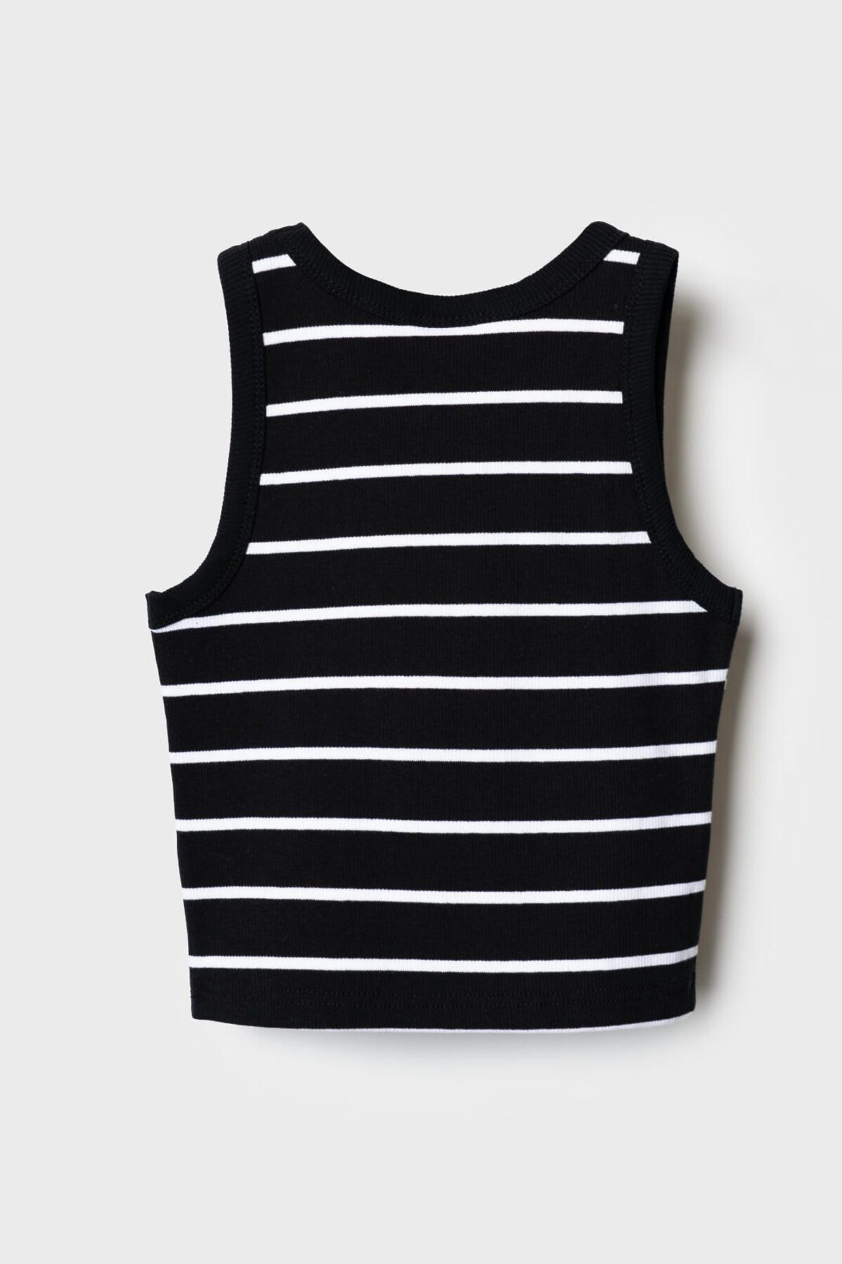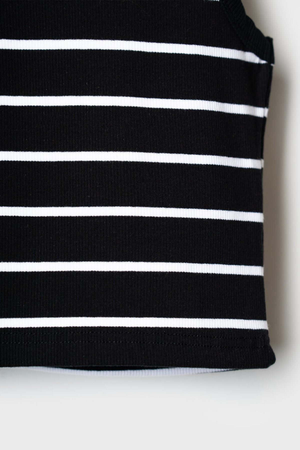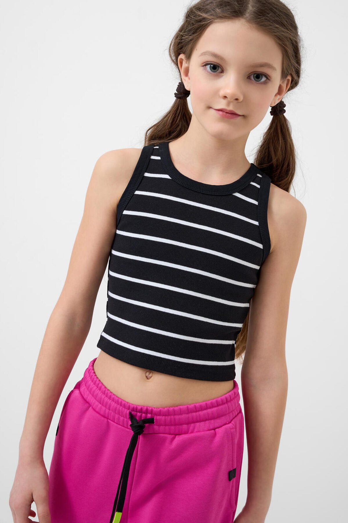Майка укороченная в полоску для девочки подростка. Модель прямого силуэта, без рукавов, с круглой горловиной. Выполнена из хлопкового трикотажа в рубчик.