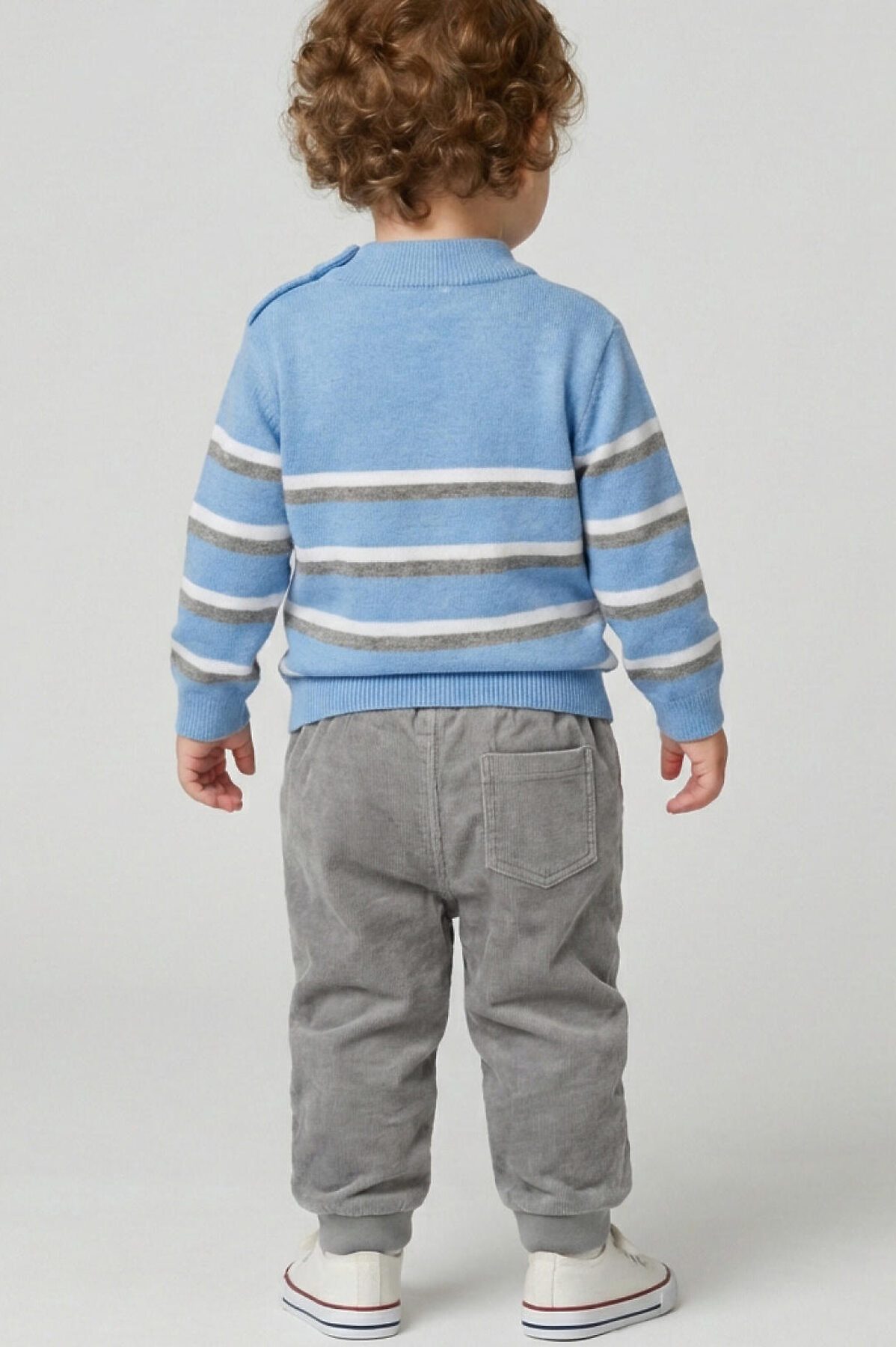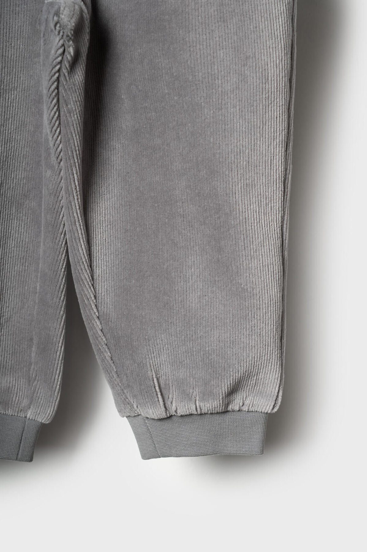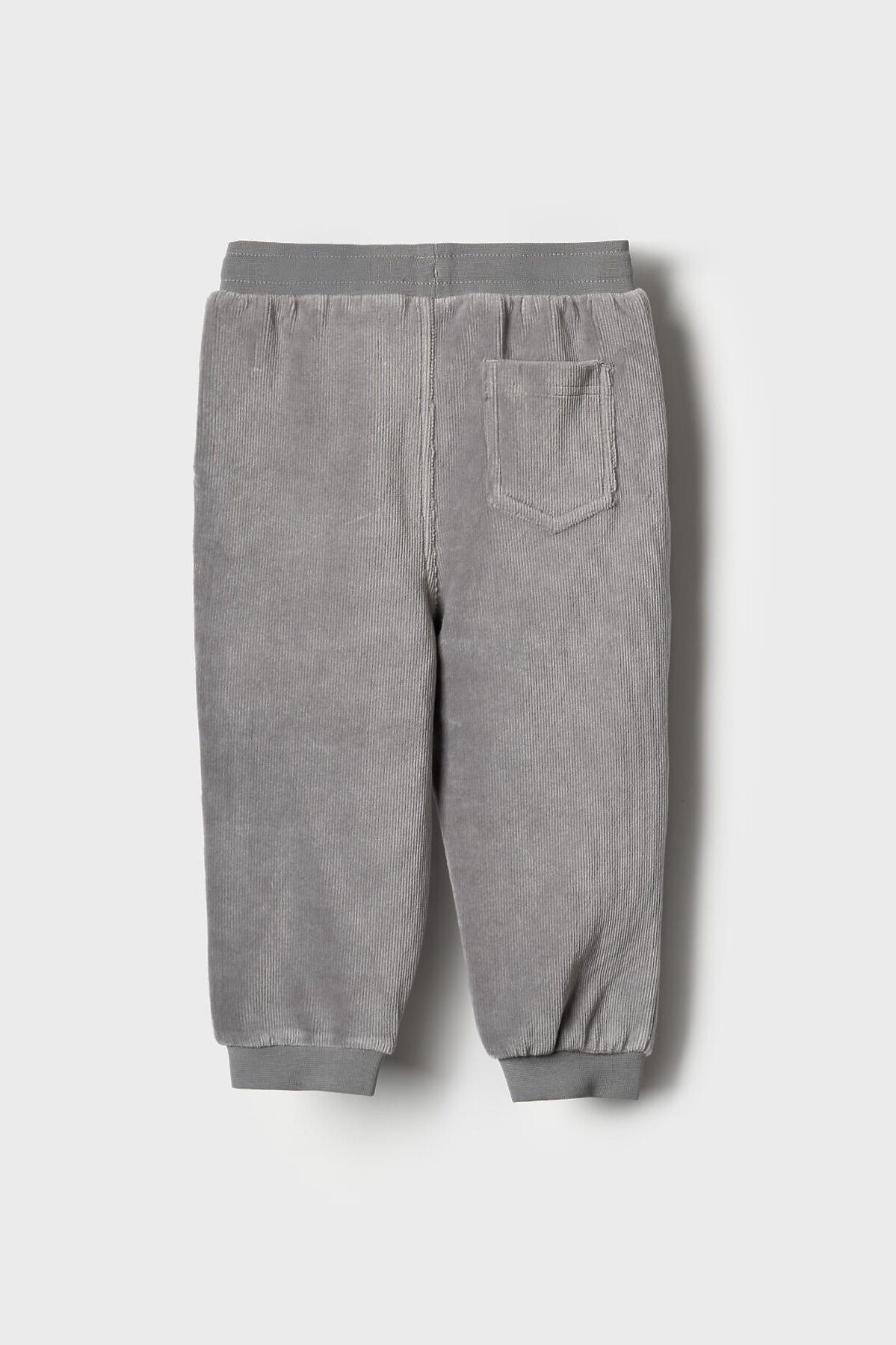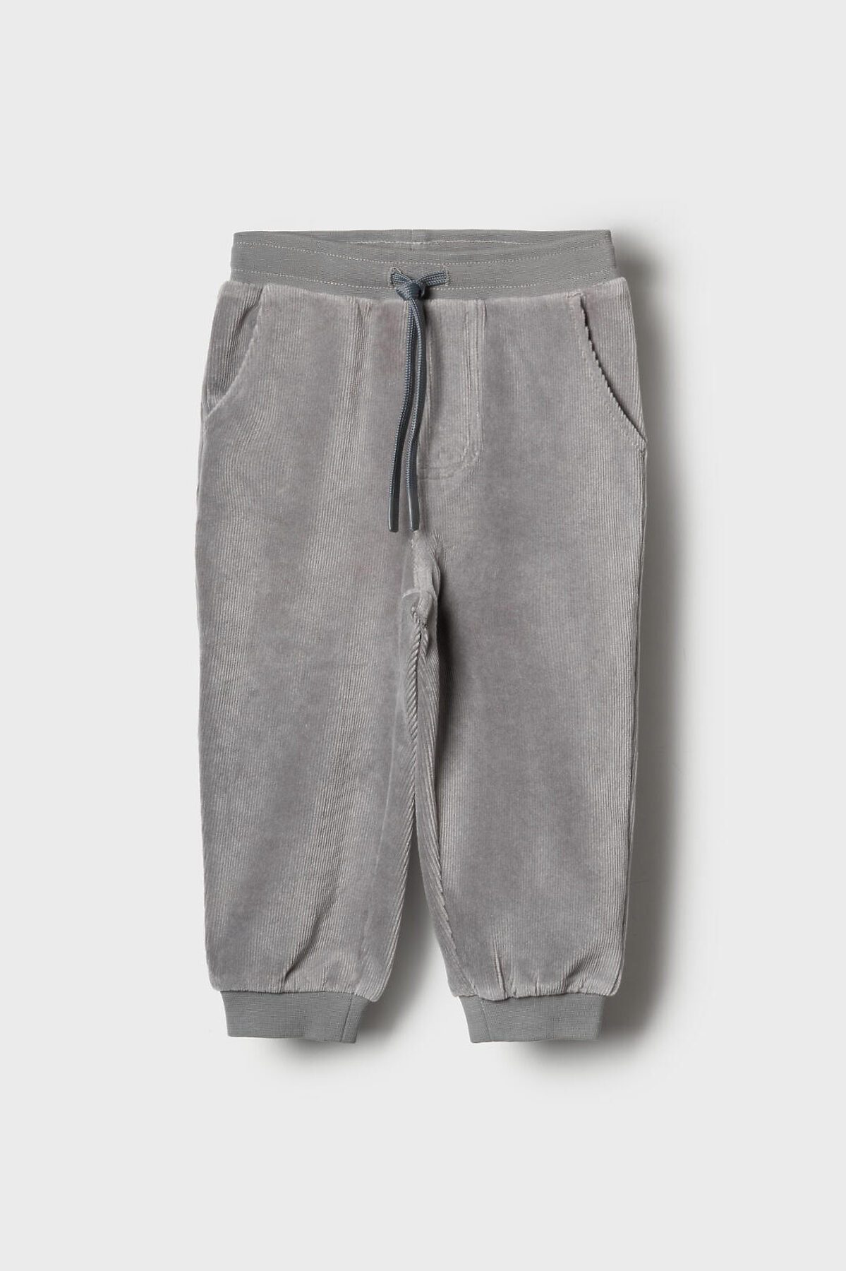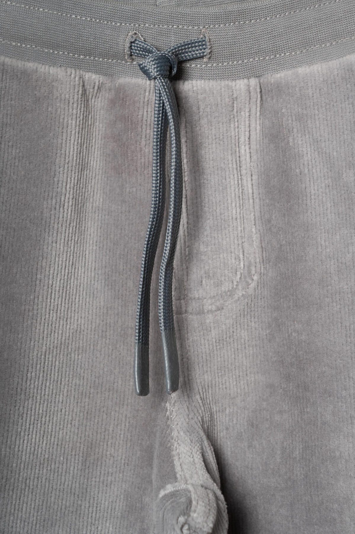 Детские брюки для мальчика. Модель выполнена из хлопкового велюрового трикотажа. Оснащены эластичным поясом с декоративным шнуром и манжетами по низу штанин, что обеспечивает хорошую посадку. Спереди расположены два удобных боковых кармана, а сзади — один накладной карман.