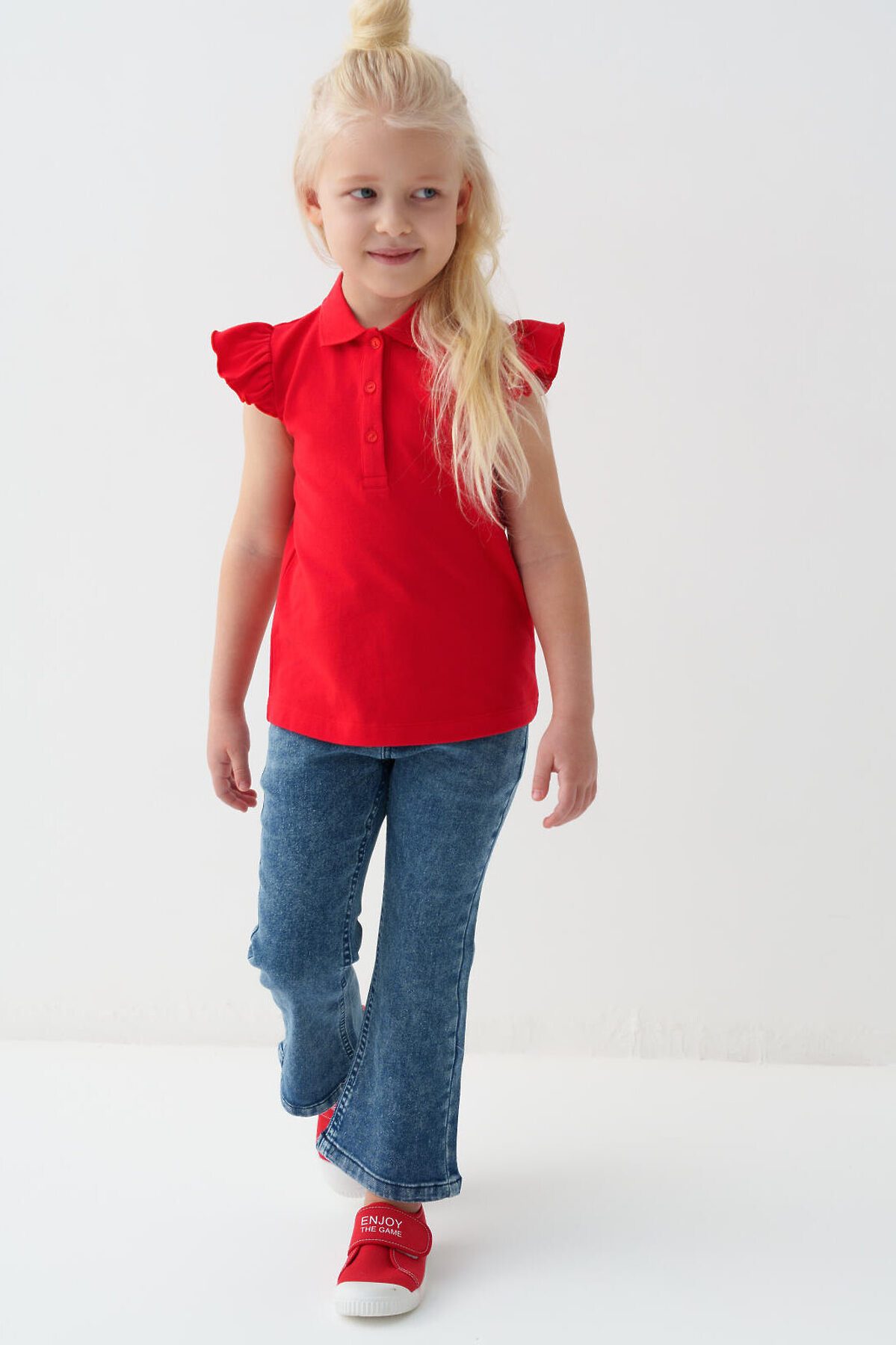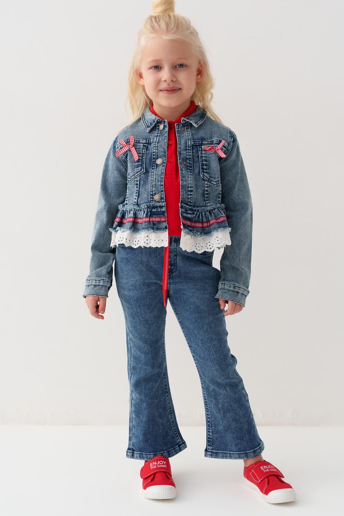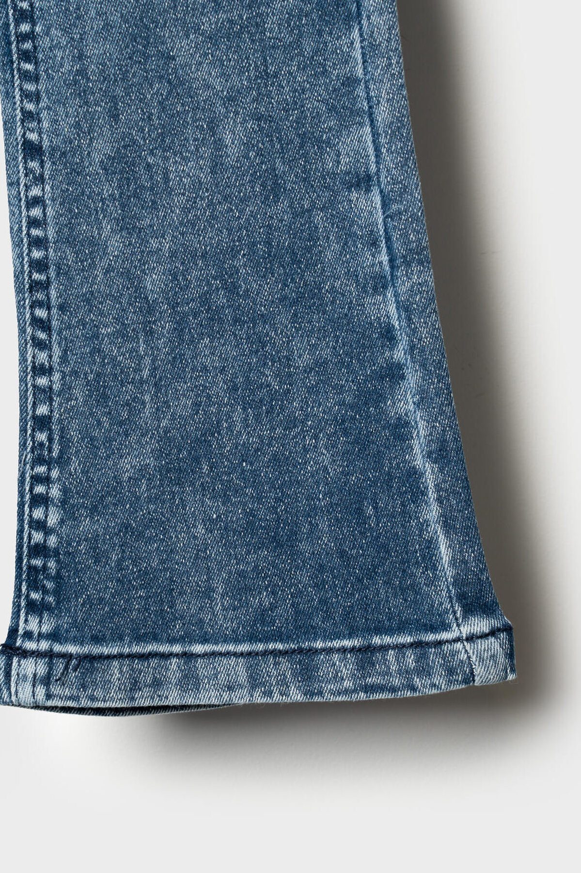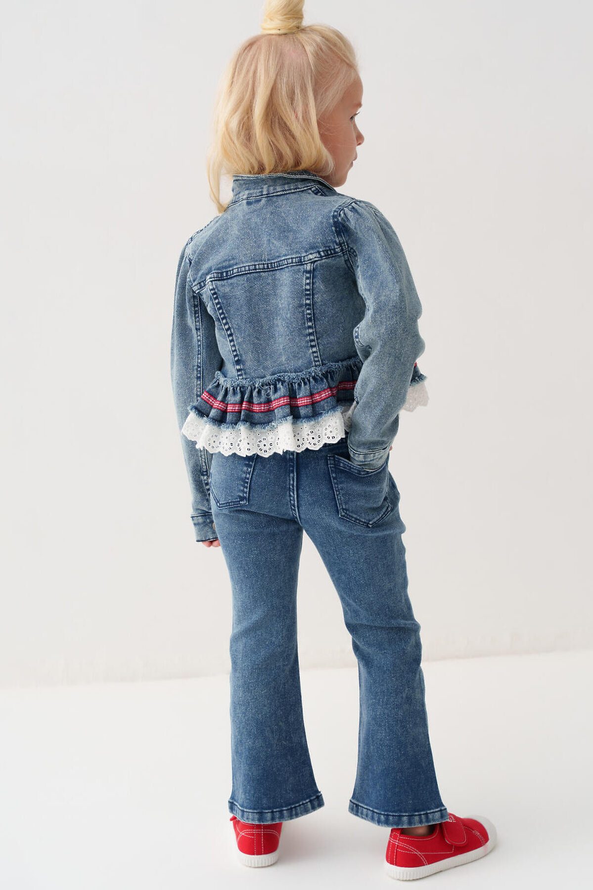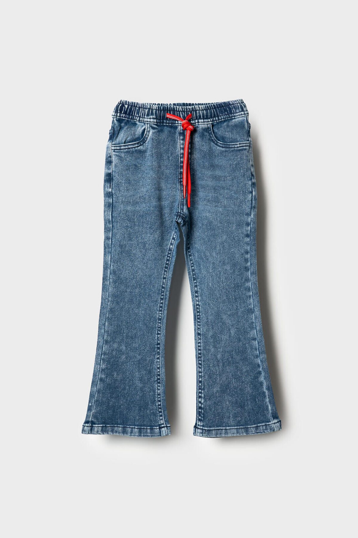 Детские джинсы клеш для девочки. Пояс на резинке с регулирующим шнурком. Спереди и сзади расположены карманы. Благодаря эластичному поясу они легко надеваются и комфортны в носке.