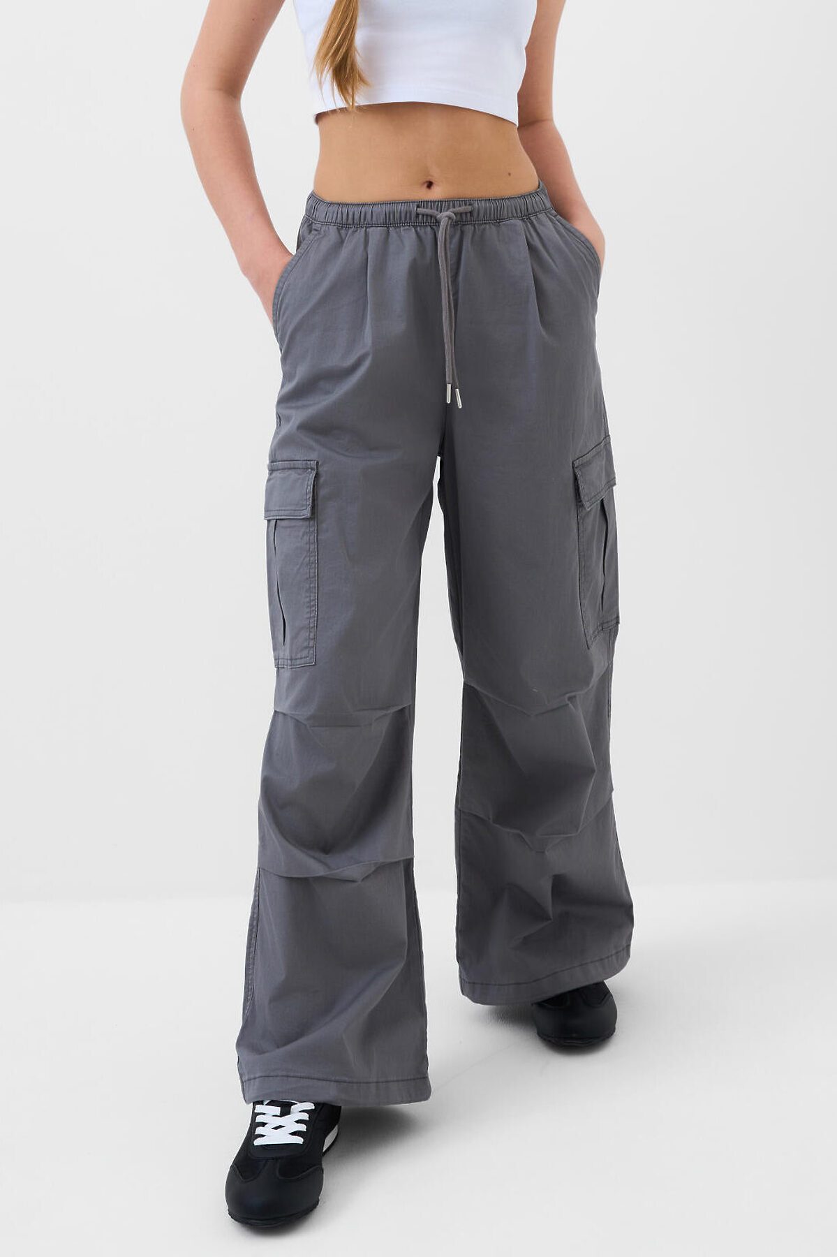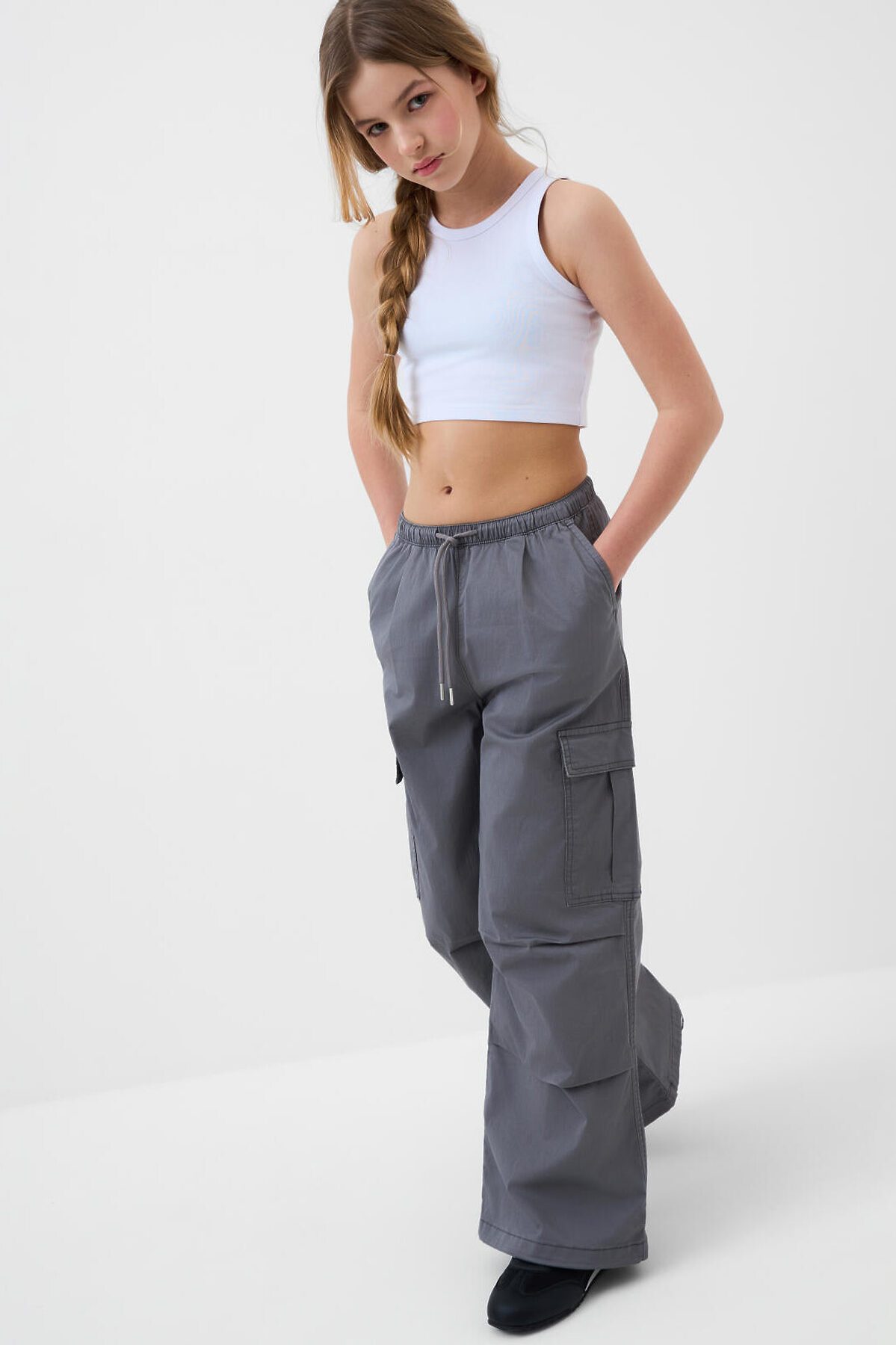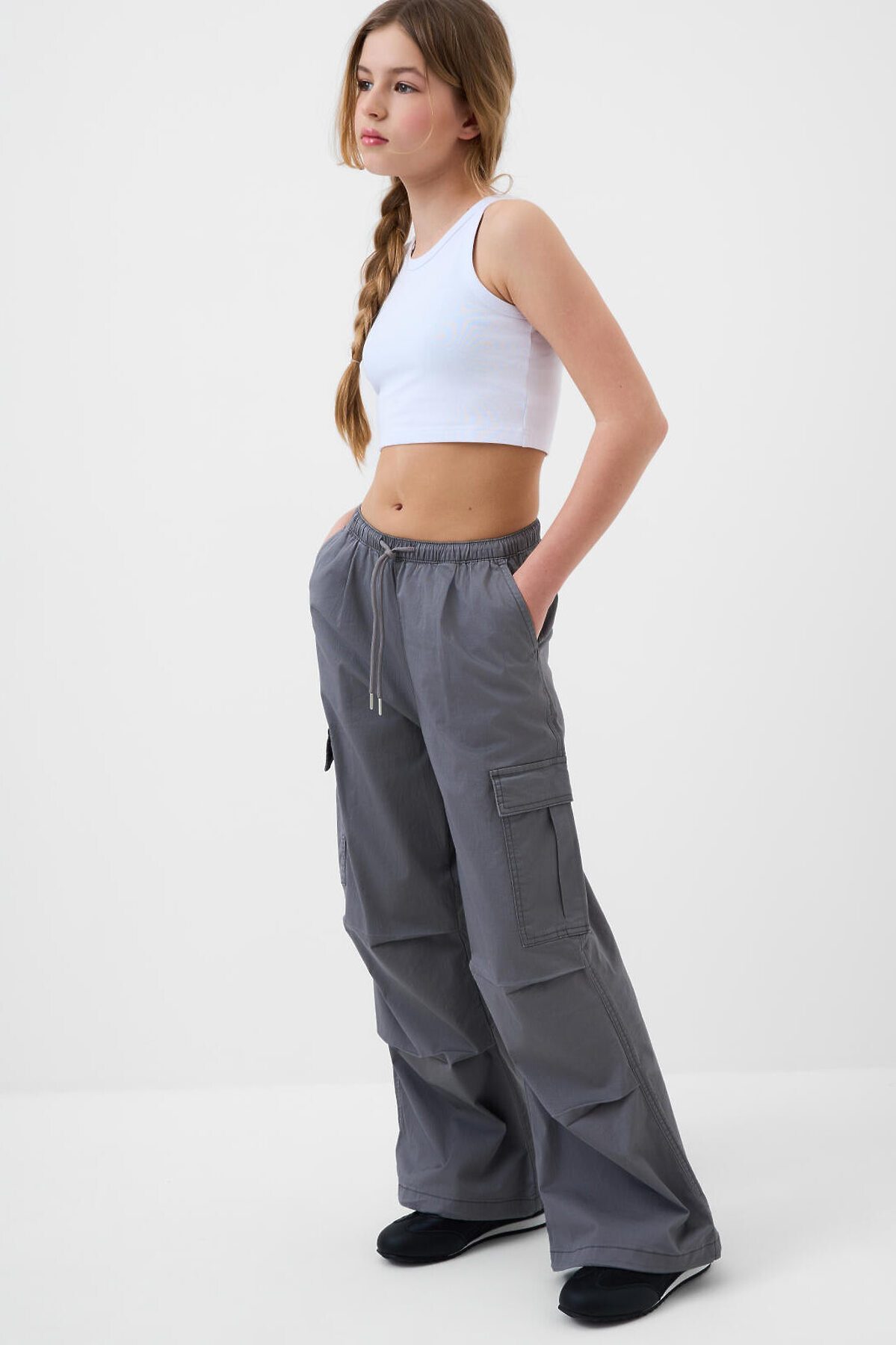 Брюки карго для девочки подростка. Выполнены из плотного хлопкового твилла. Модель имеет заниженную посадку и свободный крой с утяжками внизу, которые позволяют регулировать ширину брючин. Пояс на резинке с дополнительной регулировкой шнуром. На бедрах расположены накладные карманы на липучке, а также боковые карманы.