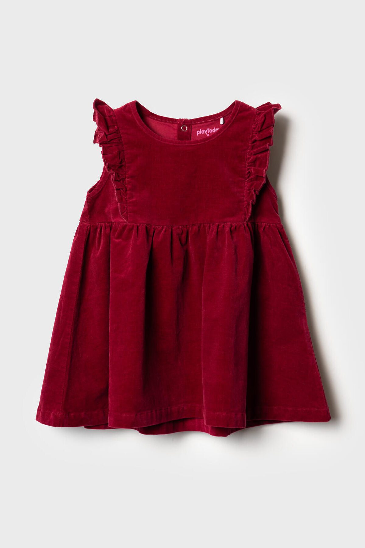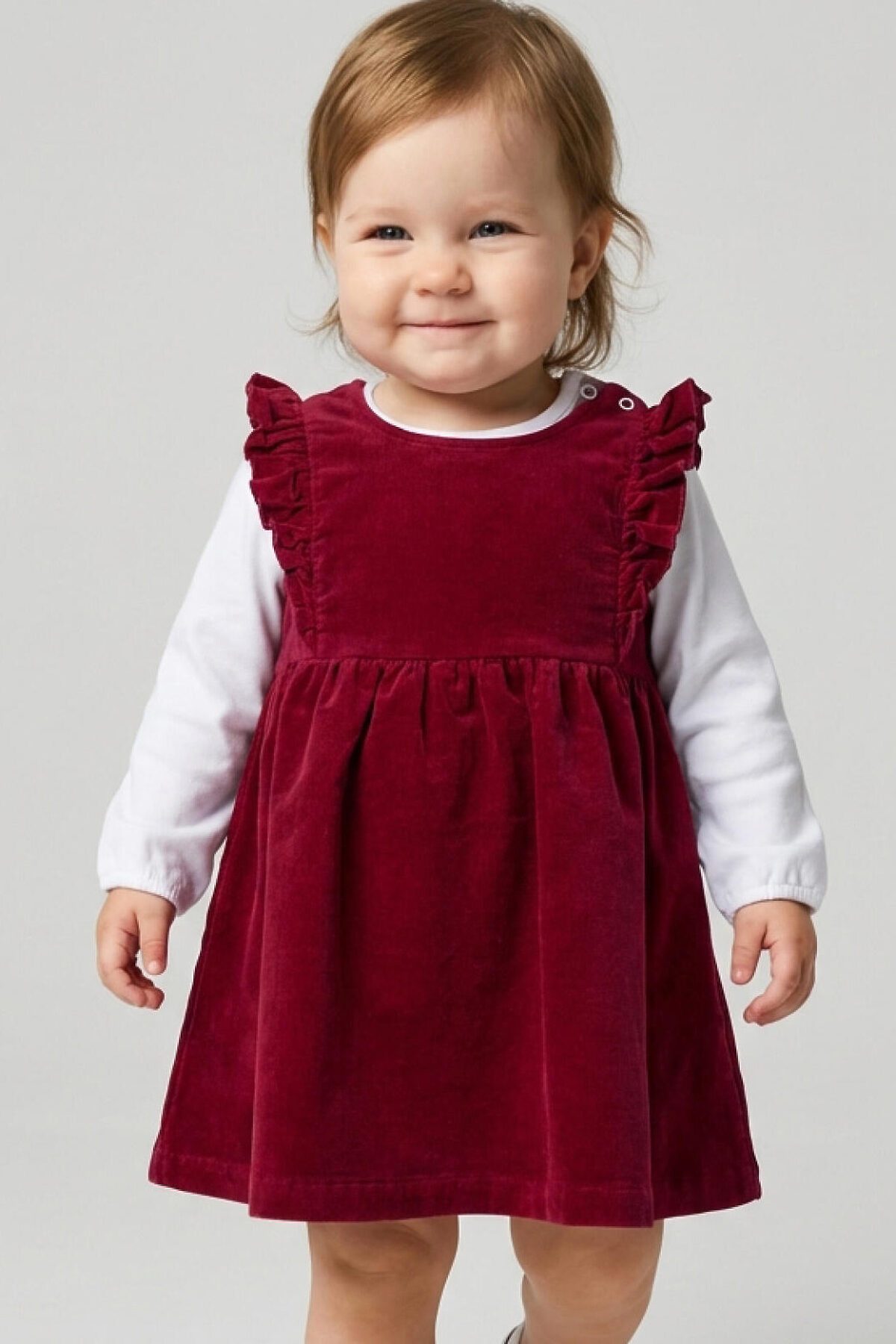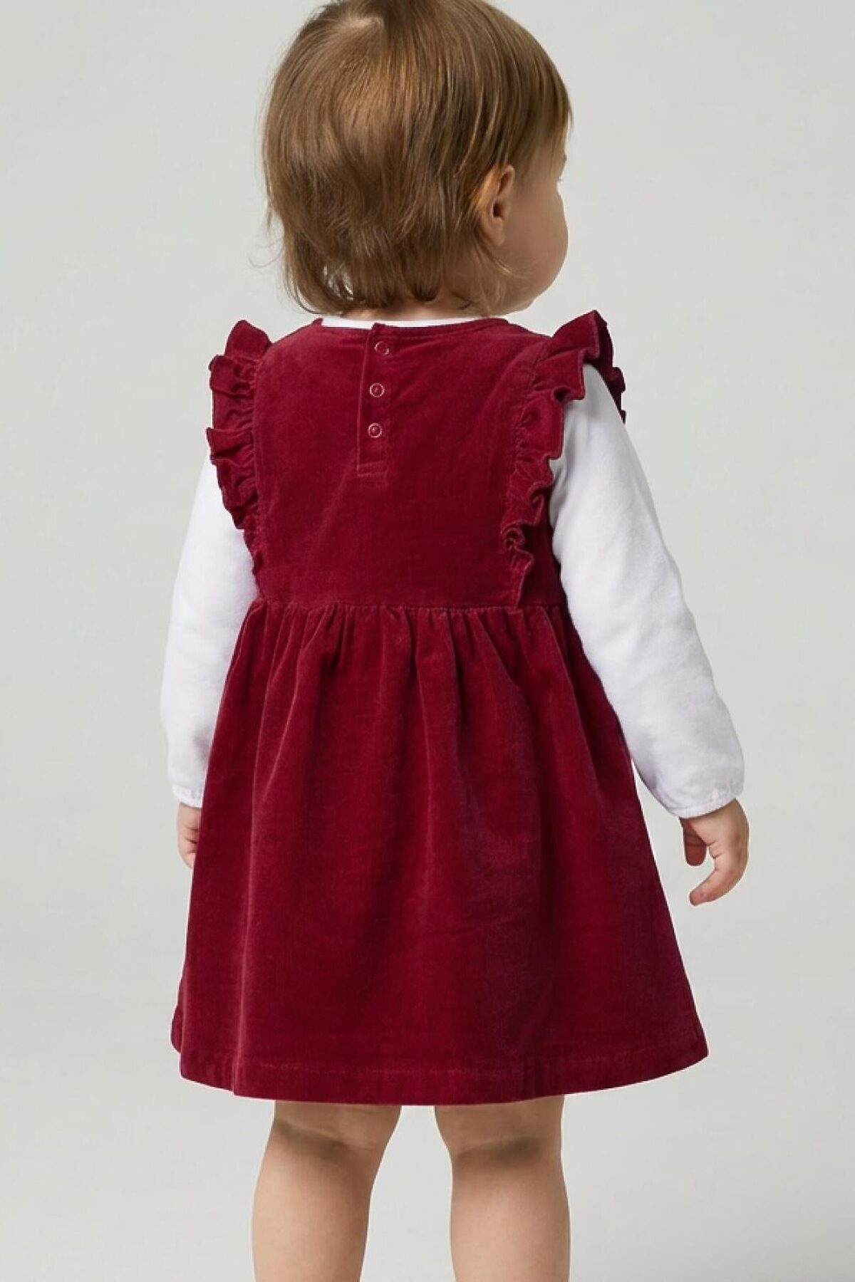 Детский комплект для девочки. Состоит из вельветового сарафана и хлопкового лонгслива. Платье с рукавами-крылышками и застежкой на кнопки сзади. Лонгслив имеет застежку на кнопки на плече для удобного переодевания. Манжеты на мягкой резинке.