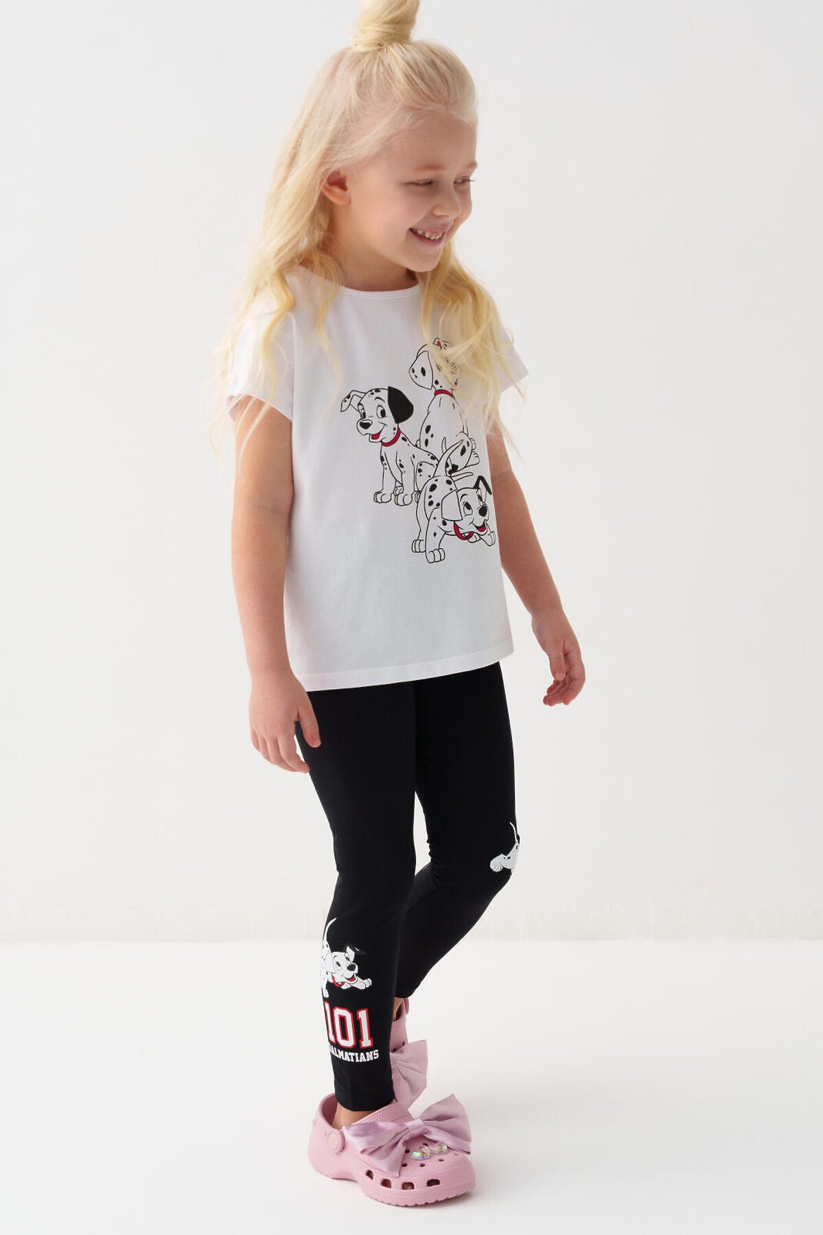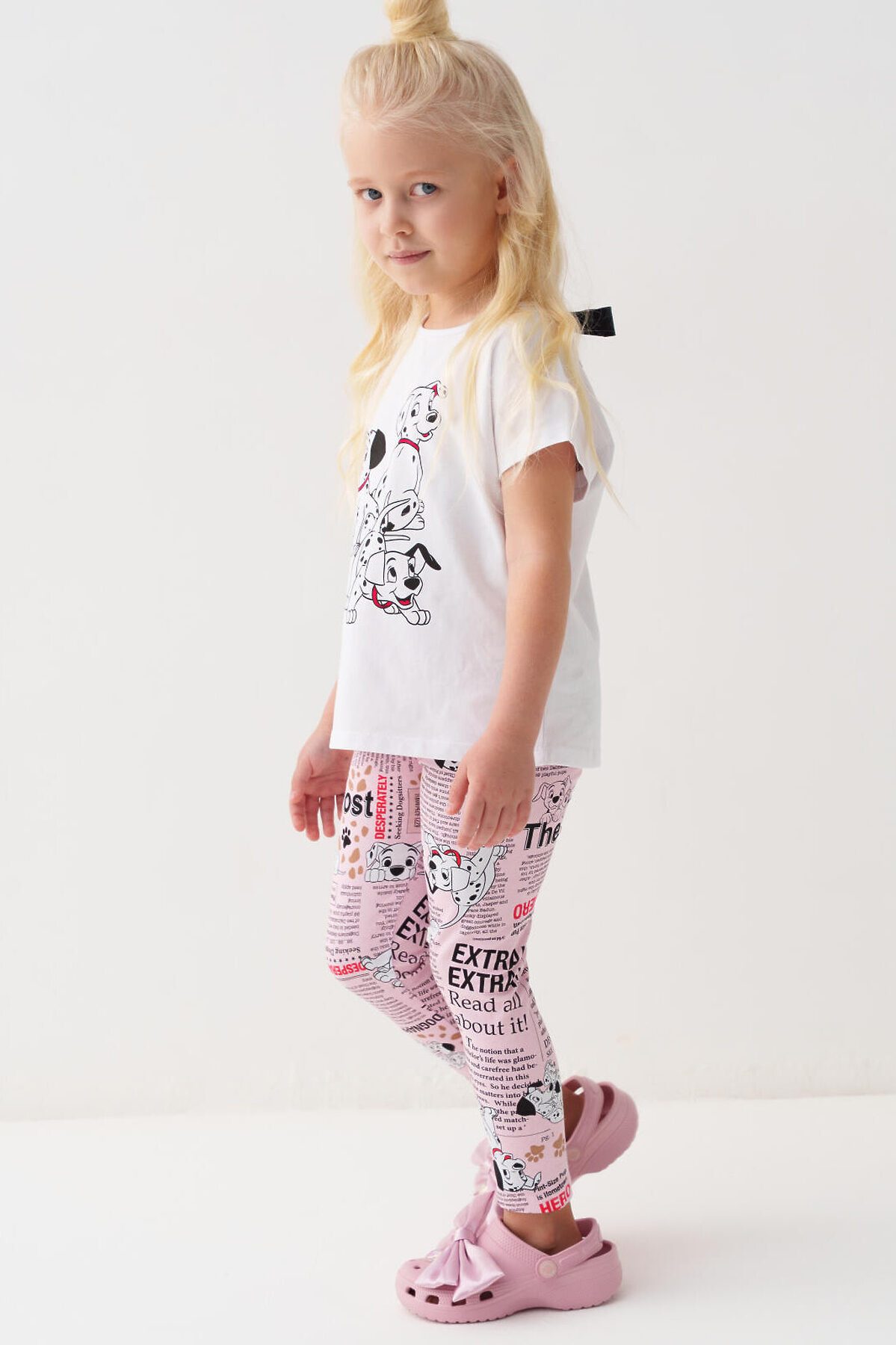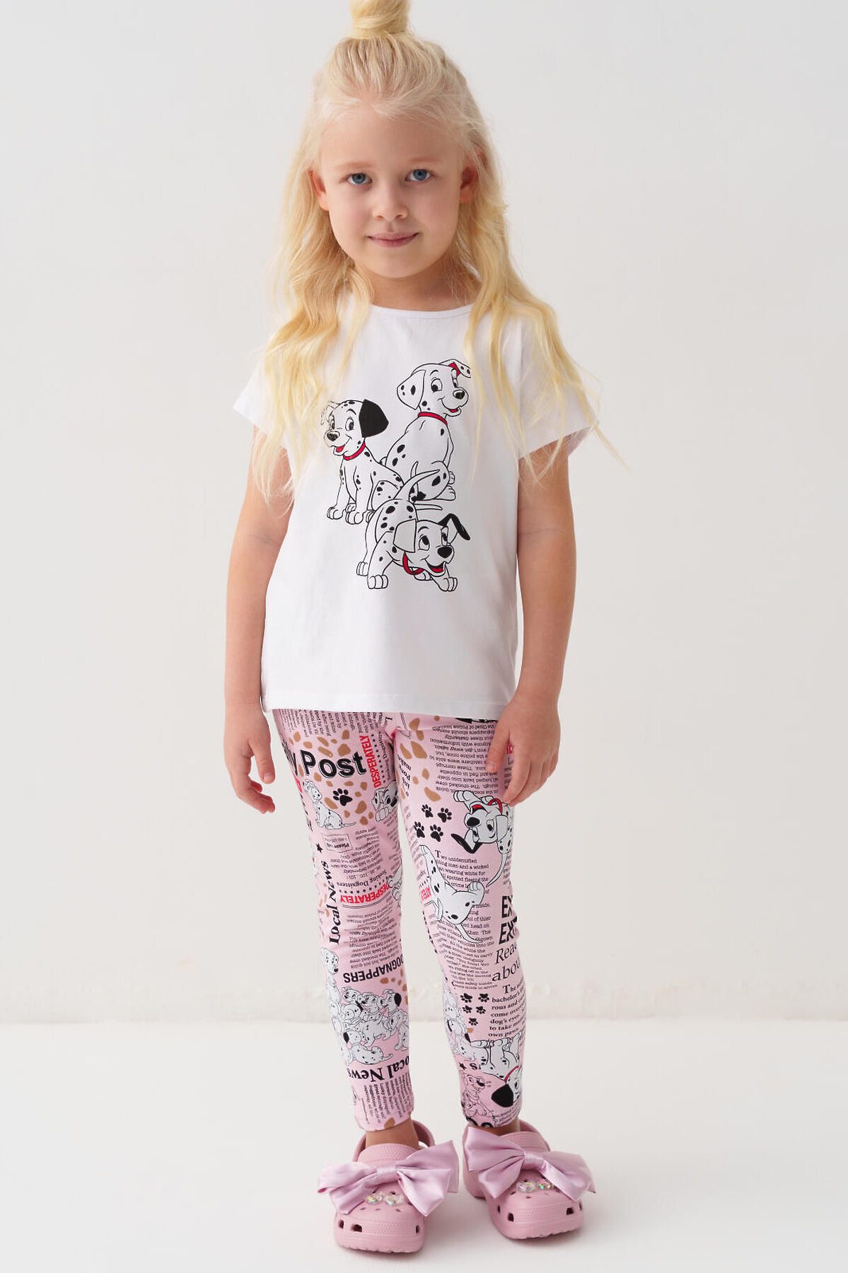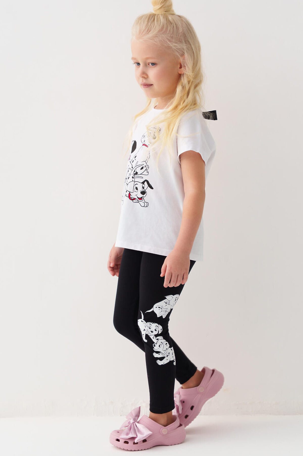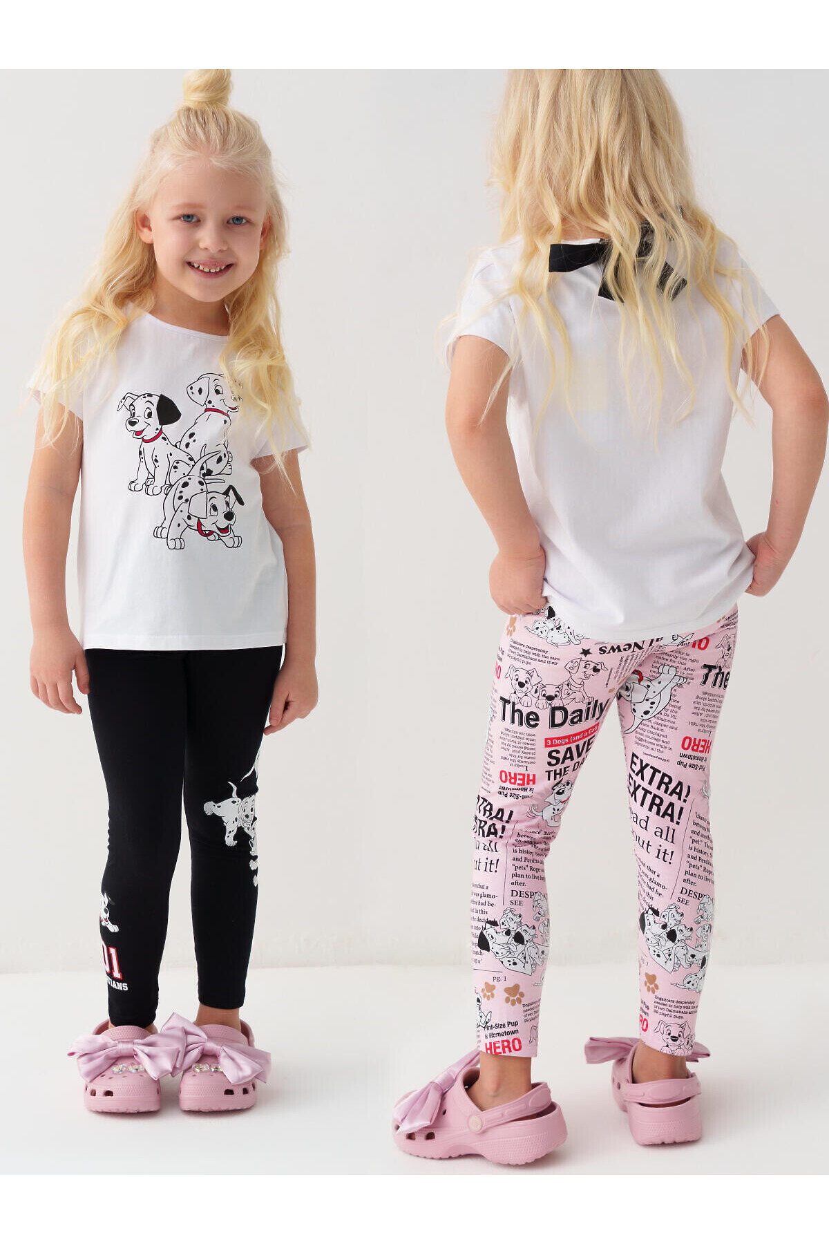 Набор детских легинсов для девочки. Комплект состоит из двух пар длинных легинсов. Принт с героями любимого мультфильма "101 далматинец". Обе модели имеют высокую посадку и эластичный пояс, который хорошо фиксирует изделие на талии. Материал - мягкий, хлопковый трикотаж.
