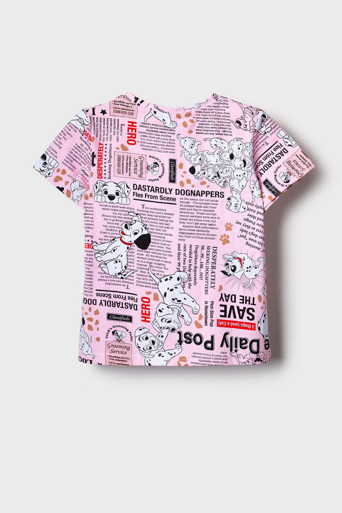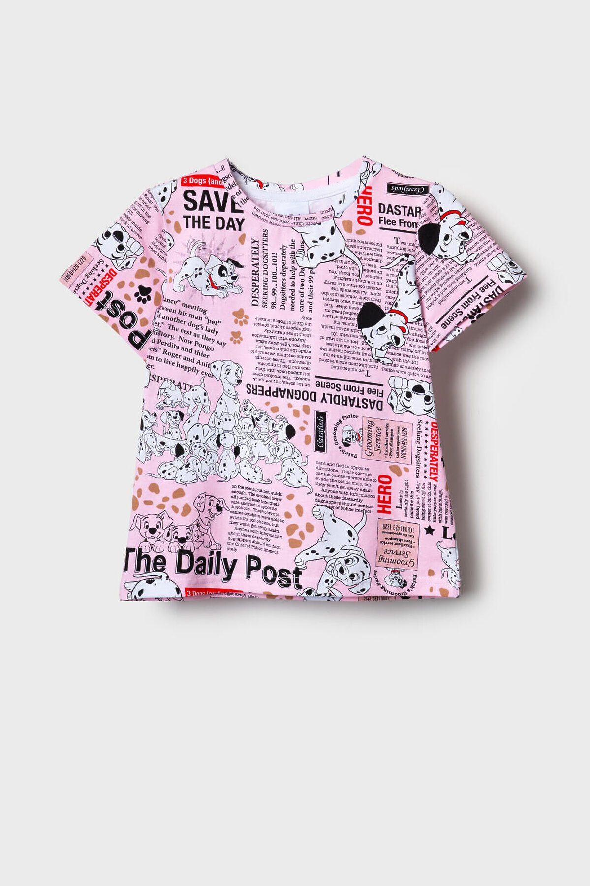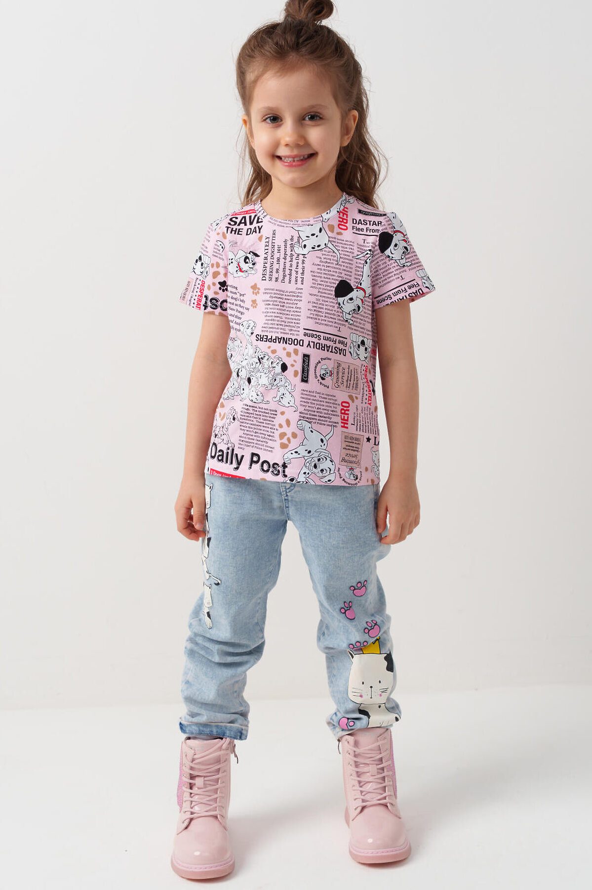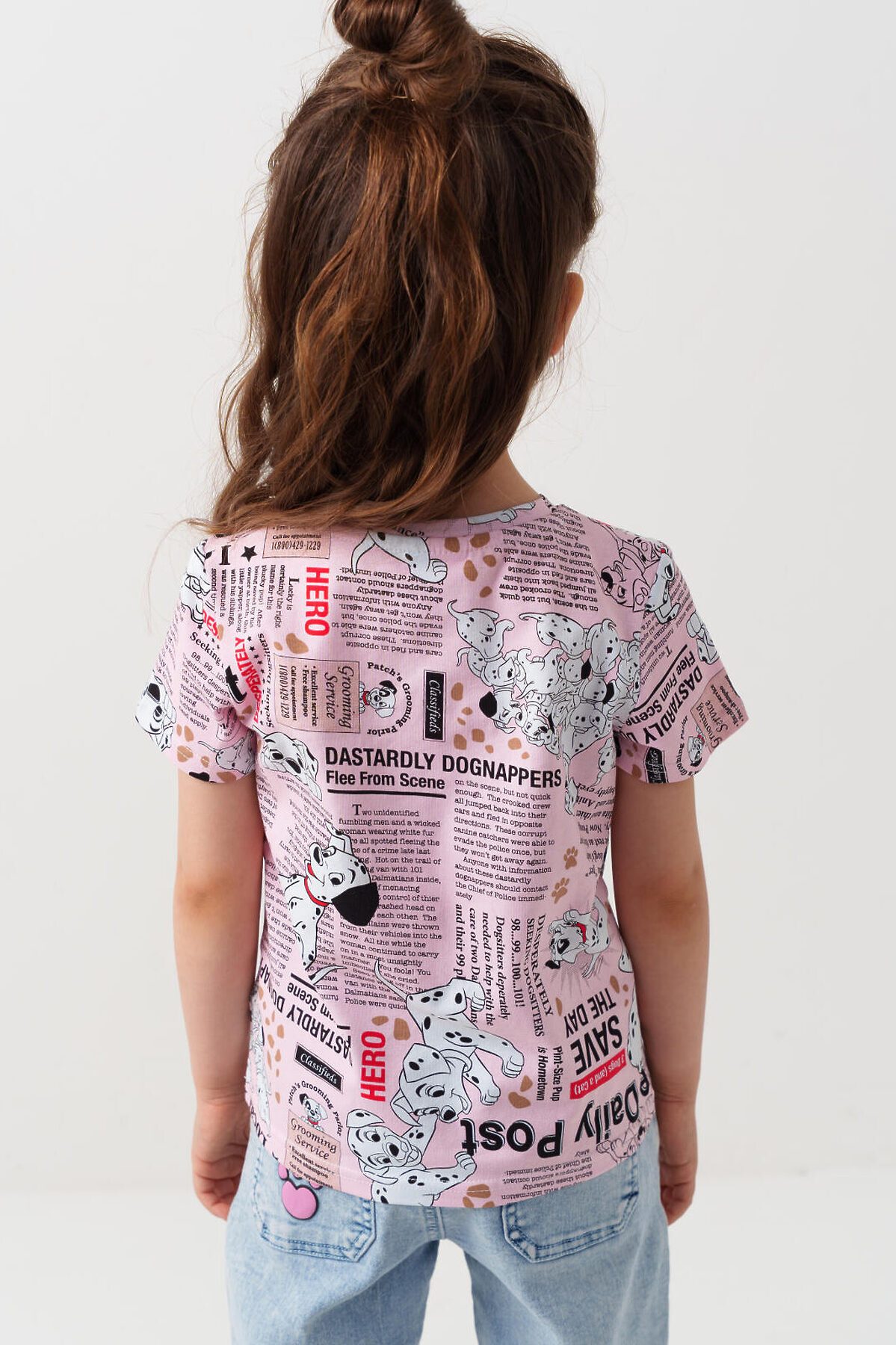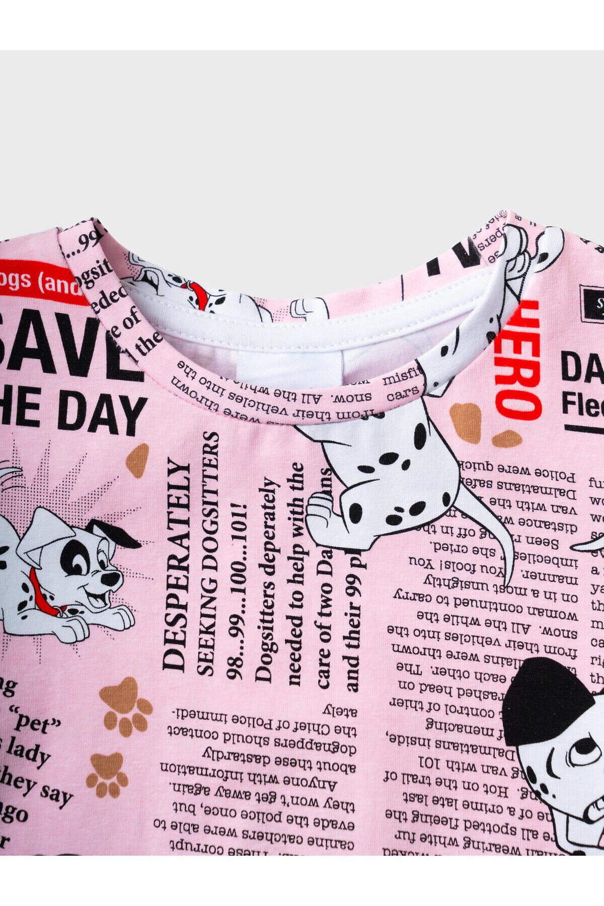 Детская футболка для девочки. Модель прямого кроя, выполнена из эластичного хлопкового трикотажа джерси. Красочный принт с любимыми героями из мультфильма "101 далматинец". Горловина круглая.