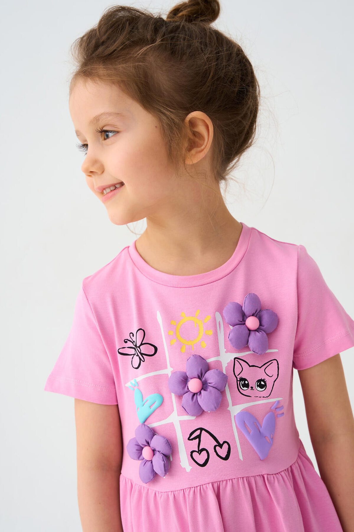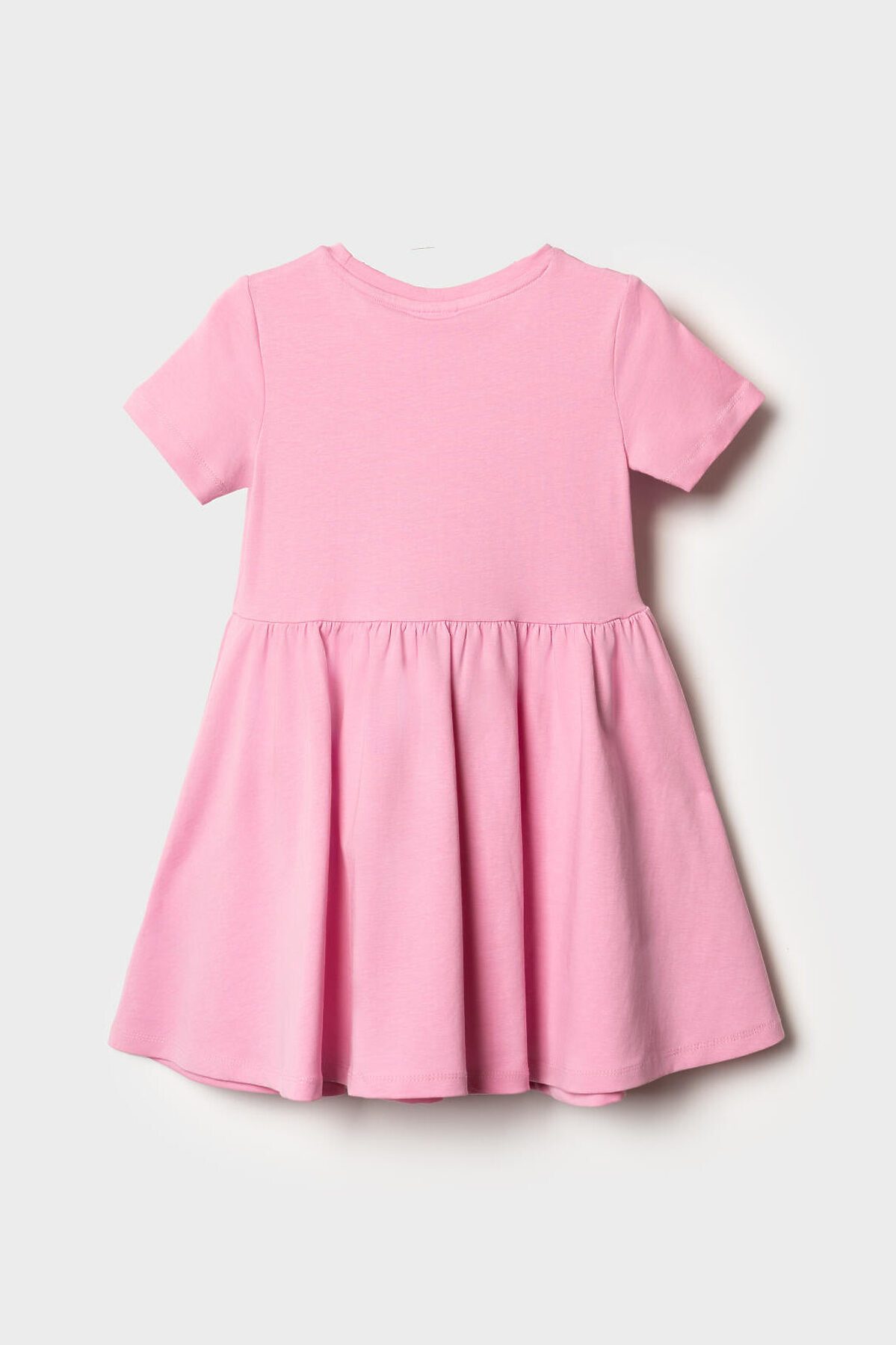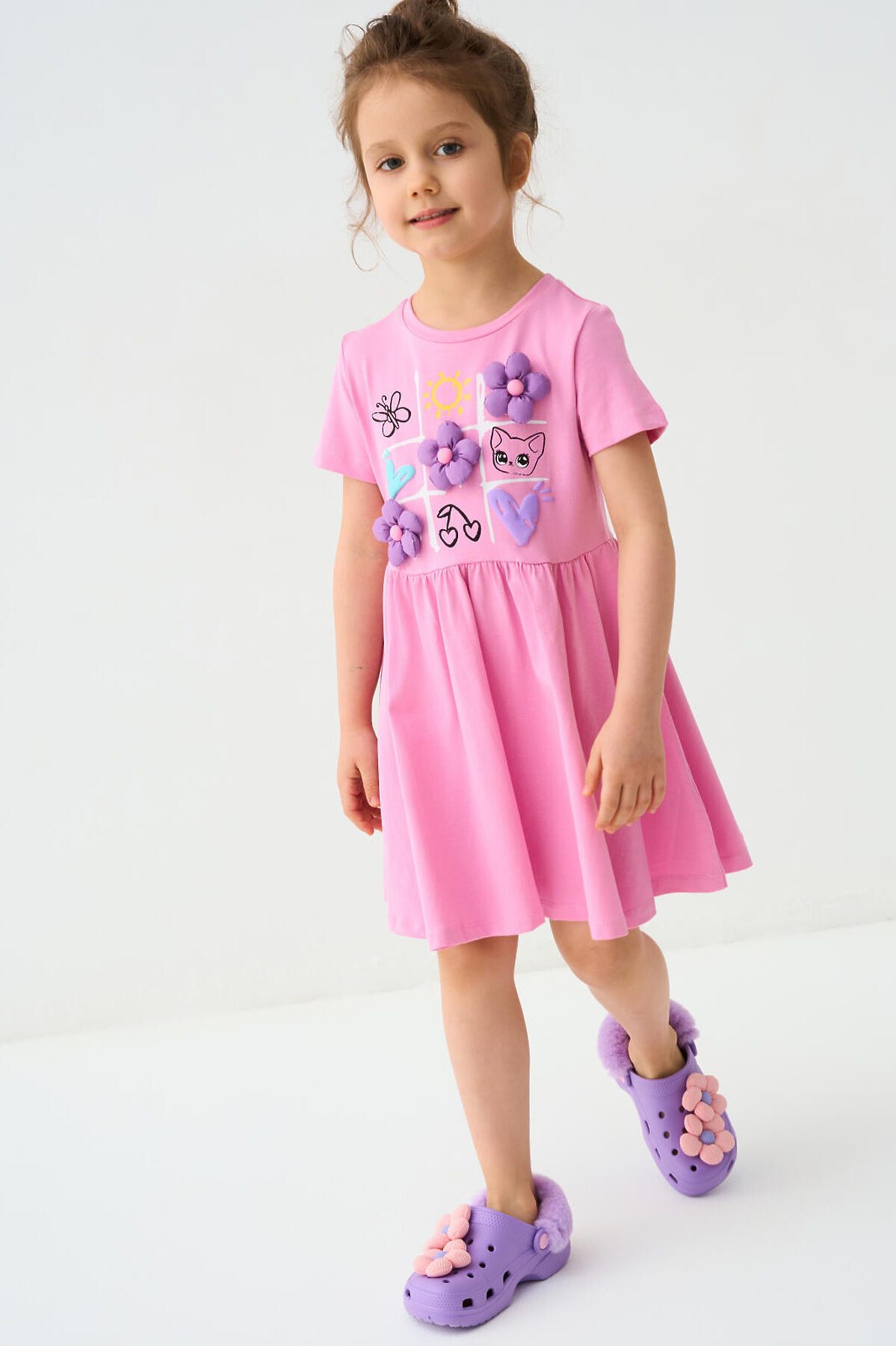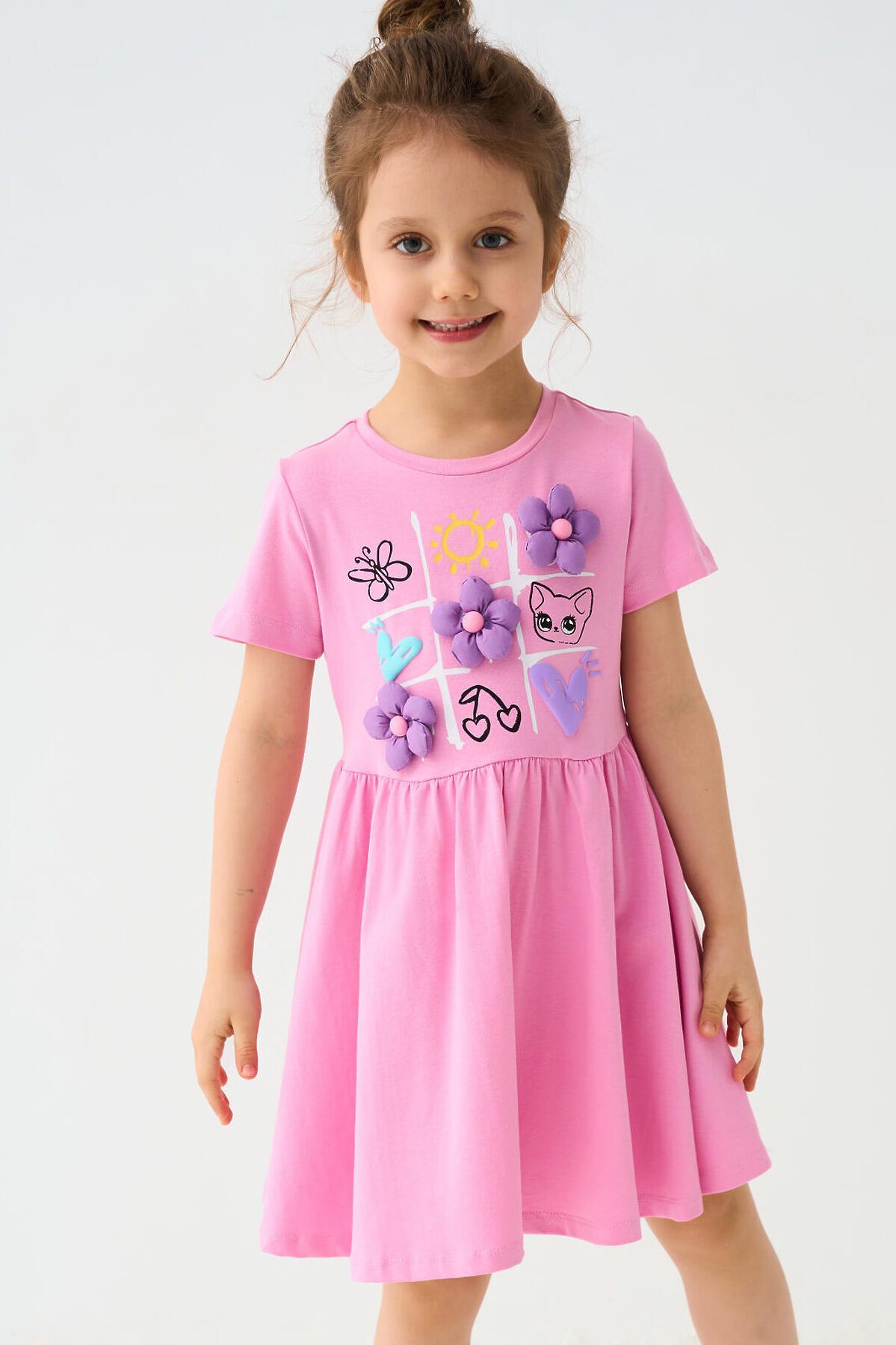 Детское платье для девочки. Модель с короткими рукавами, средней длины — до колена. Выполнено из мягкого хлопкового трикотажа джерси. Верхняя часть прямая, юбка со сборкой по талии создает легкий объем. Украшено красочным принтом.