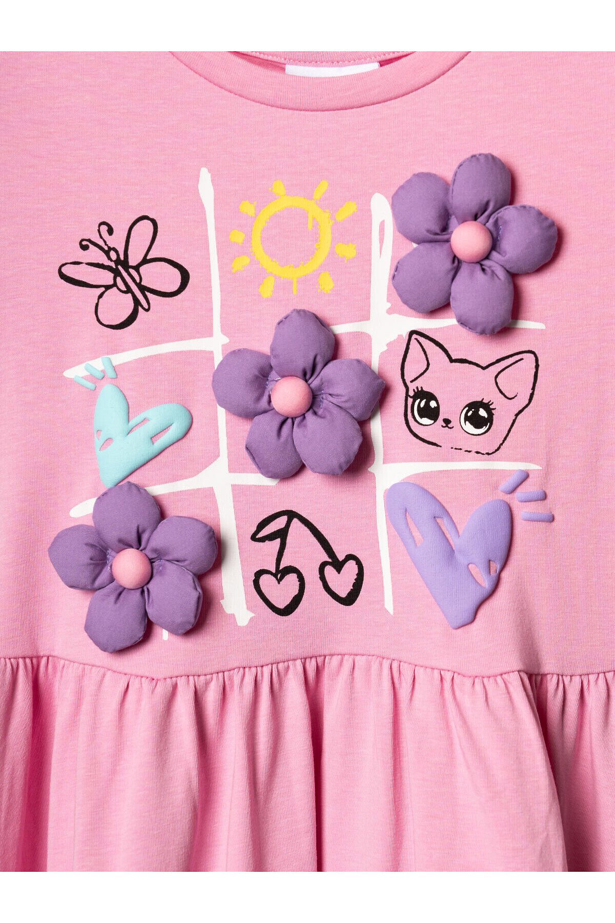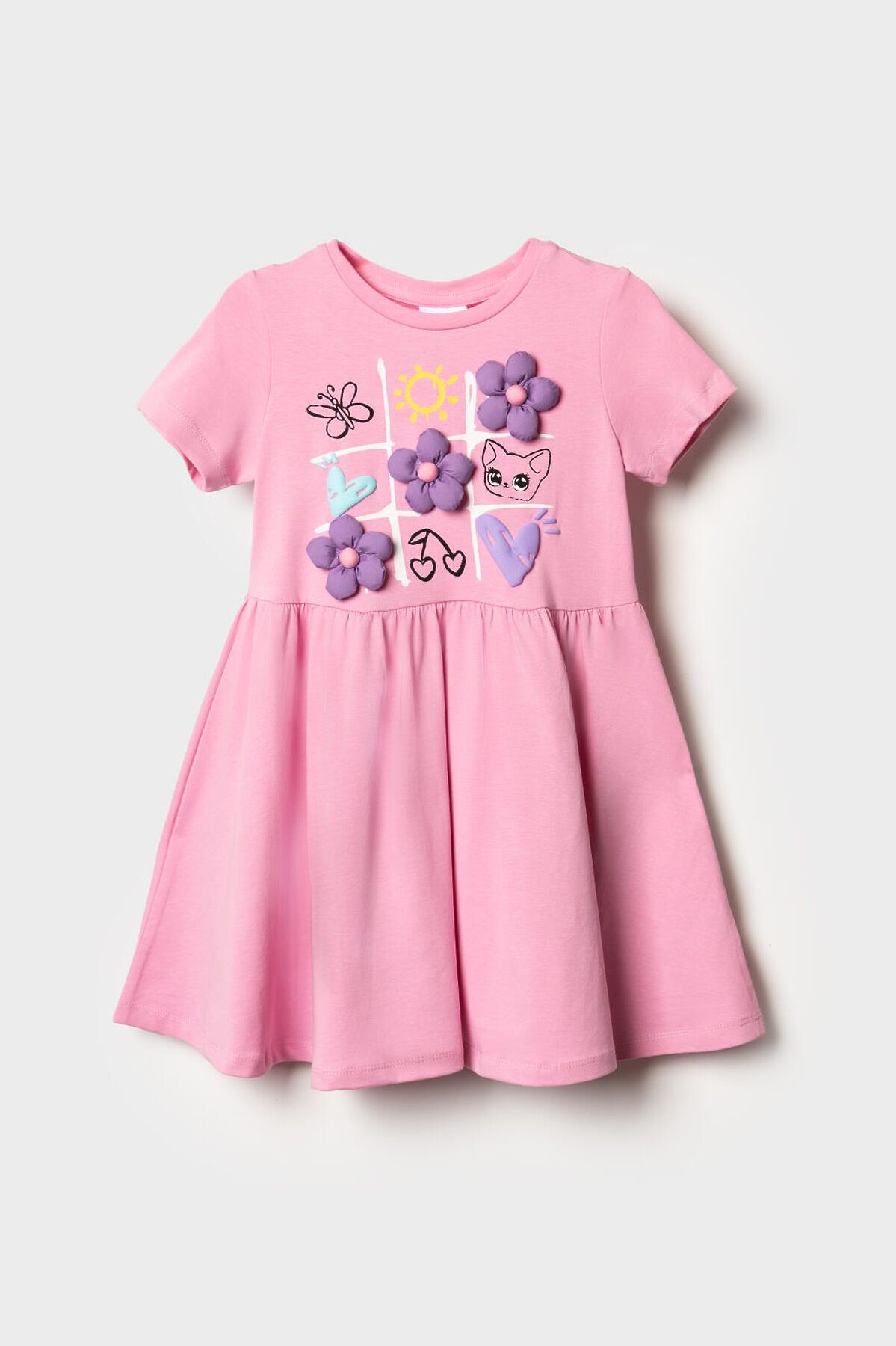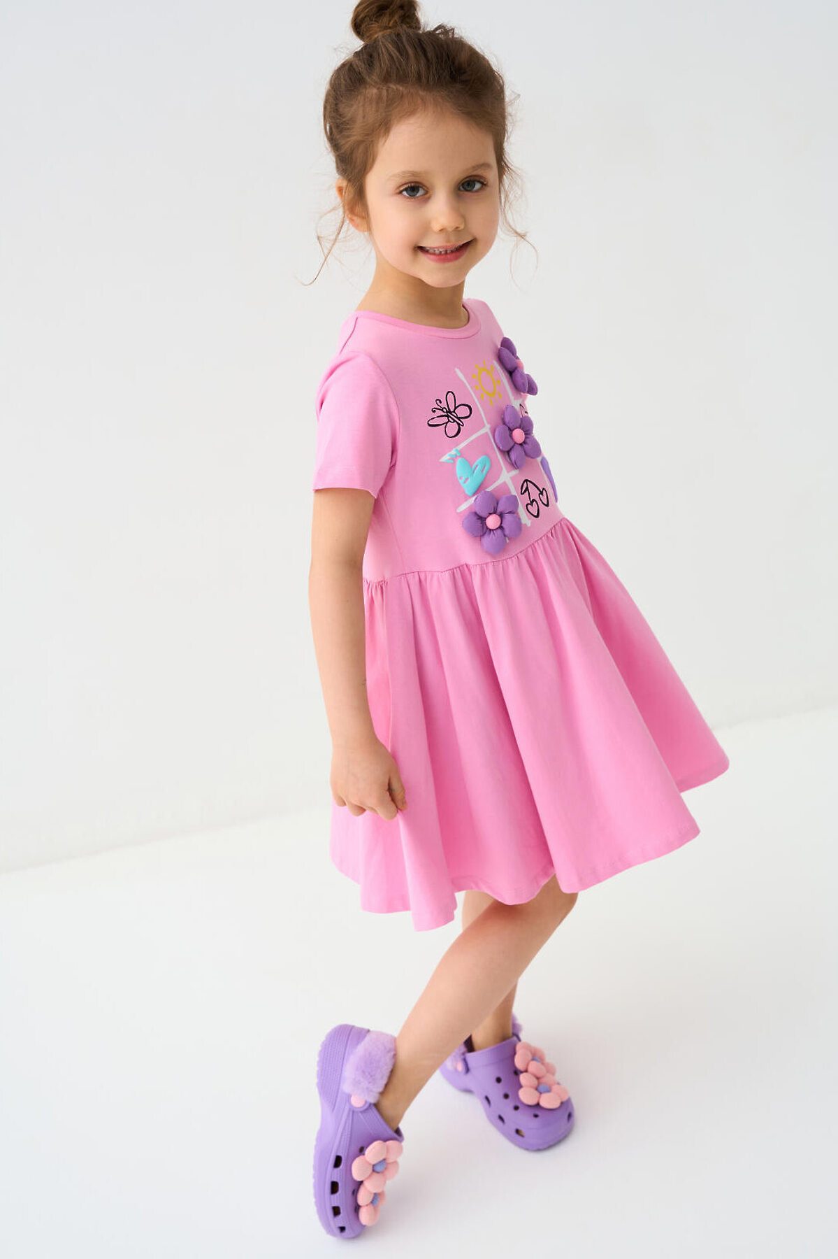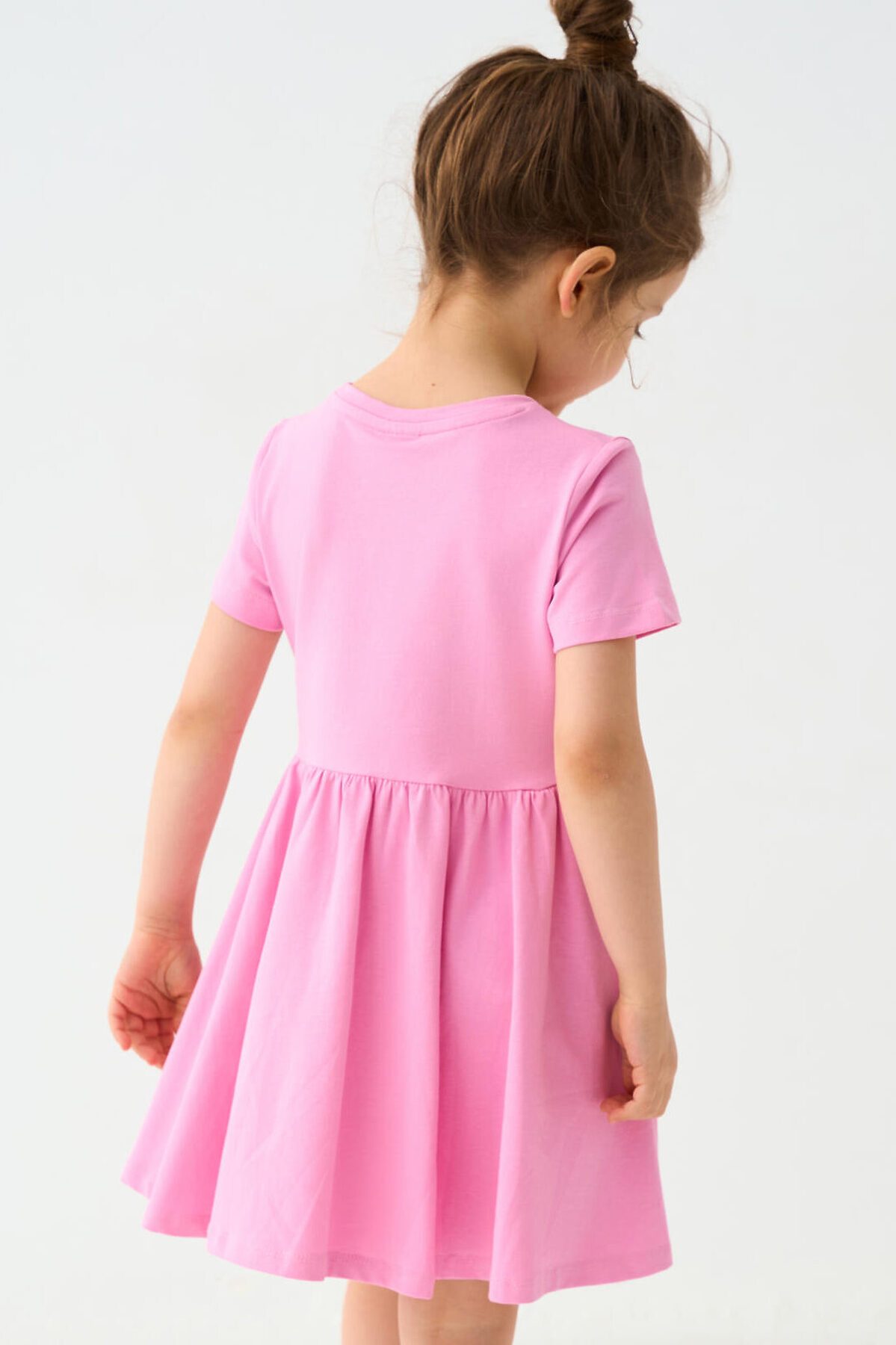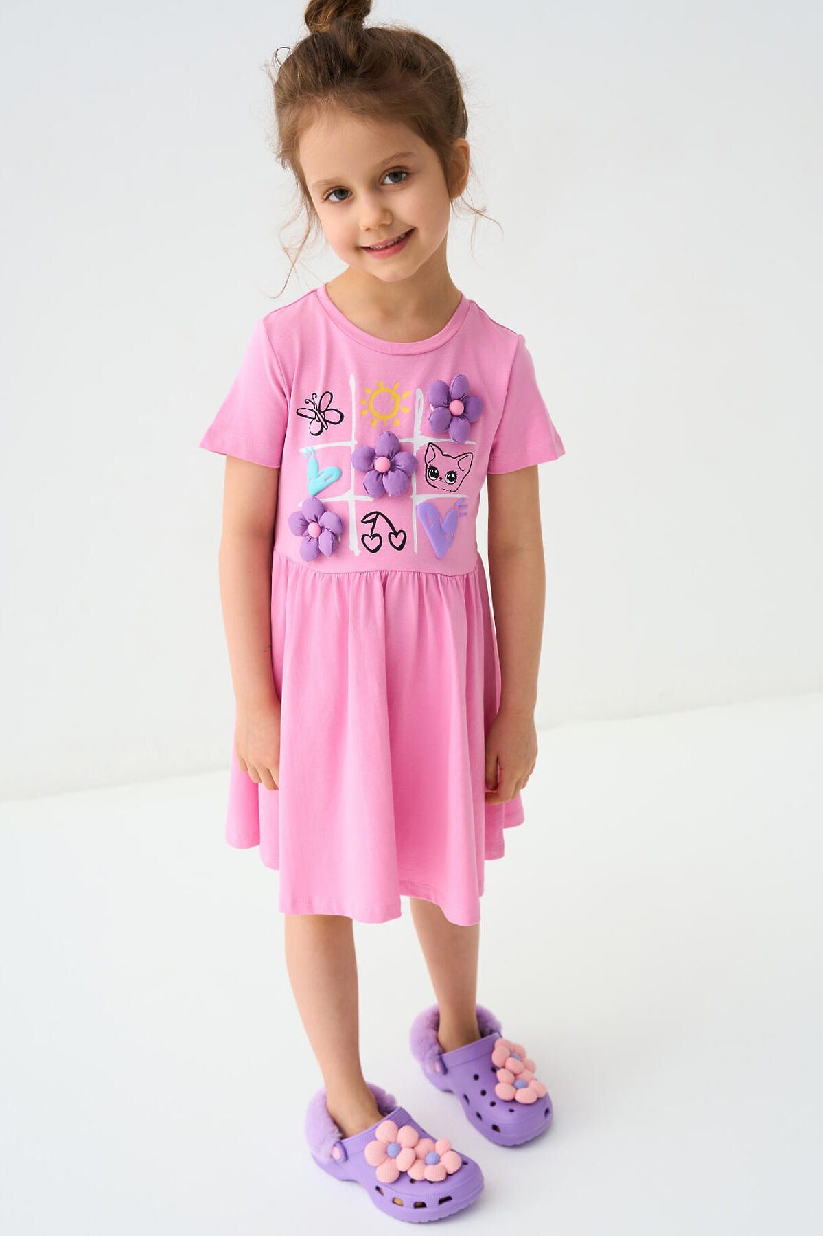 Детское платье для девочки. Модель с короткими рукавами, средней длины — до колена. Выполнено из мягкого хлопкового трикотажа джерси. Верхняя часть прямая, юбка со сборкой по талии создает легкий объем. Украшено красочным принтом.