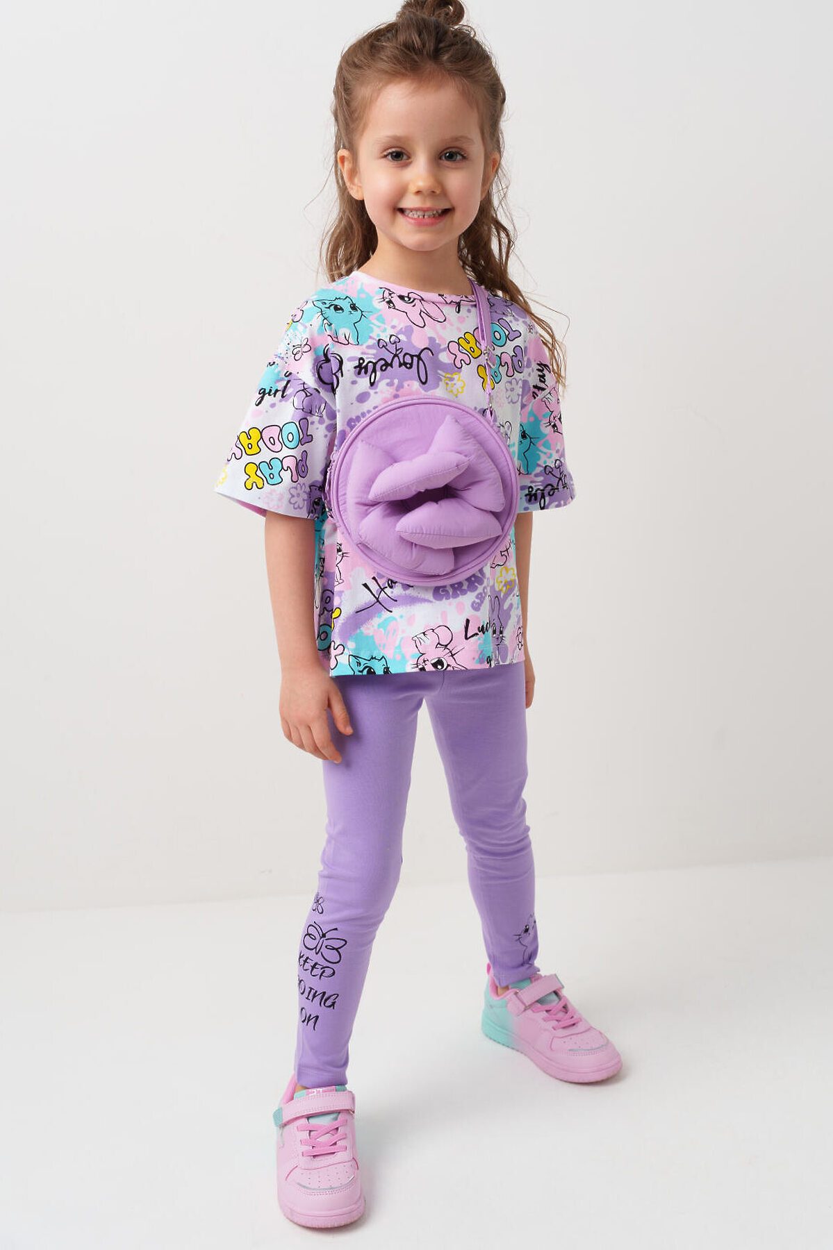 Набор детских легинсов для девочки. Комплект состоит из двух пар длинных легинсов. Обе модели имеют высокую посадку и эластичный пояс, который хорошо фиксирует изделие на талии. Материал - мягкий, хлопковый трикотаж.