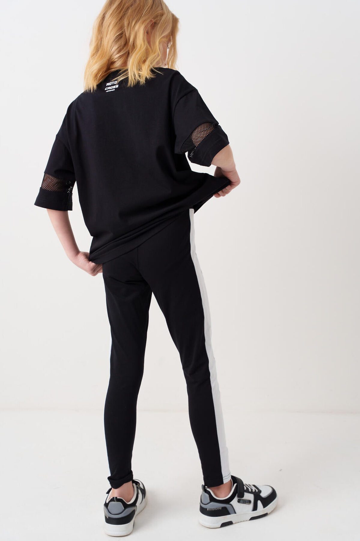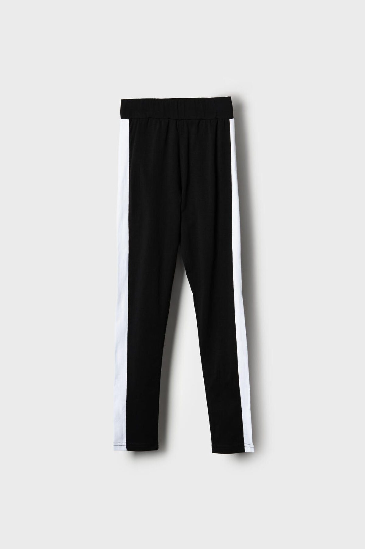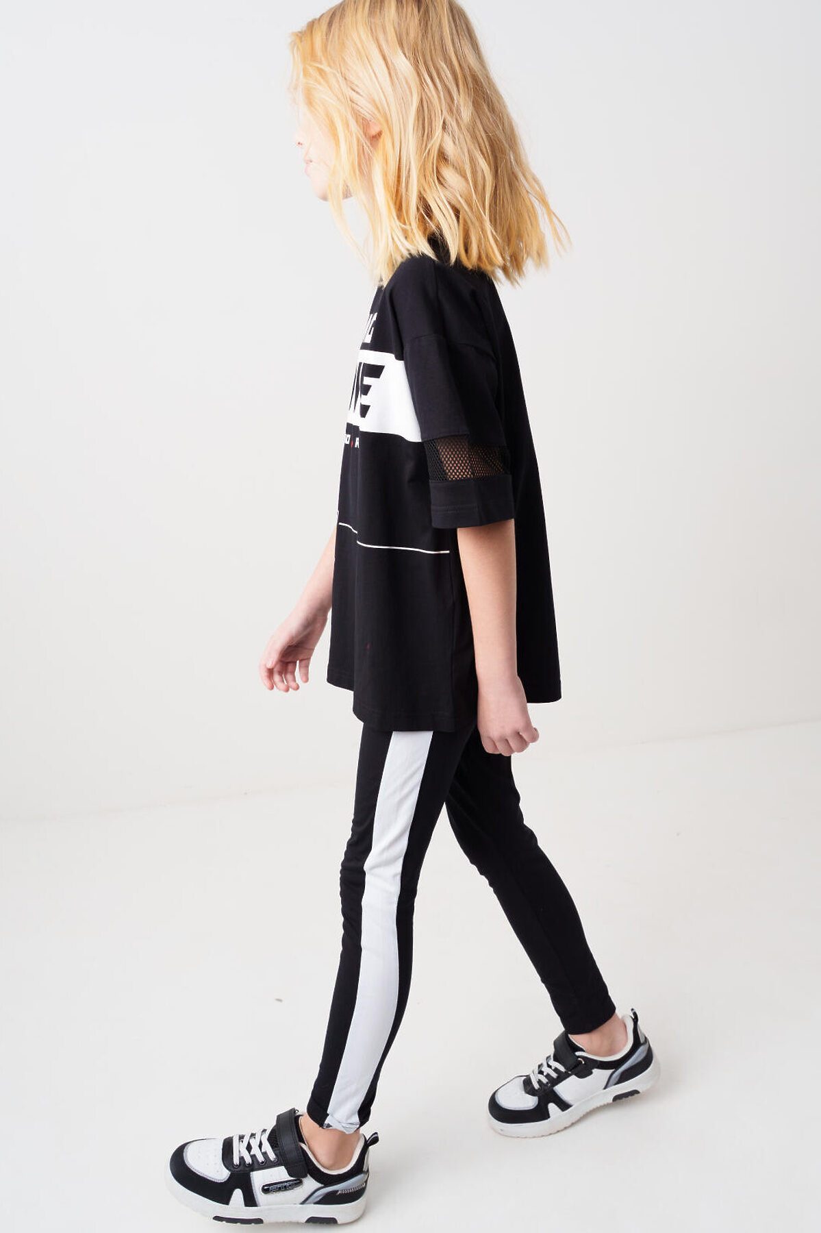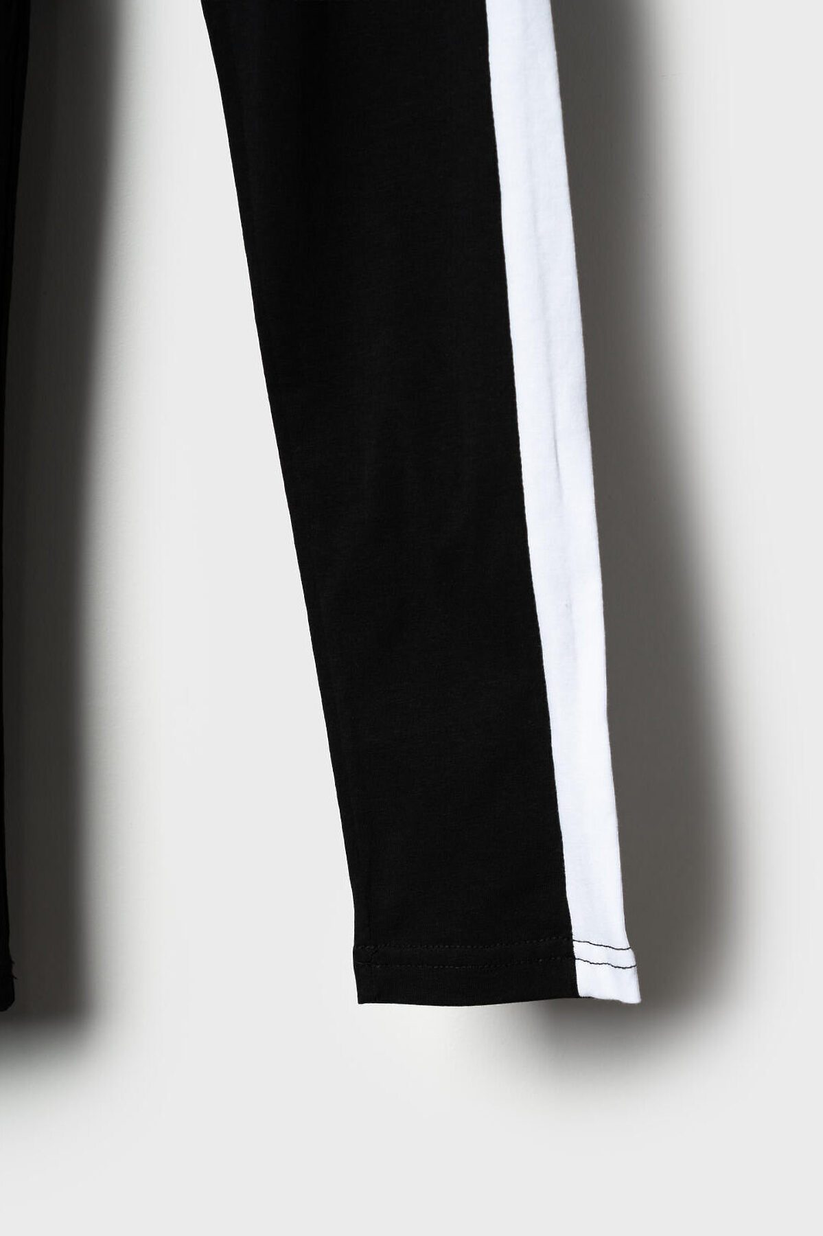 Черные легинсы для девочки подростка. Модель с белыми лампасами по бокам. Изделие выполнено из эластичного, хлопкового трикотажа, хорошо облегает фигуру и имеет высокую посадку. На талии — комфортный эластичный пояс. Длина — до щиколотки.