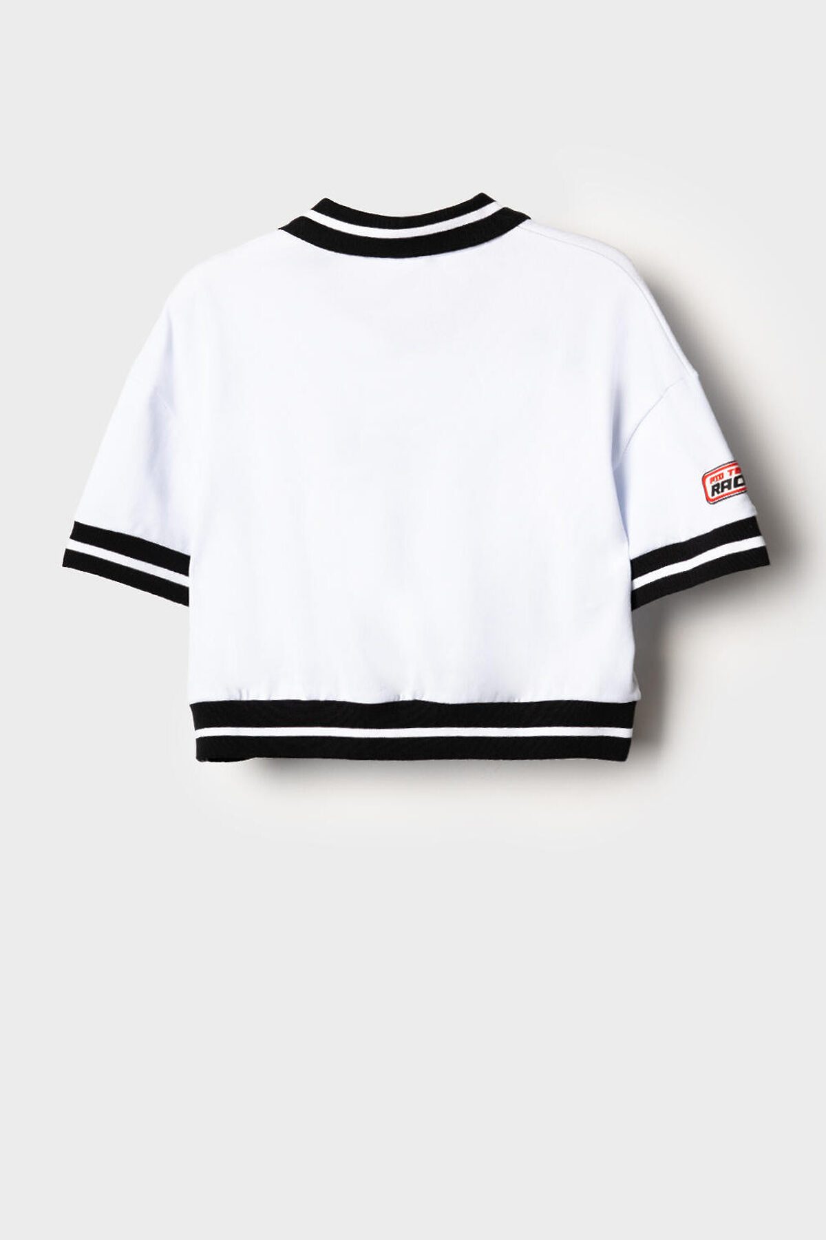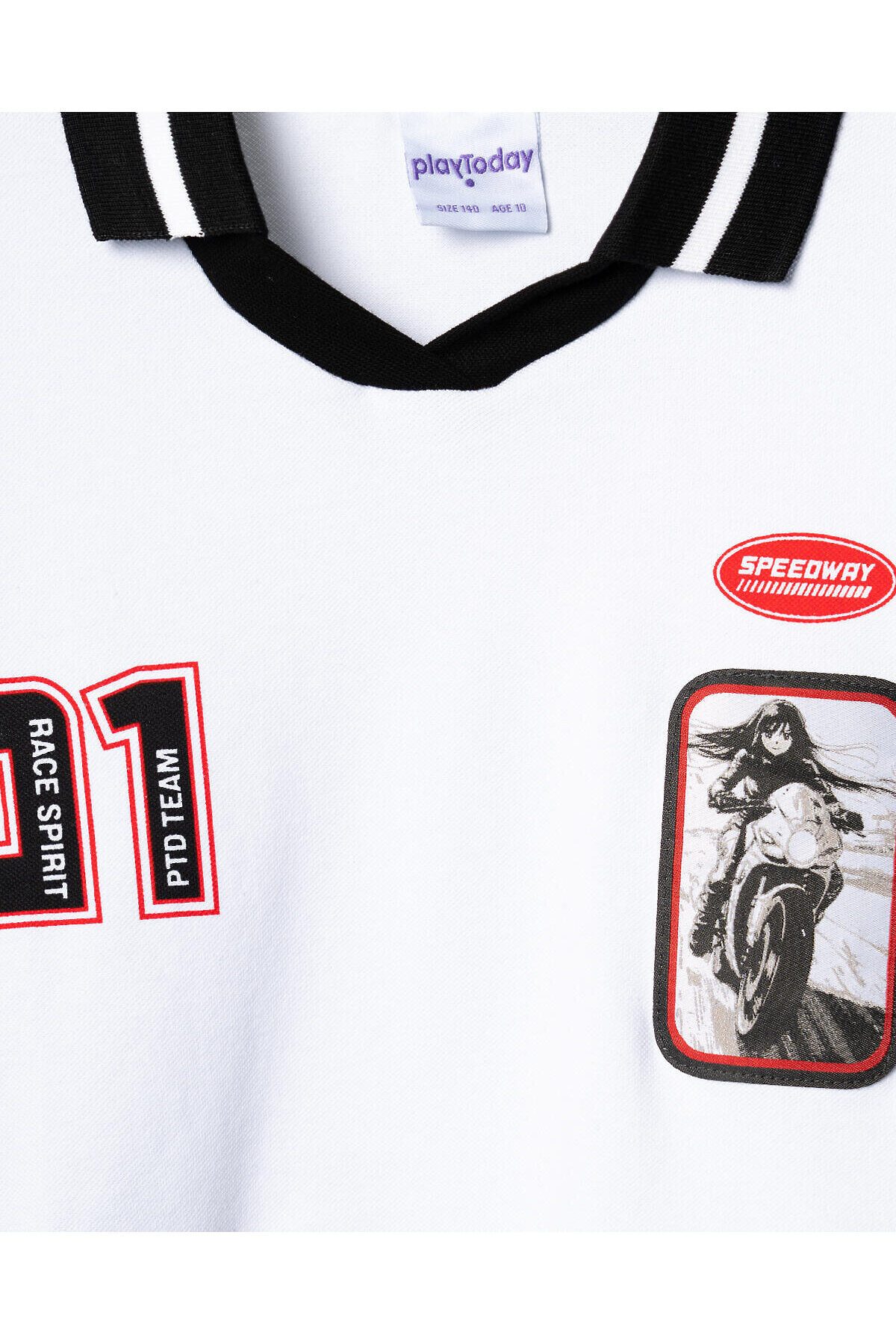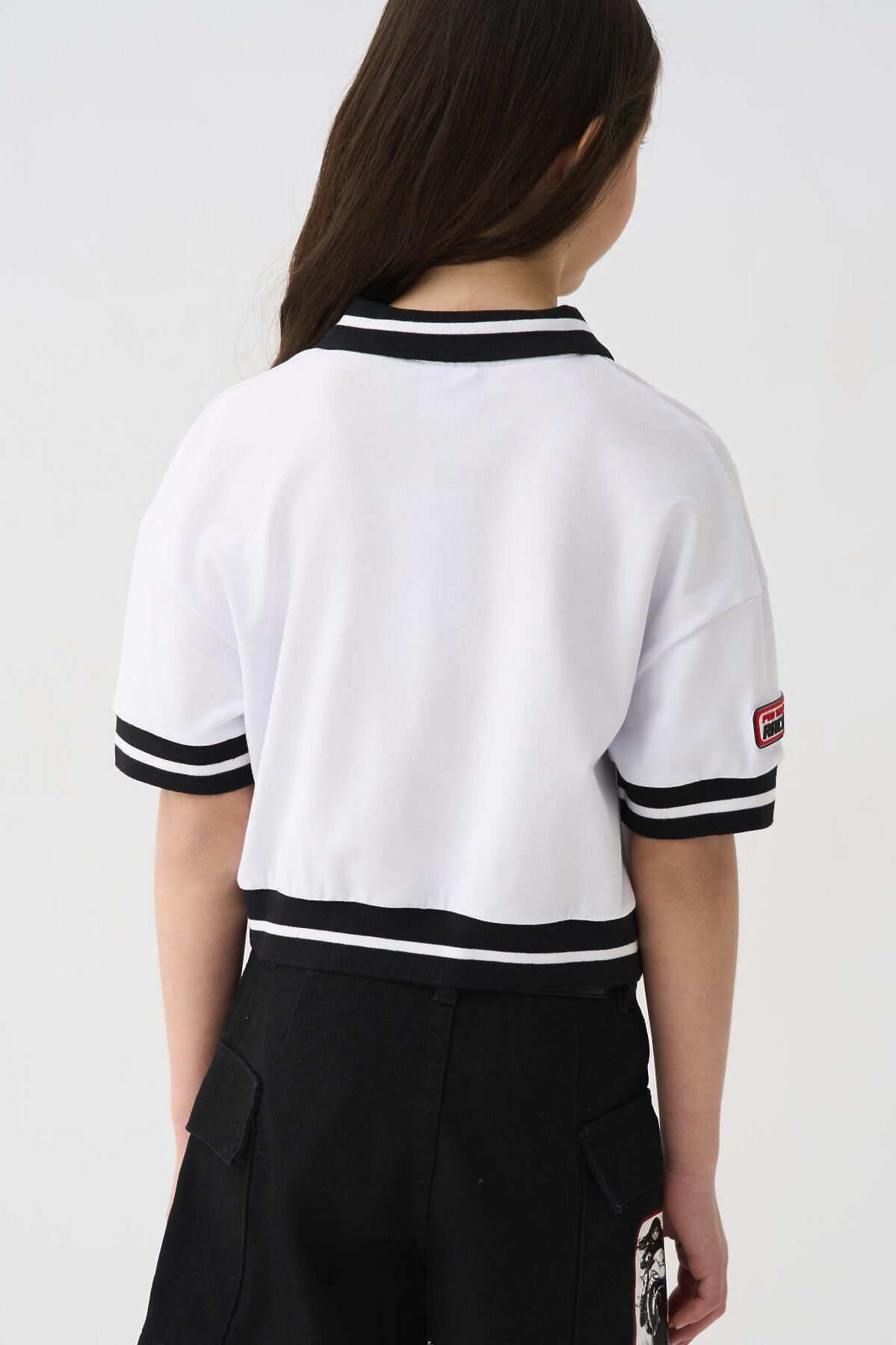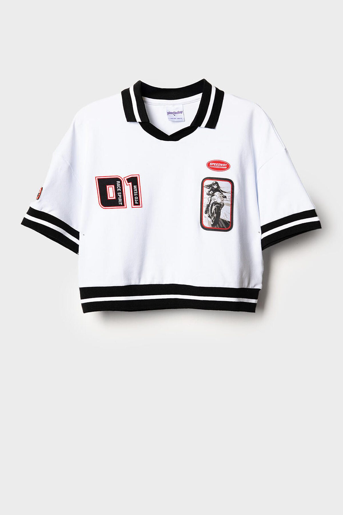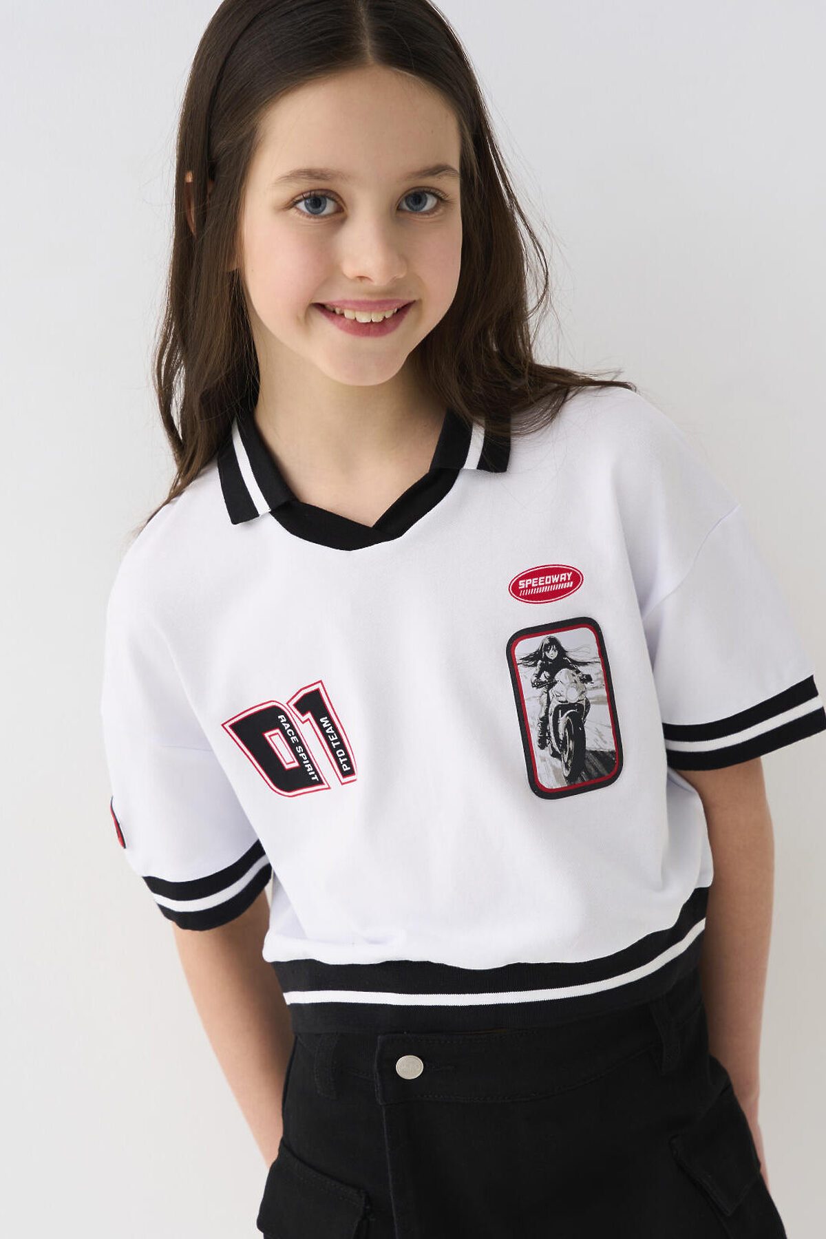 Футболка для девочки подростка. Модель укороченная, выполнена из эластичного хлопкового трикотажа пике. На груди и рукавах расположены принты и нашивки в гоночной тематике. Горловина с отложным воротником. Рукава и низ изделия выполнены из эластичного риба.
