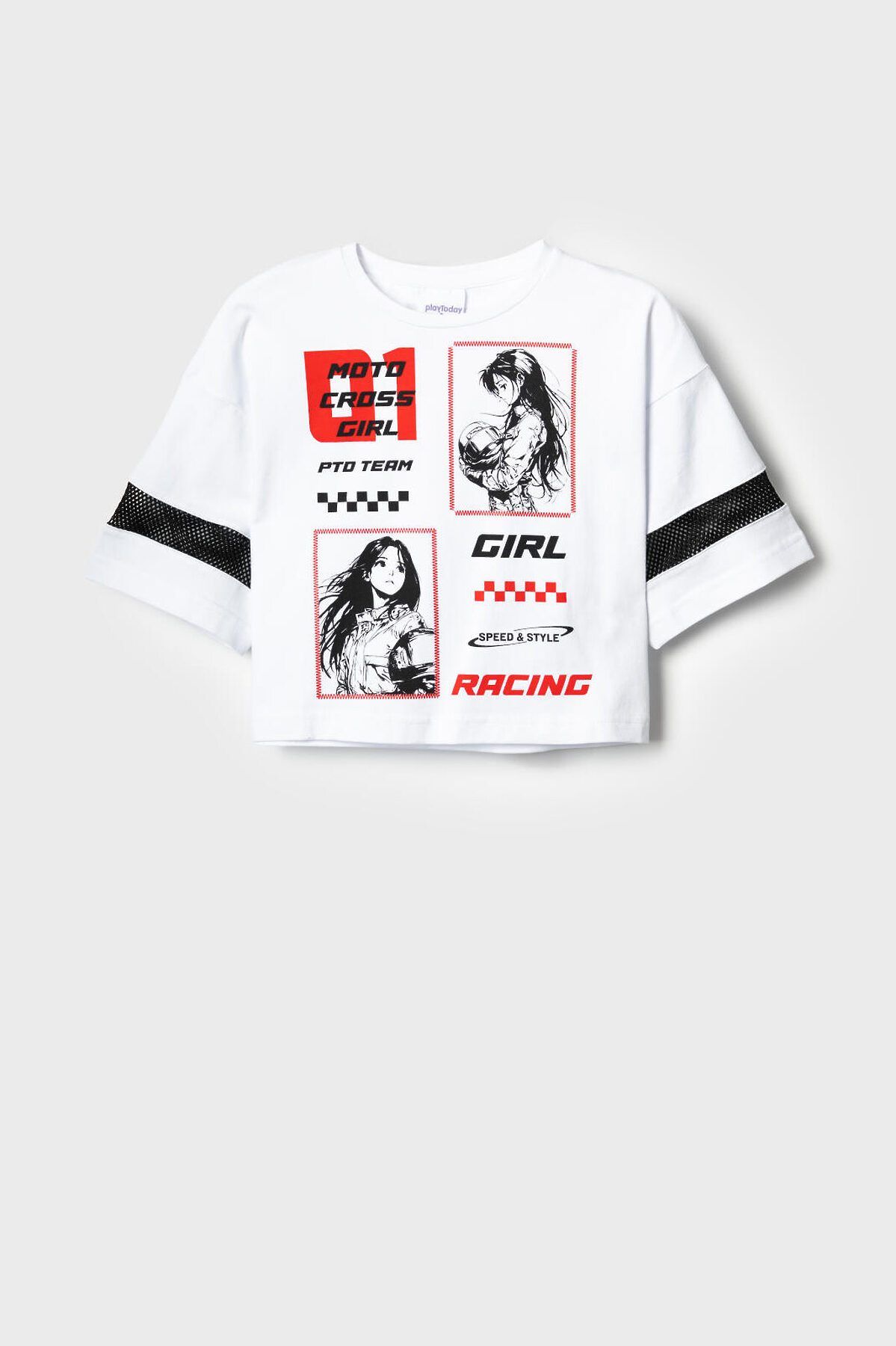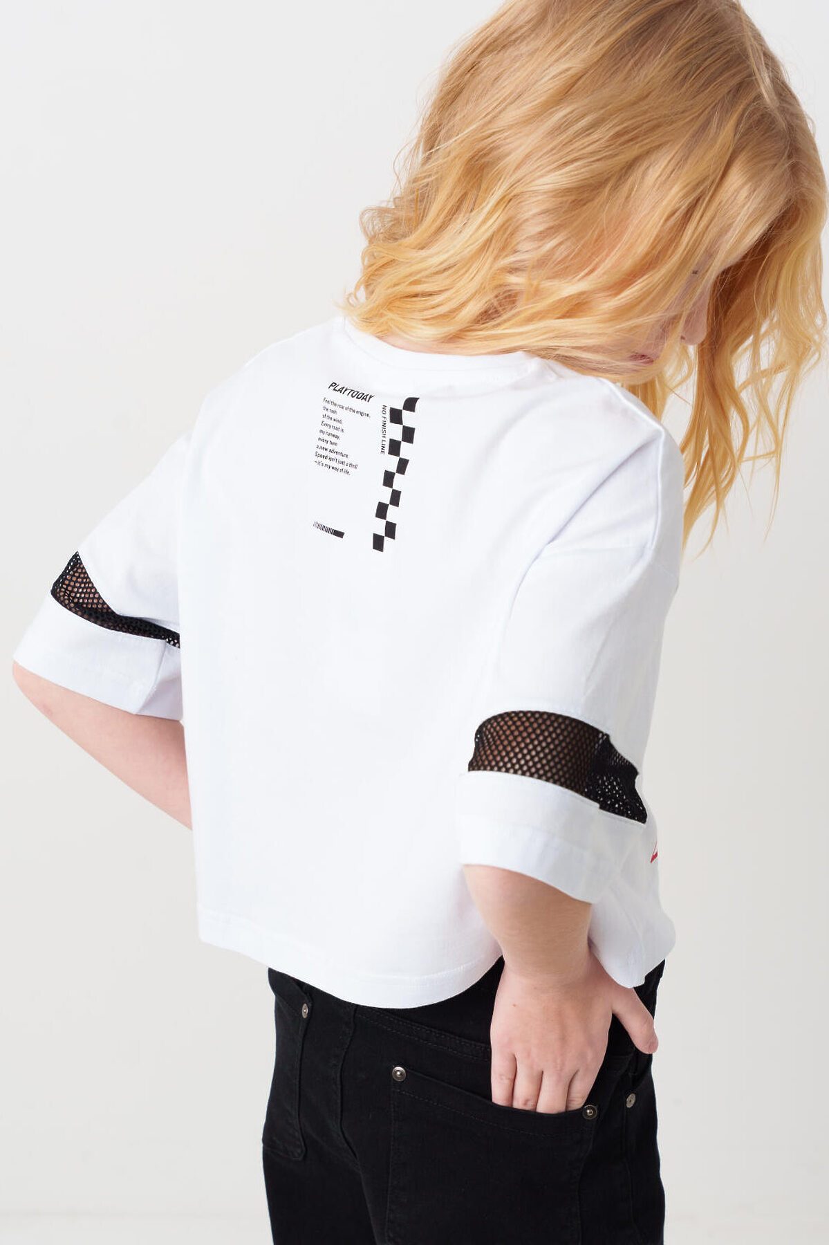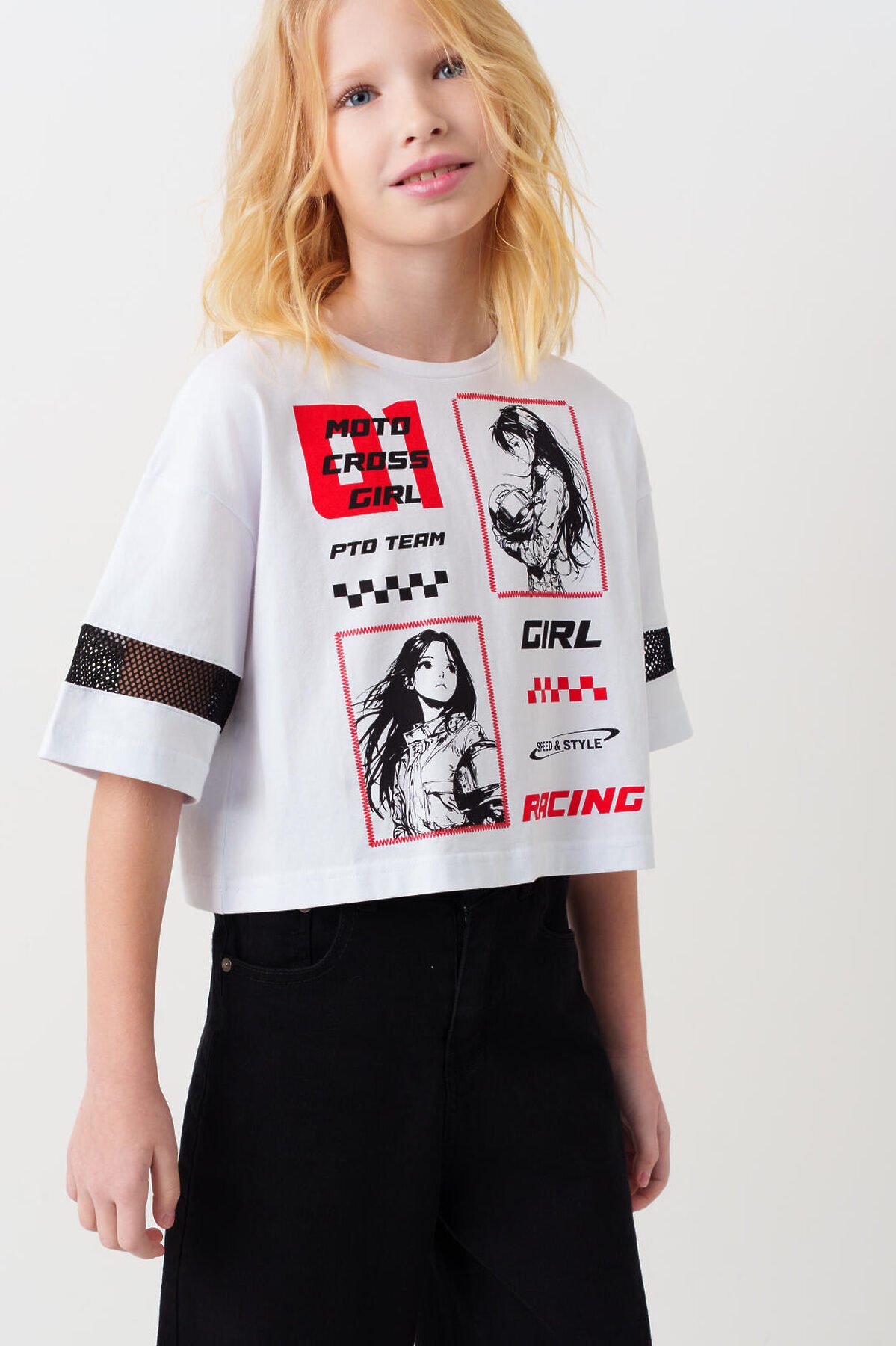 Футболка оверсайз для девочки подростка. Модель укороченная, выполнена из эластичного хлопкового трикотажа джерси. Красочный принт в гоночной тематике. Горловина круглая. На рукавах вставки из сетки.