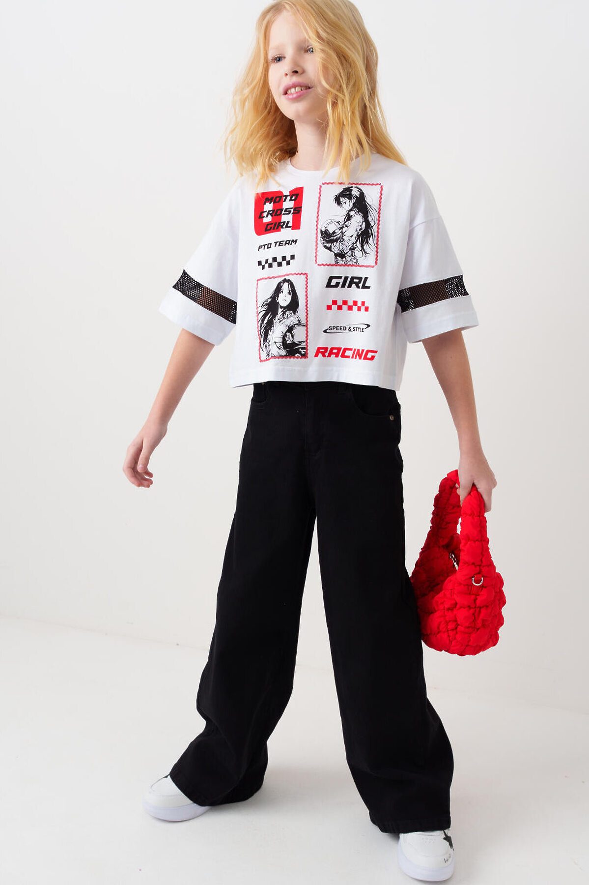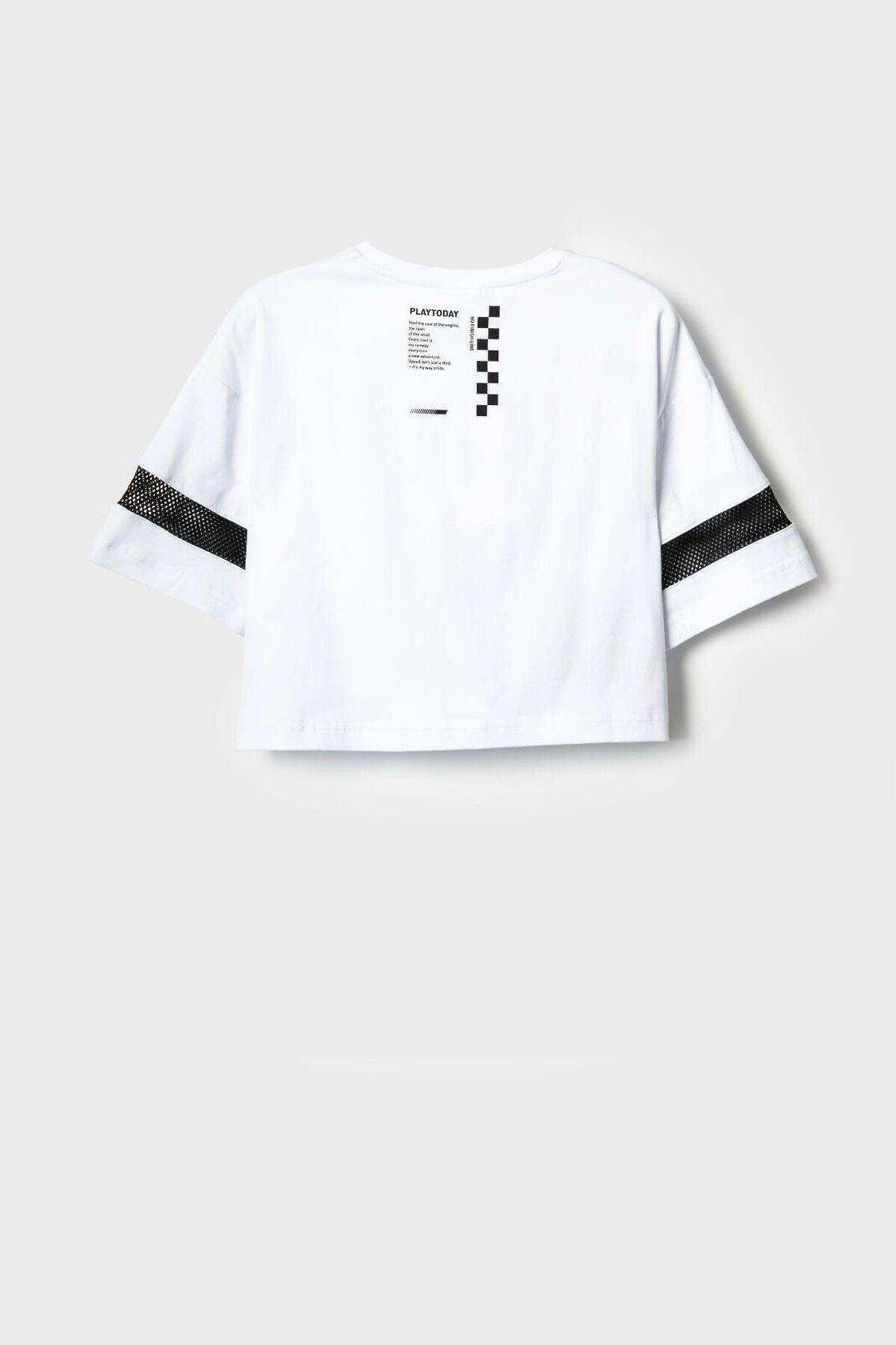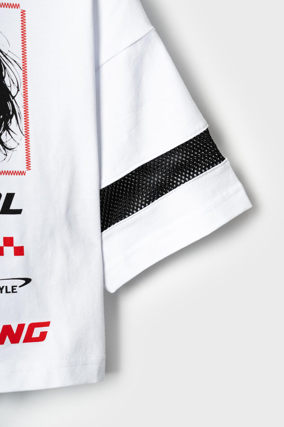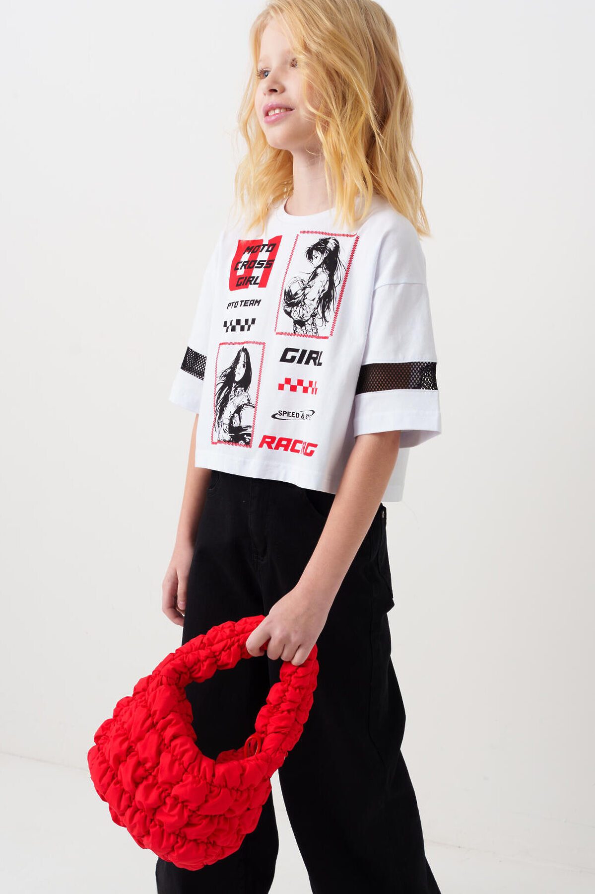 Футболка оверсайз для девочки подростка. Модель укороченная, выполнена из эластичного хлопкового трикотажа джерси. Красочный принт в гоночной тематике. Горловина круглая. На рукавах вставки из сетки.