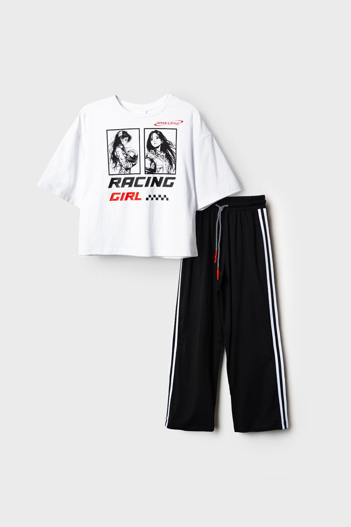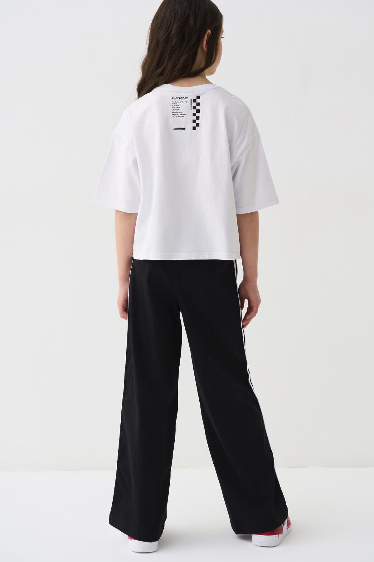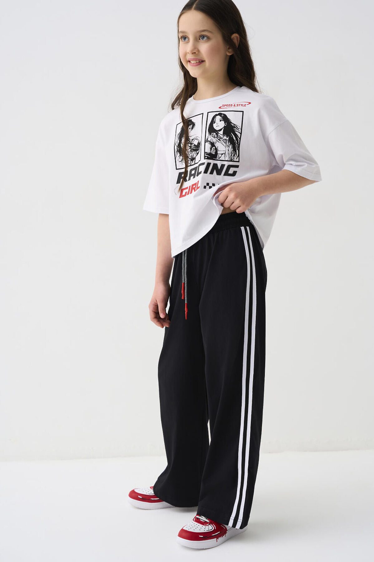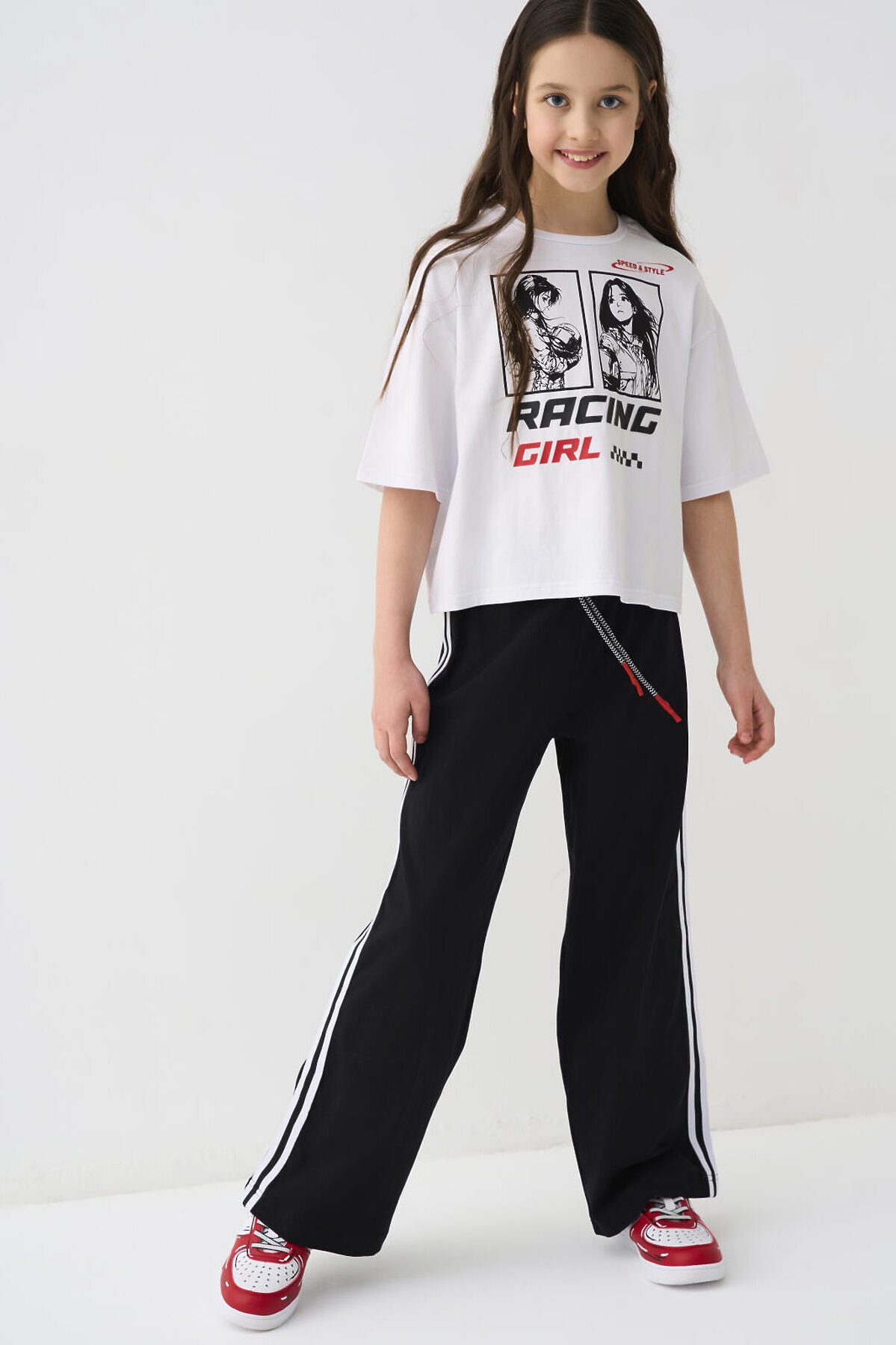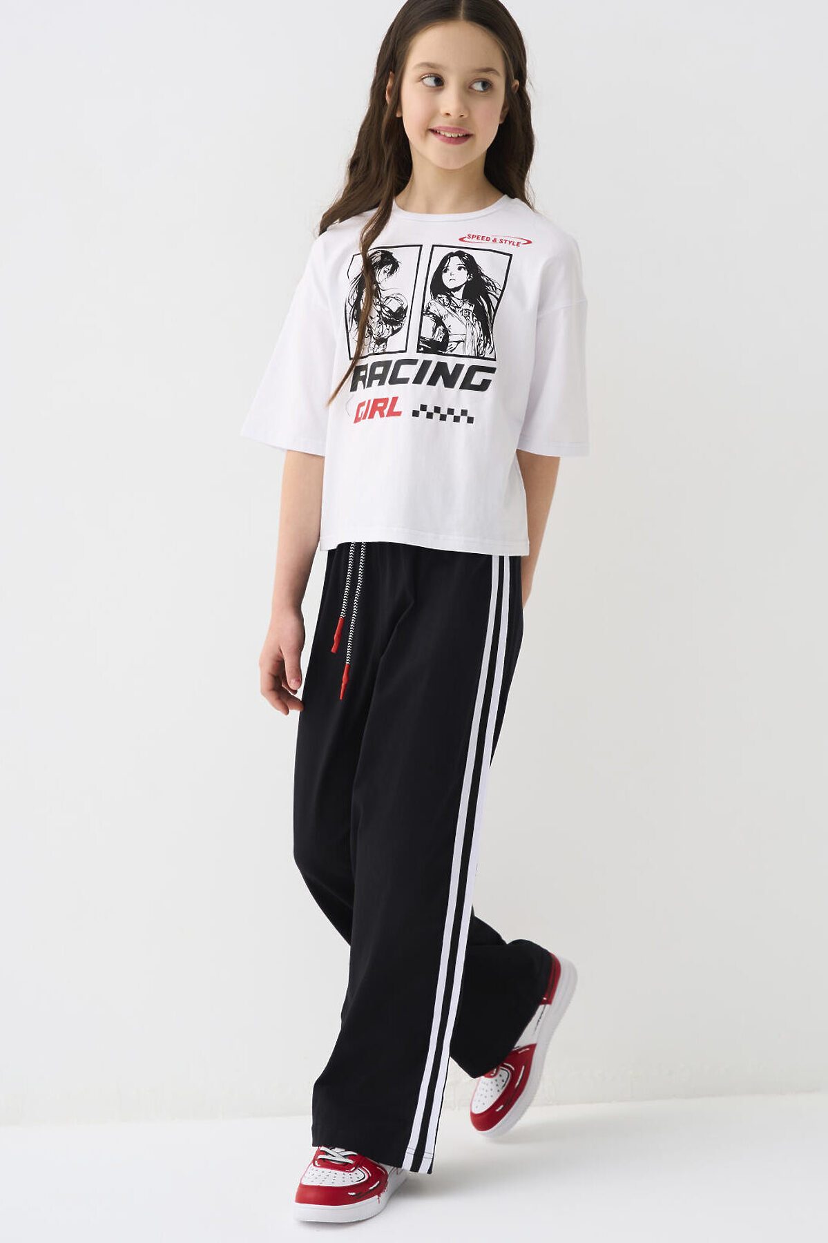 Комплект для девочки подростка. Состоит из футболки оверсайз и широких брюк. Выполнен из хлопкового трикотажа. Футболка свободного силуэта, с короткими рукавами. Украшена крупным графическим принтом. На спинке под горловиной расположен вертикальный принт. Брюки — широкие, с высокой посадкой. Штаны с эластичным поясом и шнурком для регулировки. По бокам добавлены декоративные лампасы, а на шнурке — контрастные наконечники.