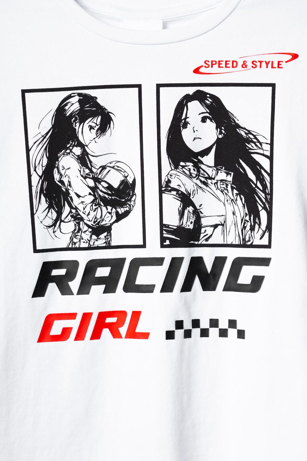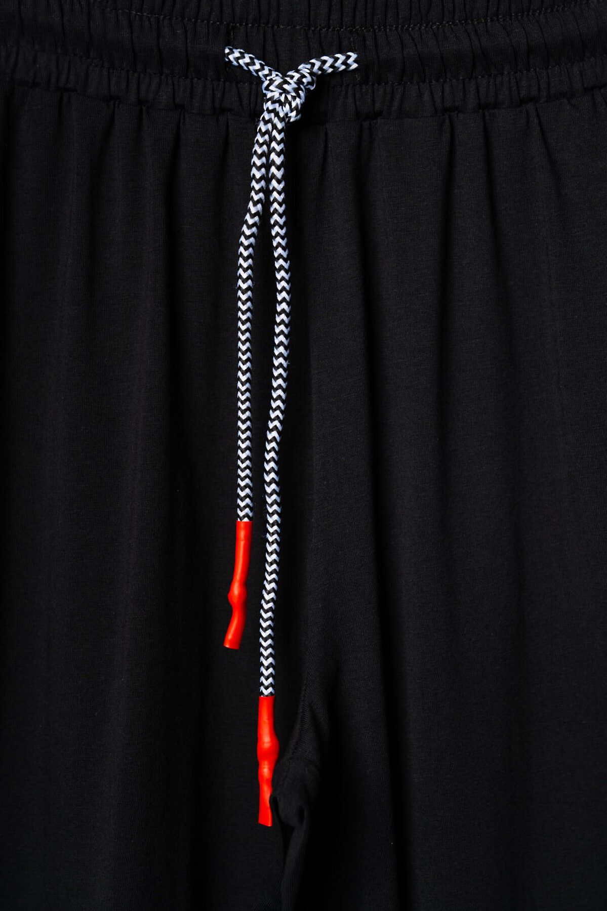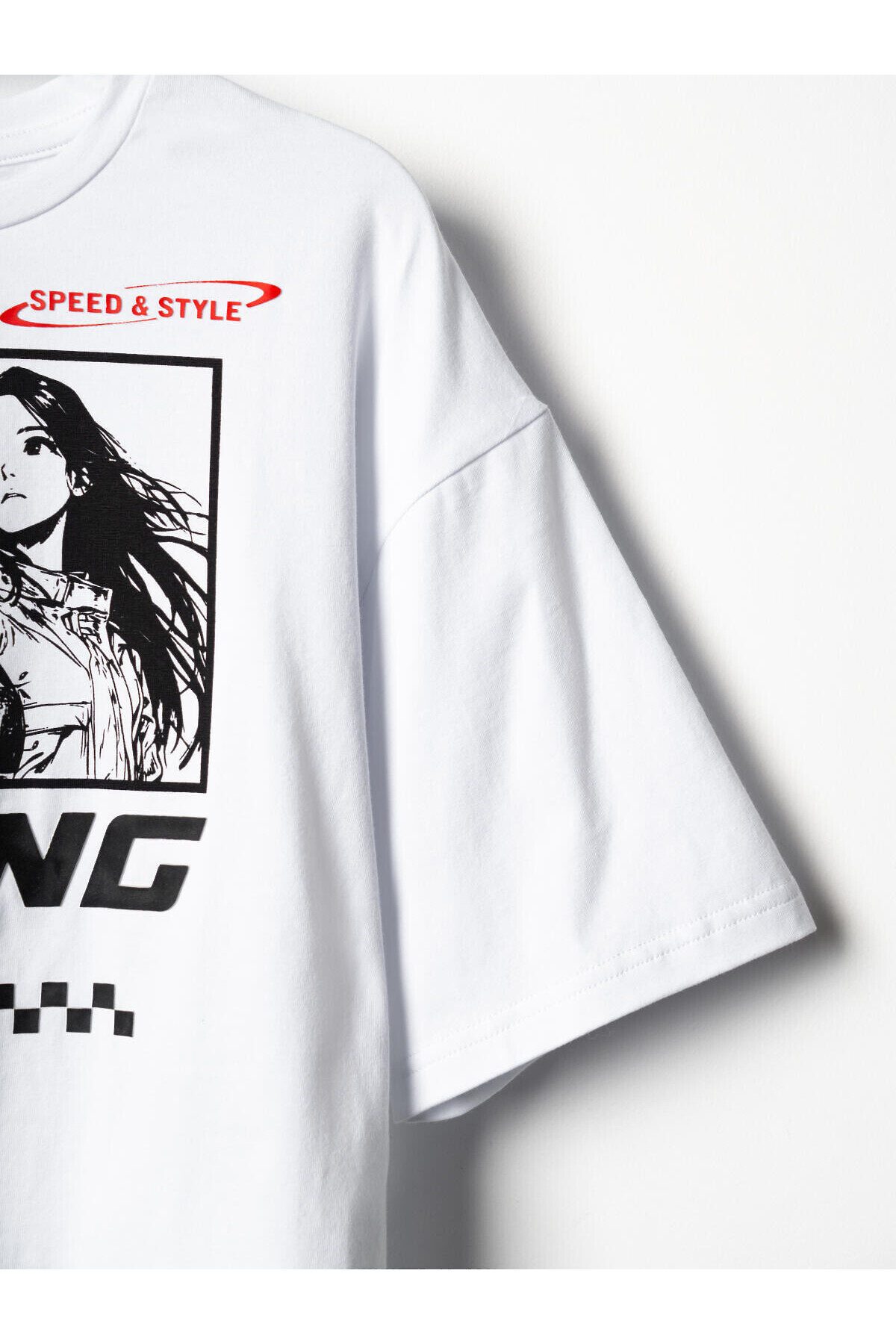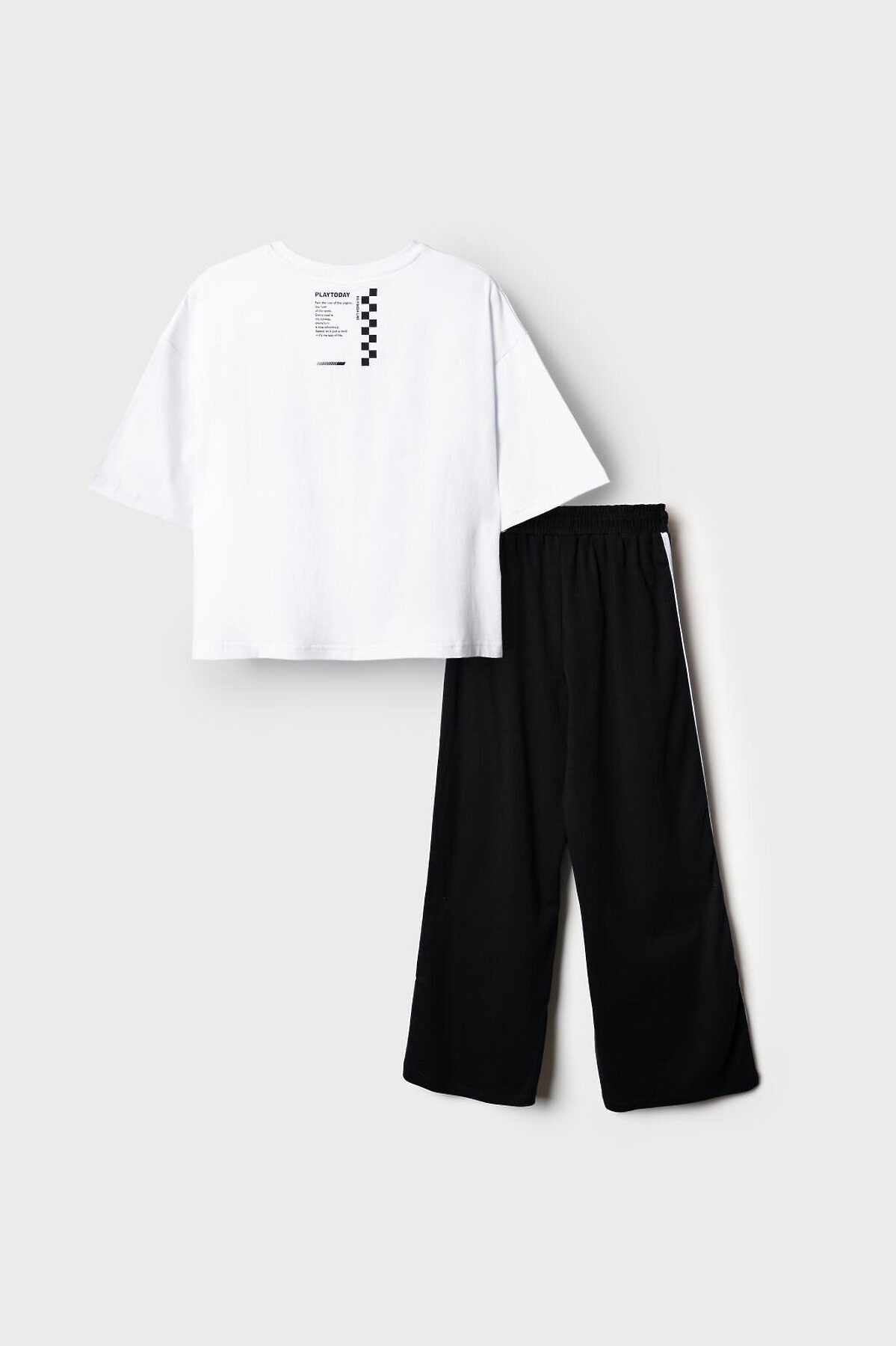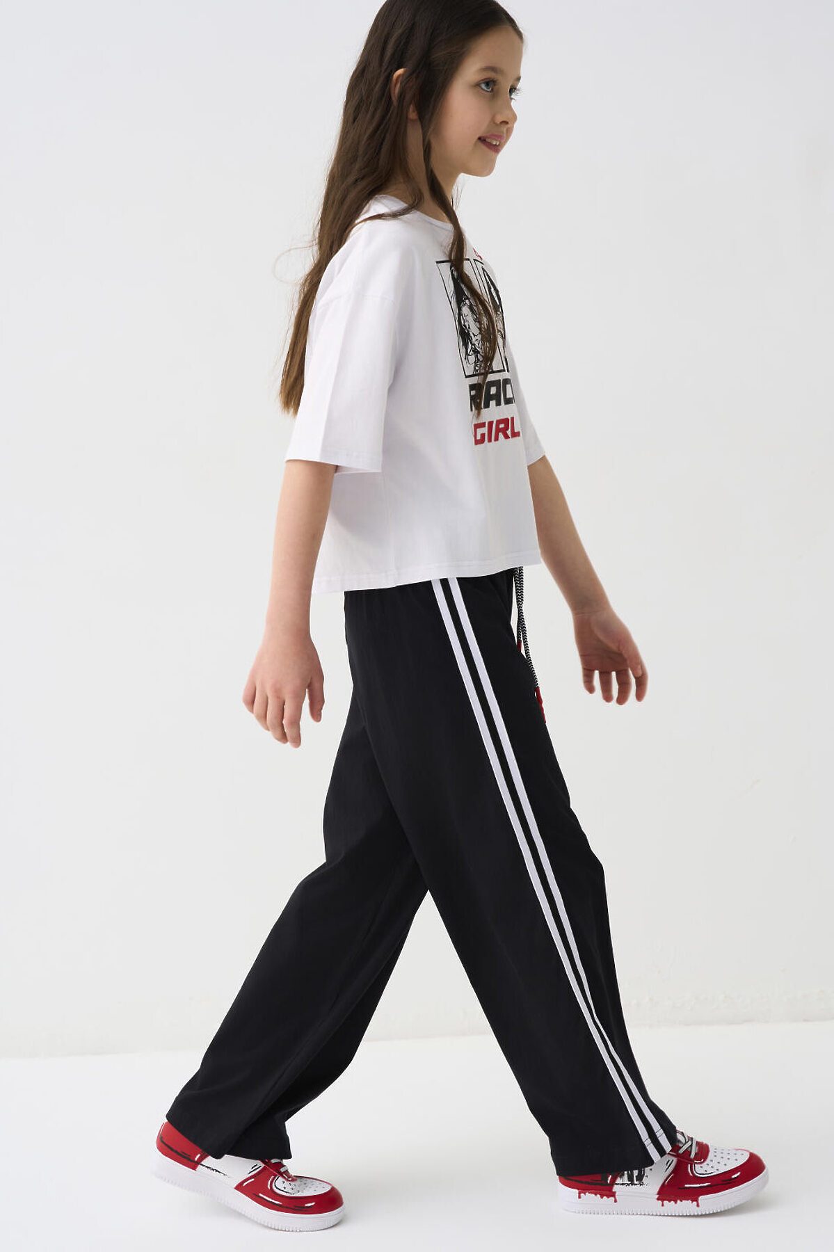 Комплект для девочки подростка. Состоит из футболки оверсайз и широких брюк. Выполнен из хлопкового трикотажа. Футболка свободного силуэта, с короткими рукавами. Украшена крупным графическим принтом. На спинке под горловиной расположен вертикальный принт. Брюки — широкие, с высокой посадкой. Штаны с эластичным поясом и шнурком для регулировки. По бокам добавлены декоративные лампасы, а на шнурке — контрастные наконечники.