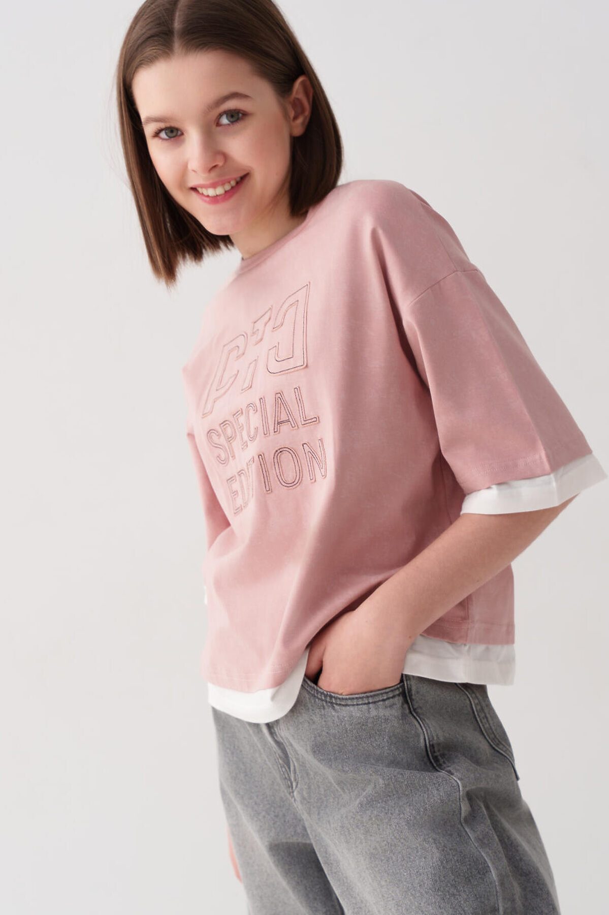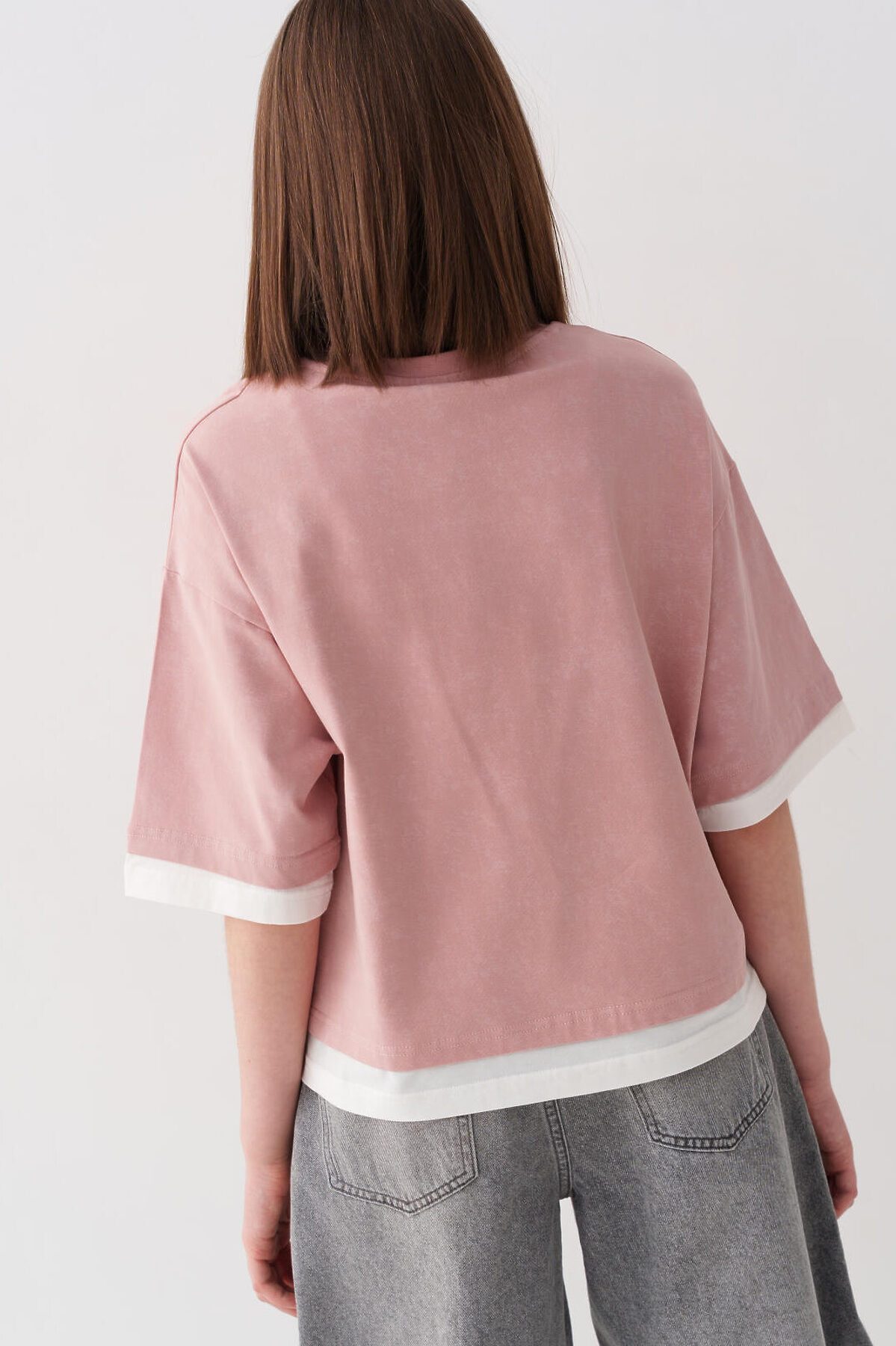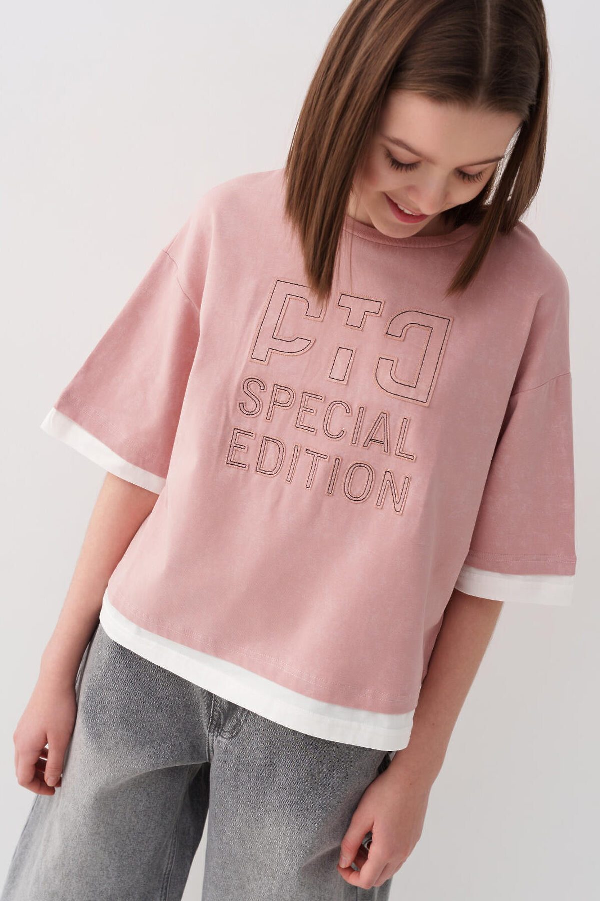 Футболка оверсайз для девочки подростка. Модель выполнена из эластичного хлопкового трикотажа джерси. На груди расположен крупный принт. Горловина круглая, обработана эластичным рибом.