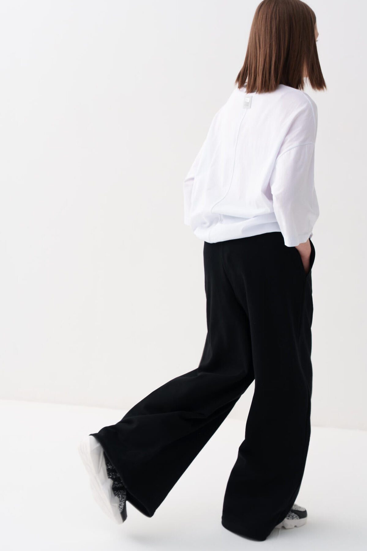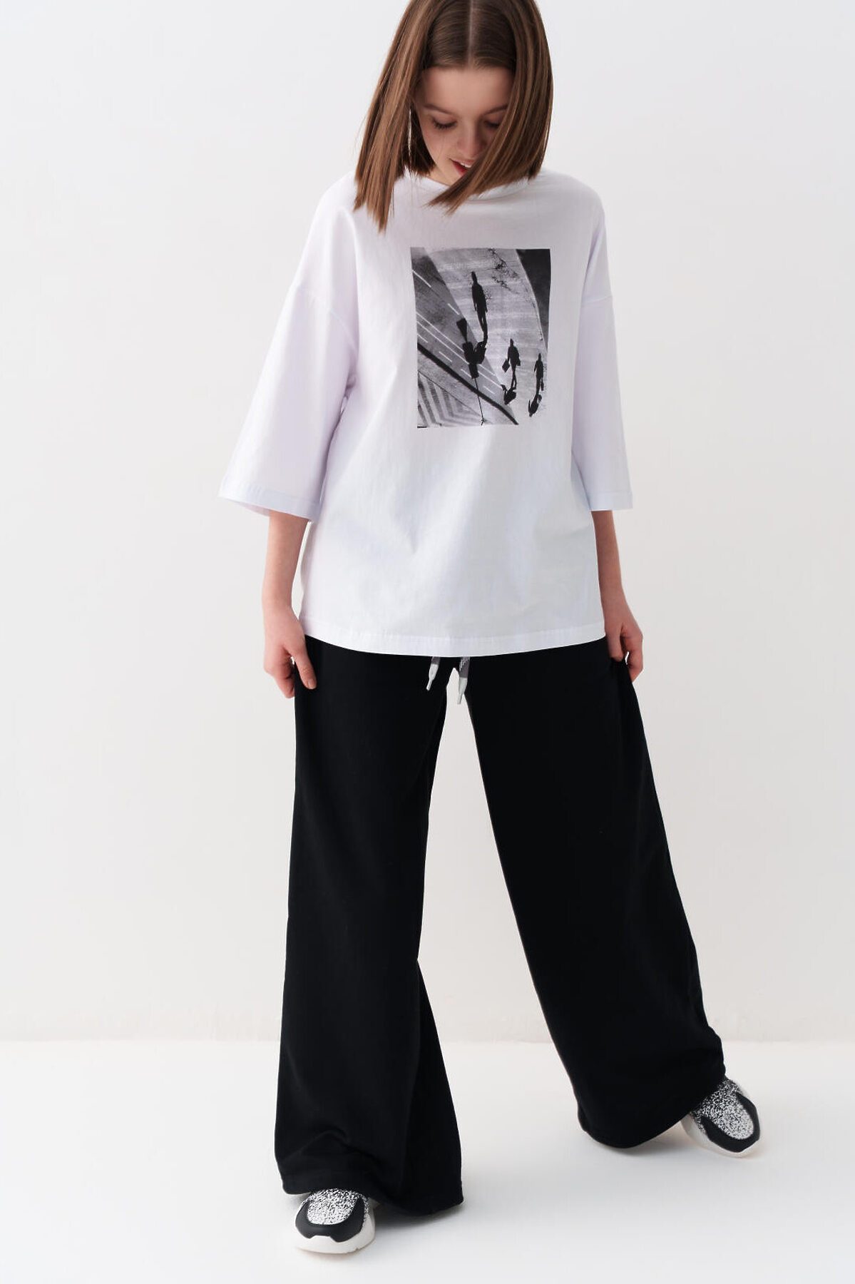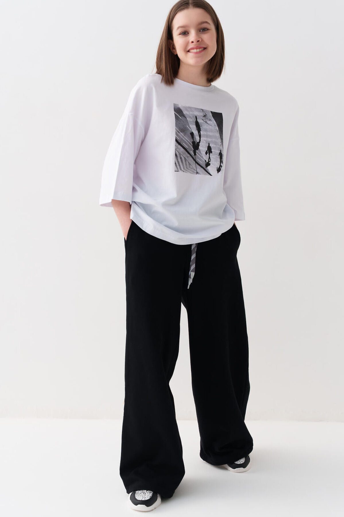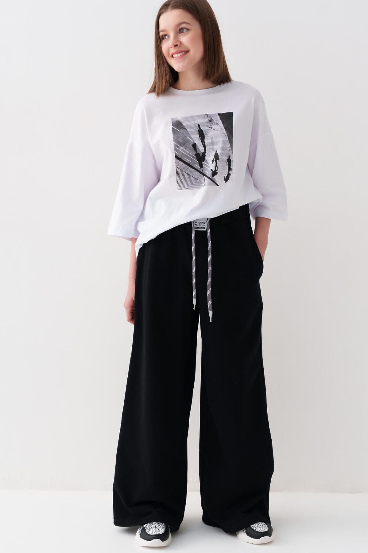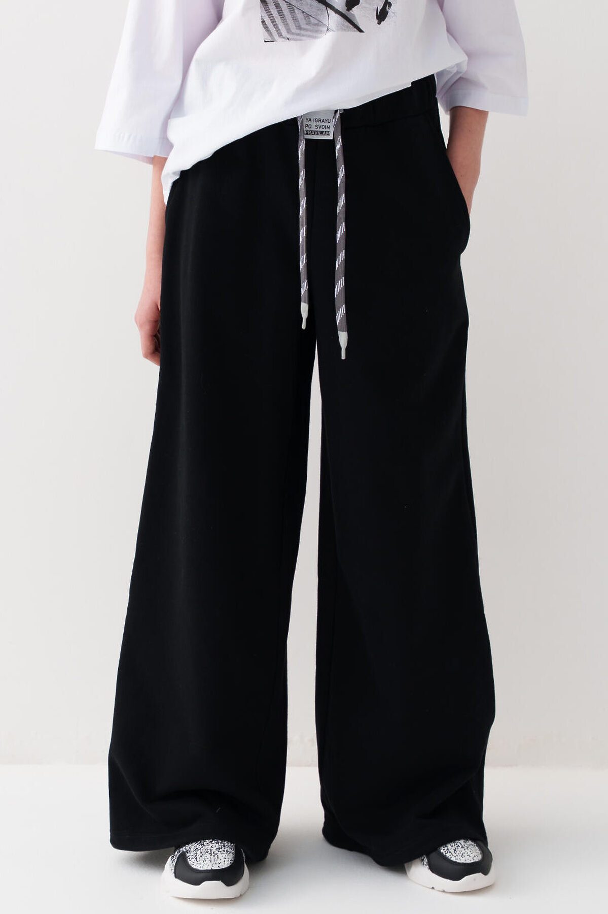 Спортивные широкие брюки для девочки подростка. Выполнены из мягкого хлопкового трикотажа футер без начеса. Пояс на резинке для удобства и регулировки предусмотрен шнур. По бокам расположены карманы. Спереди, на поясе - декоративная нашивка.