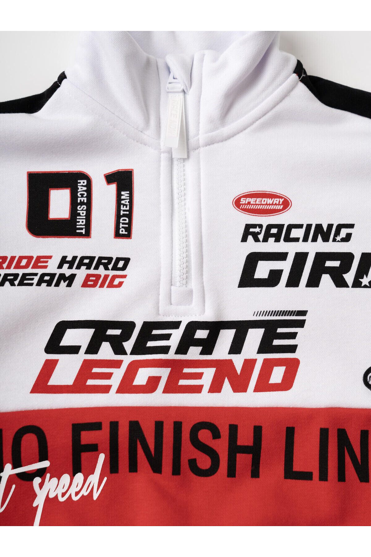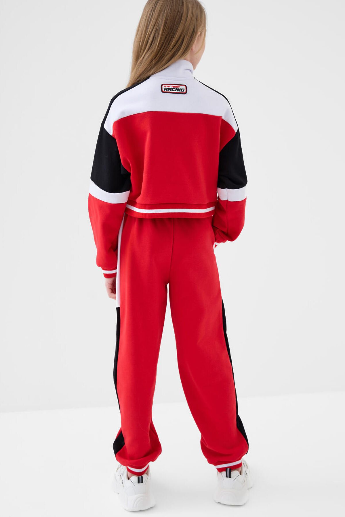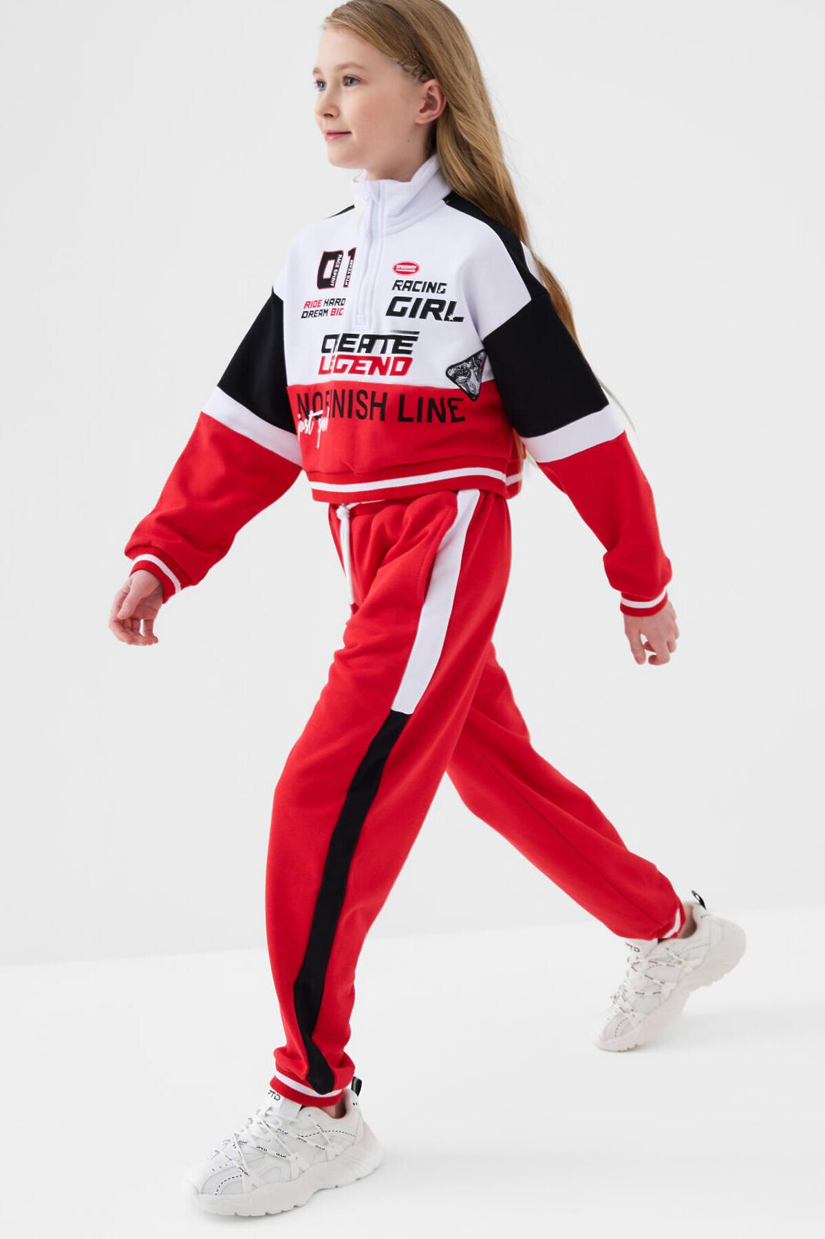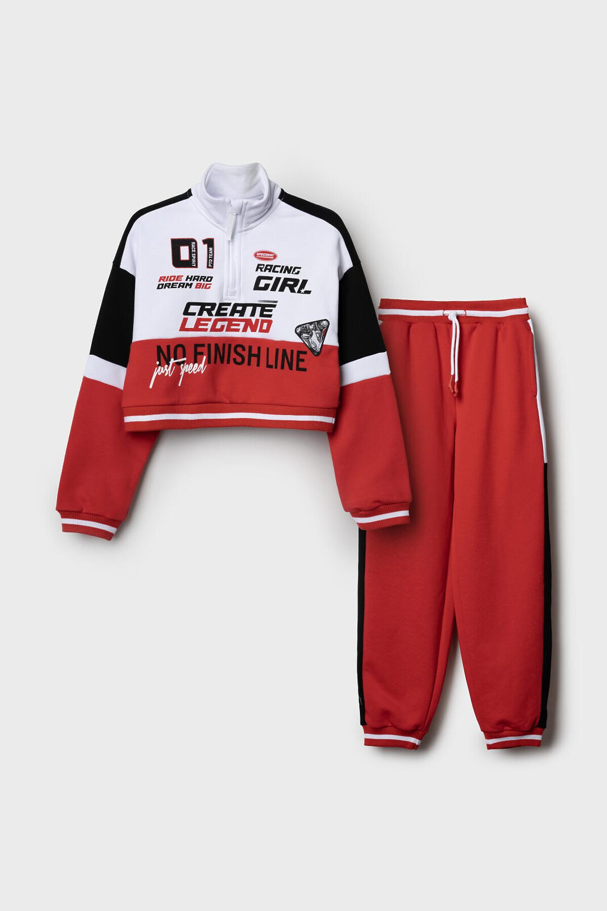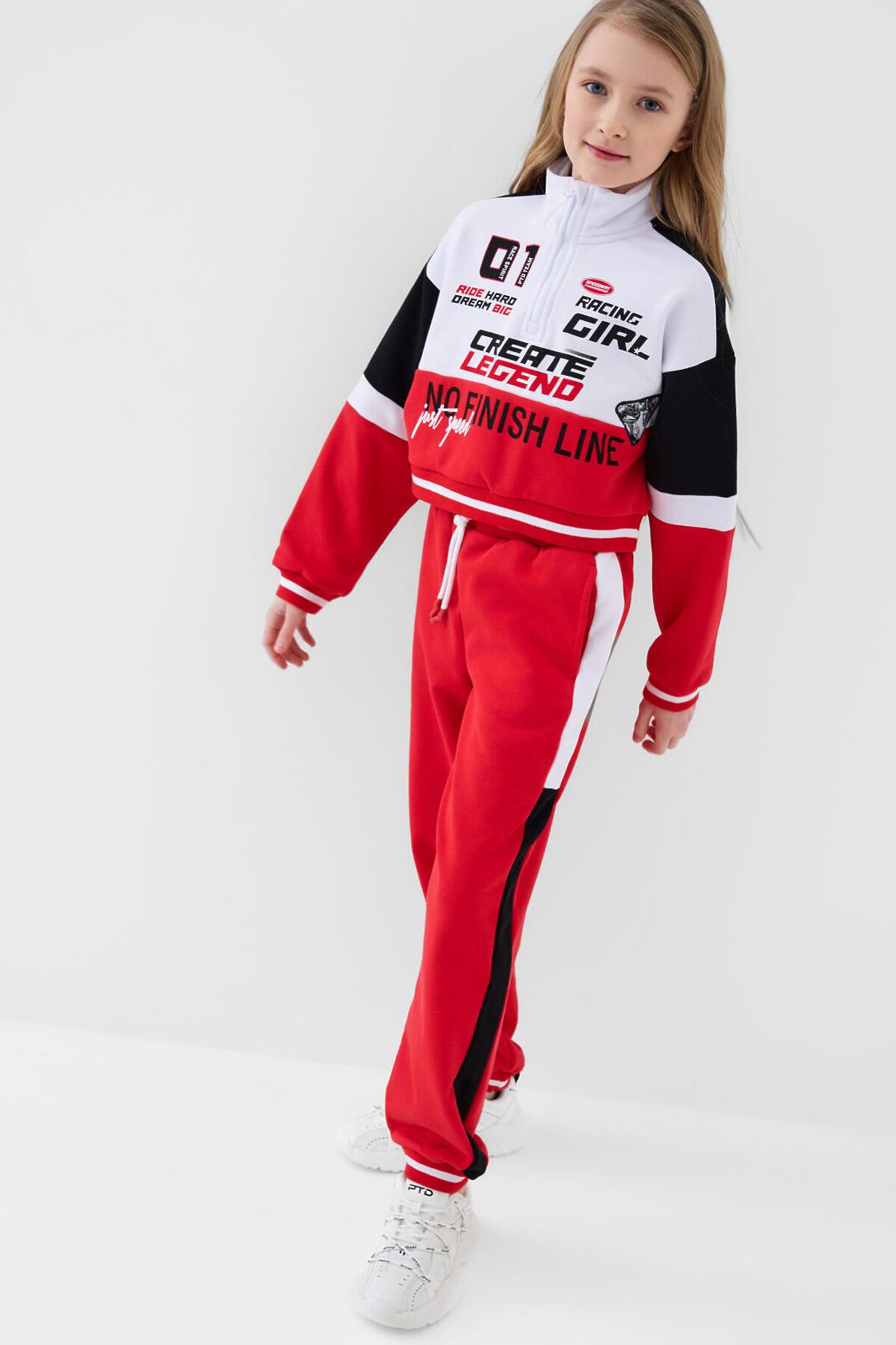 Спортивный костюм для девочки подростка. Комплект выполнен из хлопкового футера и состоит из укороченной толстовки и джогеров на резинке. Толстовка оверсайз с высоким воротником-стойкой. Модель украшена принтами и нашивками в гоночной тематике. Планка с застежкой на молнию. Манжеты и пояс выполнены из эластичного риба, благодаря чему изделие хорошо держит форму. Брюки джоггеры — комфортные, с эластичным поясом и шнуром для регулировки посадки. Удобные боковые карманы. Низ штанин собран на резинку.