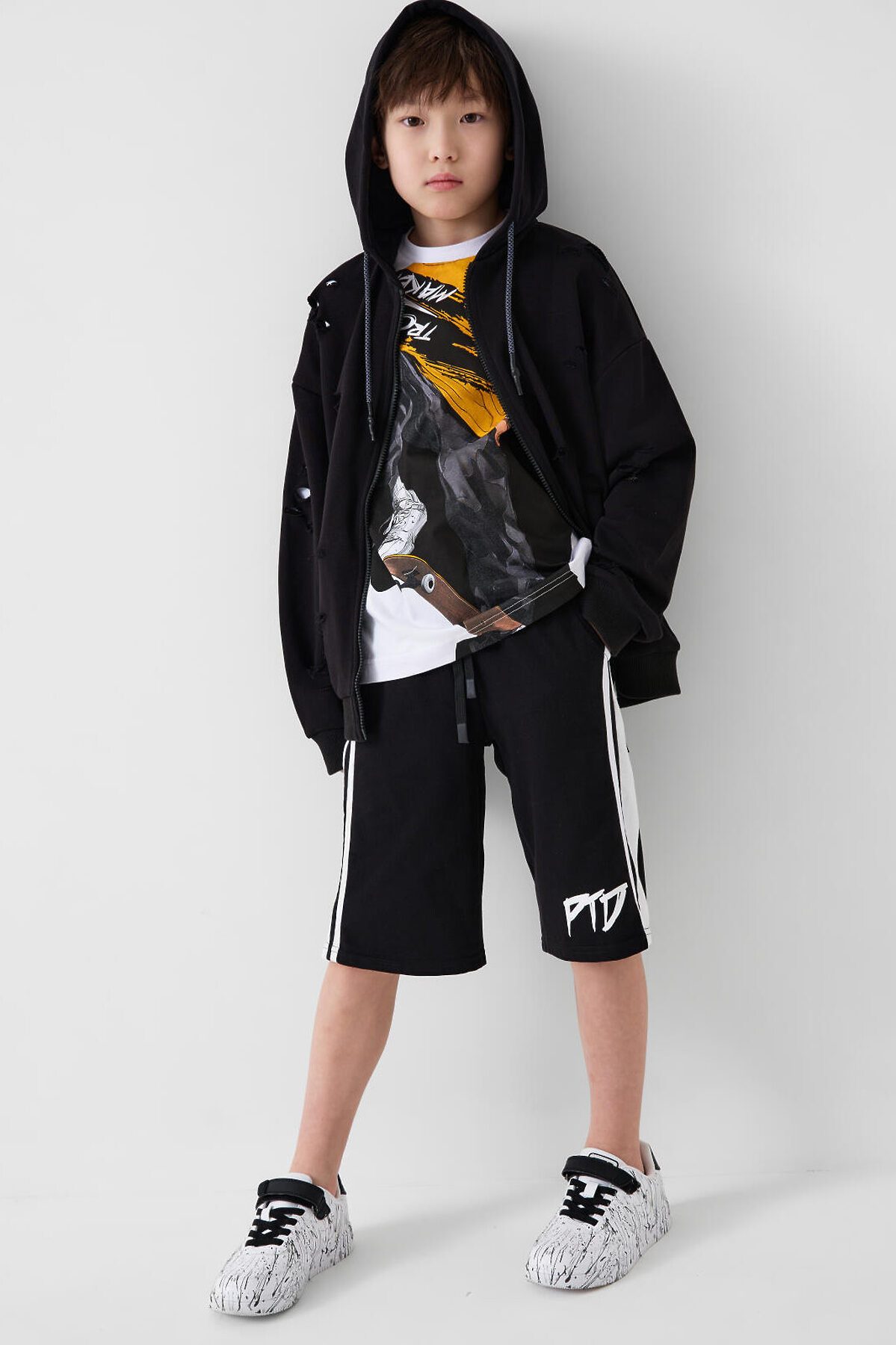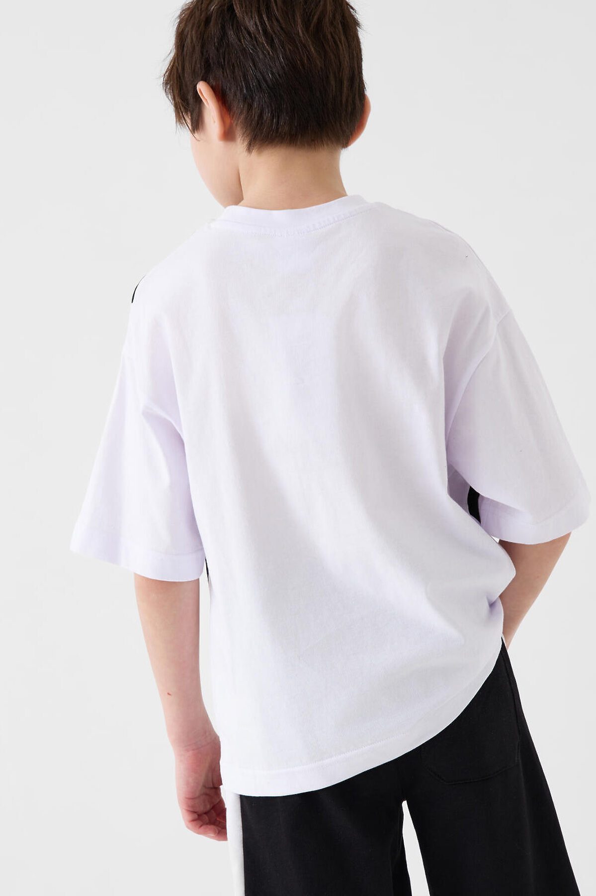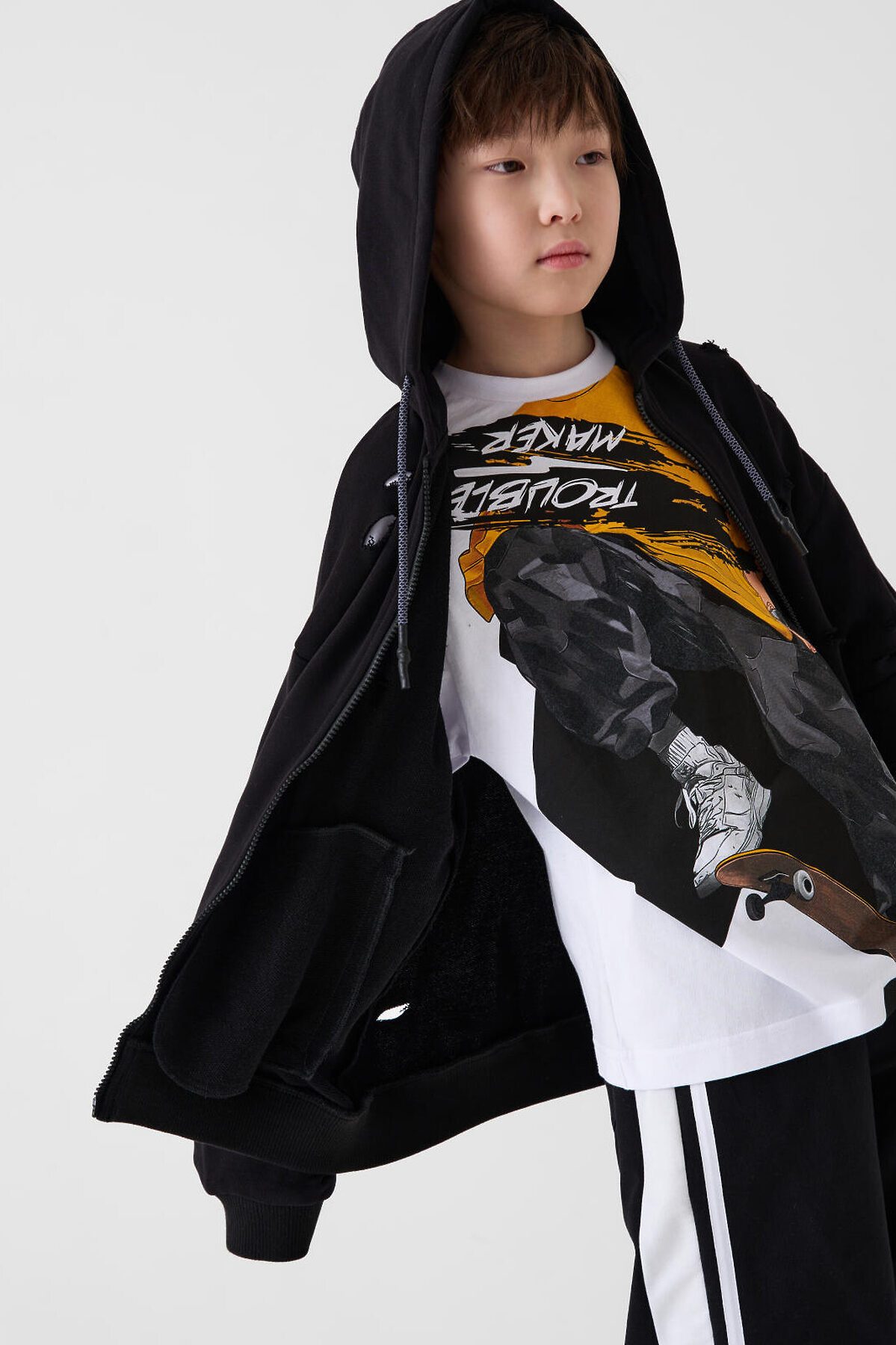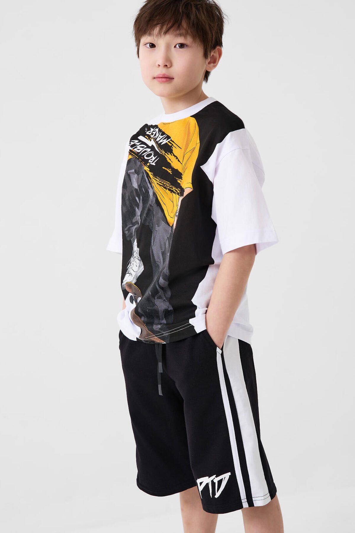 Футболка оверсайз для мальчика подростка. Модель выполнена из эластичного хлопкового трикотажа джерси. На груди расположен крупный принт с изображением скейтера. Горловина круглая, обработана эластичным рибом.