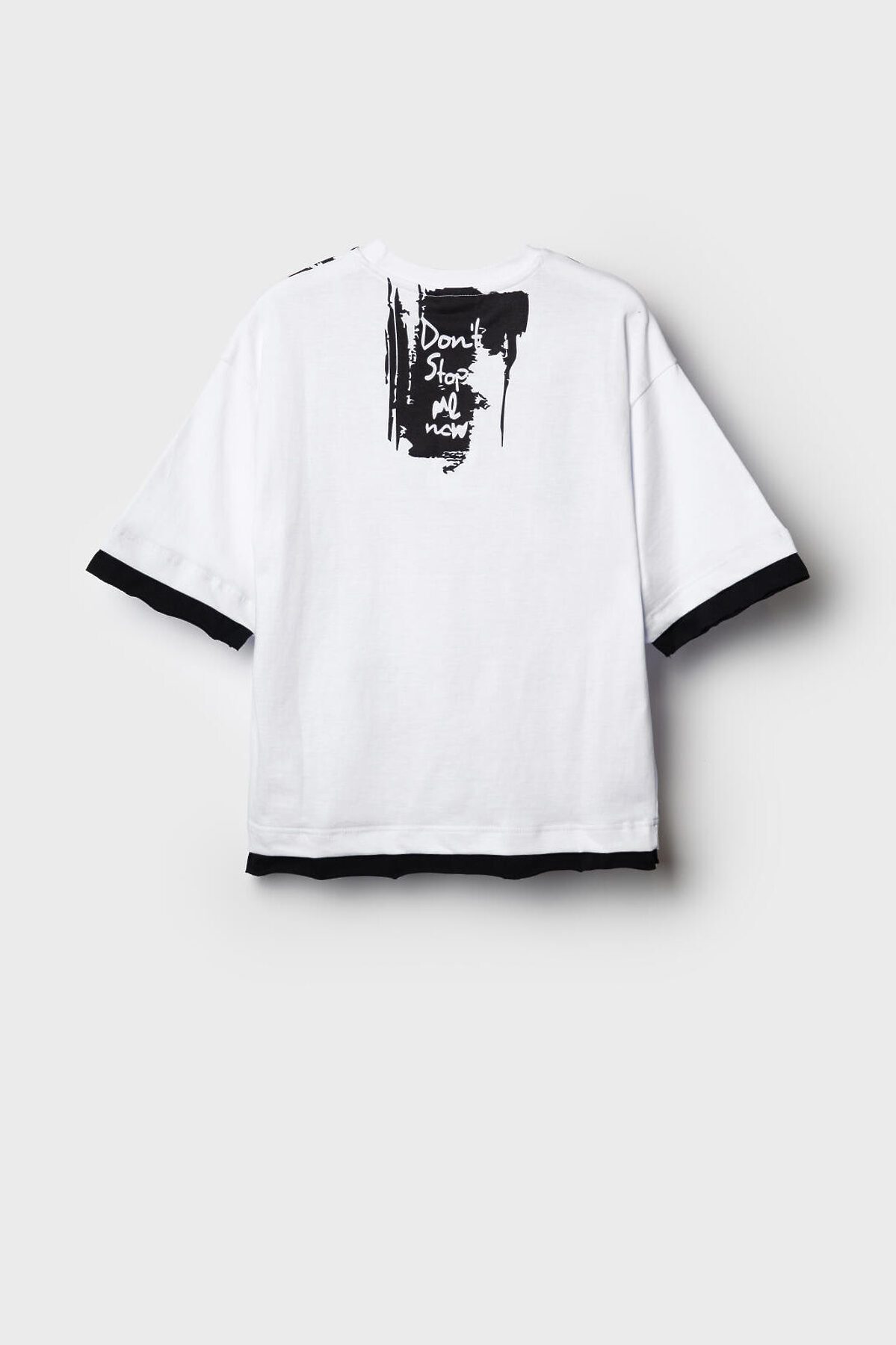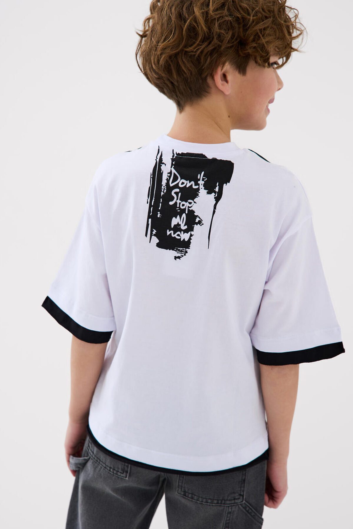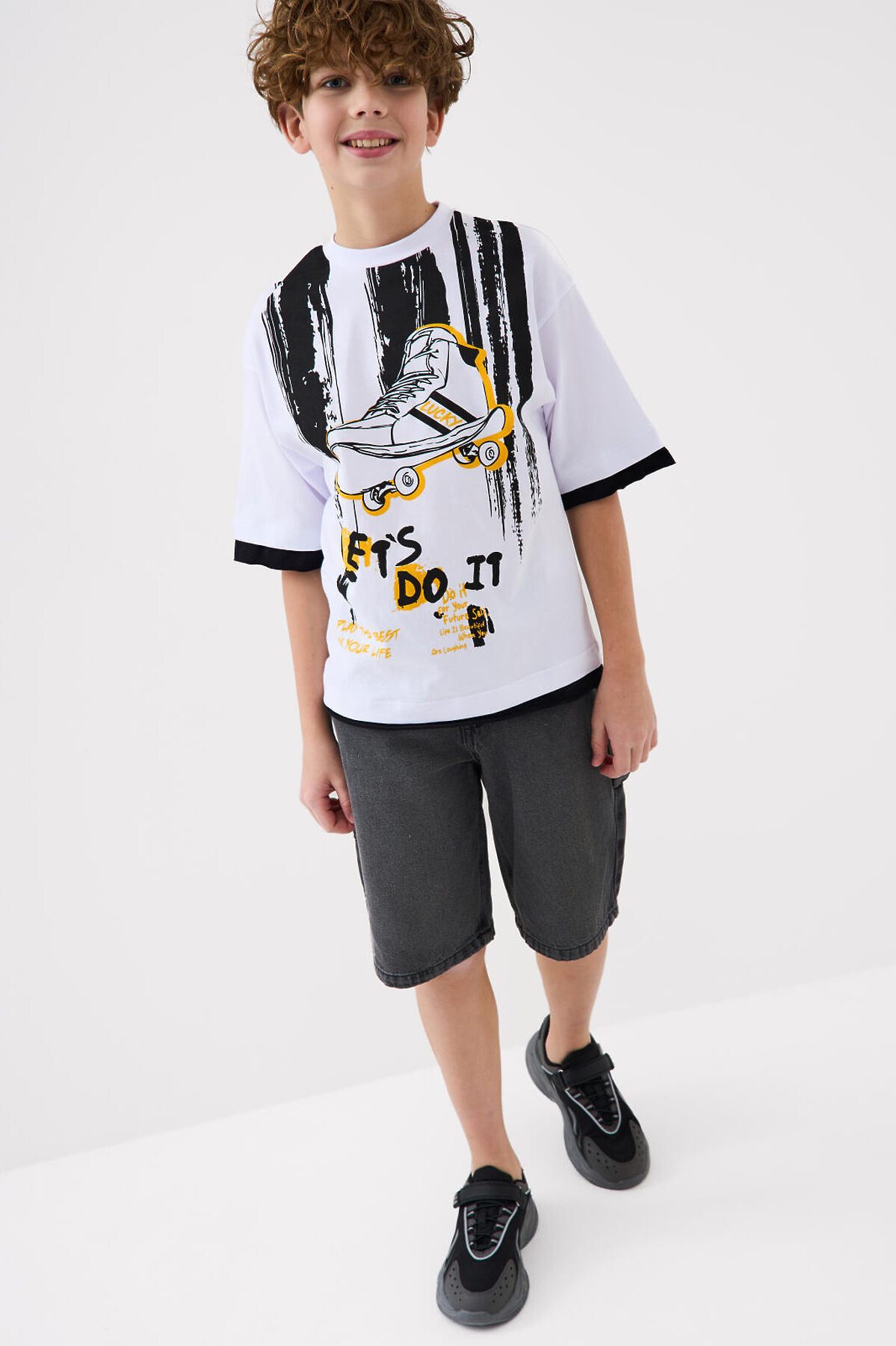 Футболка оверсайз для мальчика подростка. Модель выполнена из эластичного хлопкового трикотажа джерси. Спереди и по спинке расположен крупный принт. Горловина круглая, обработана эластичным рибом.