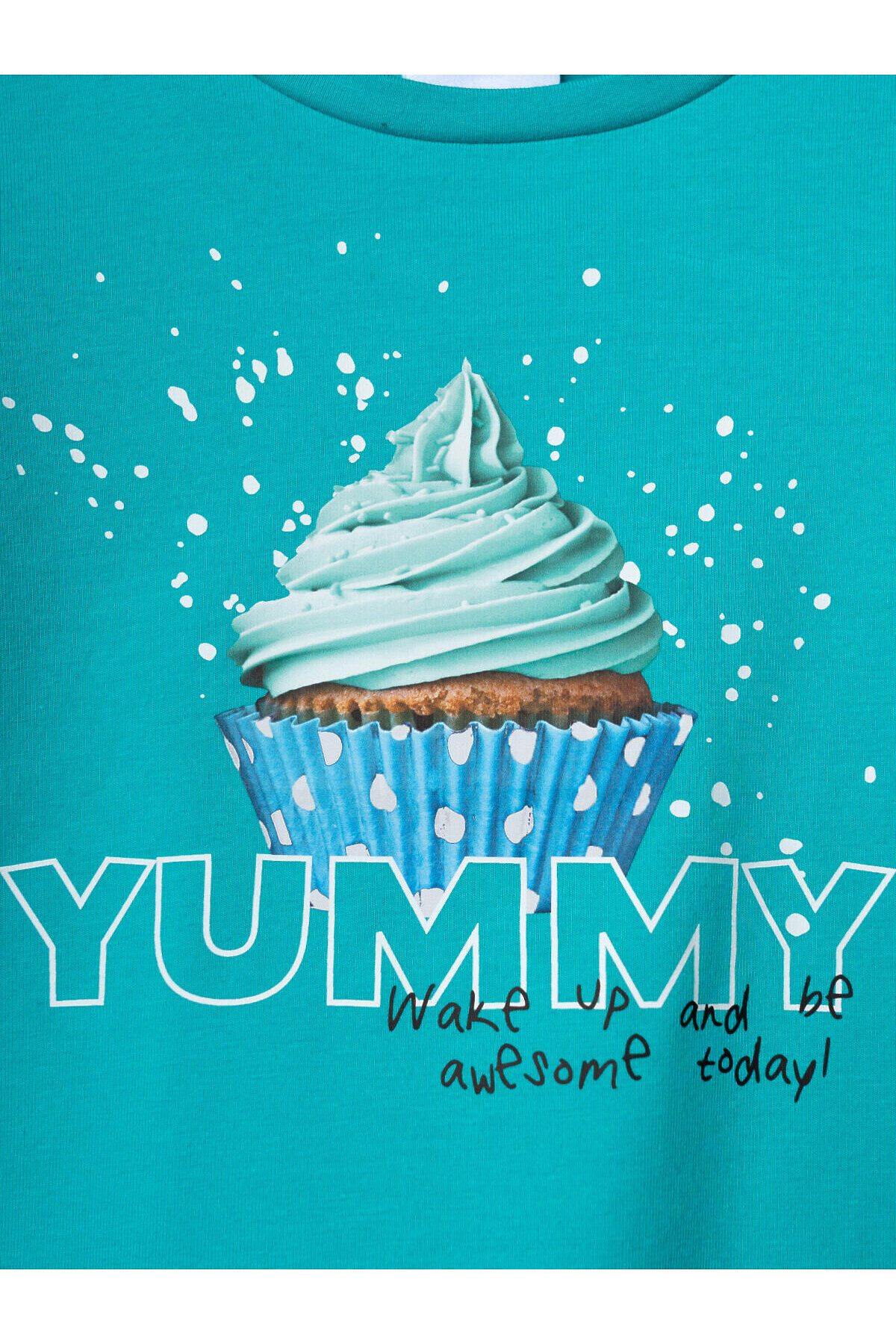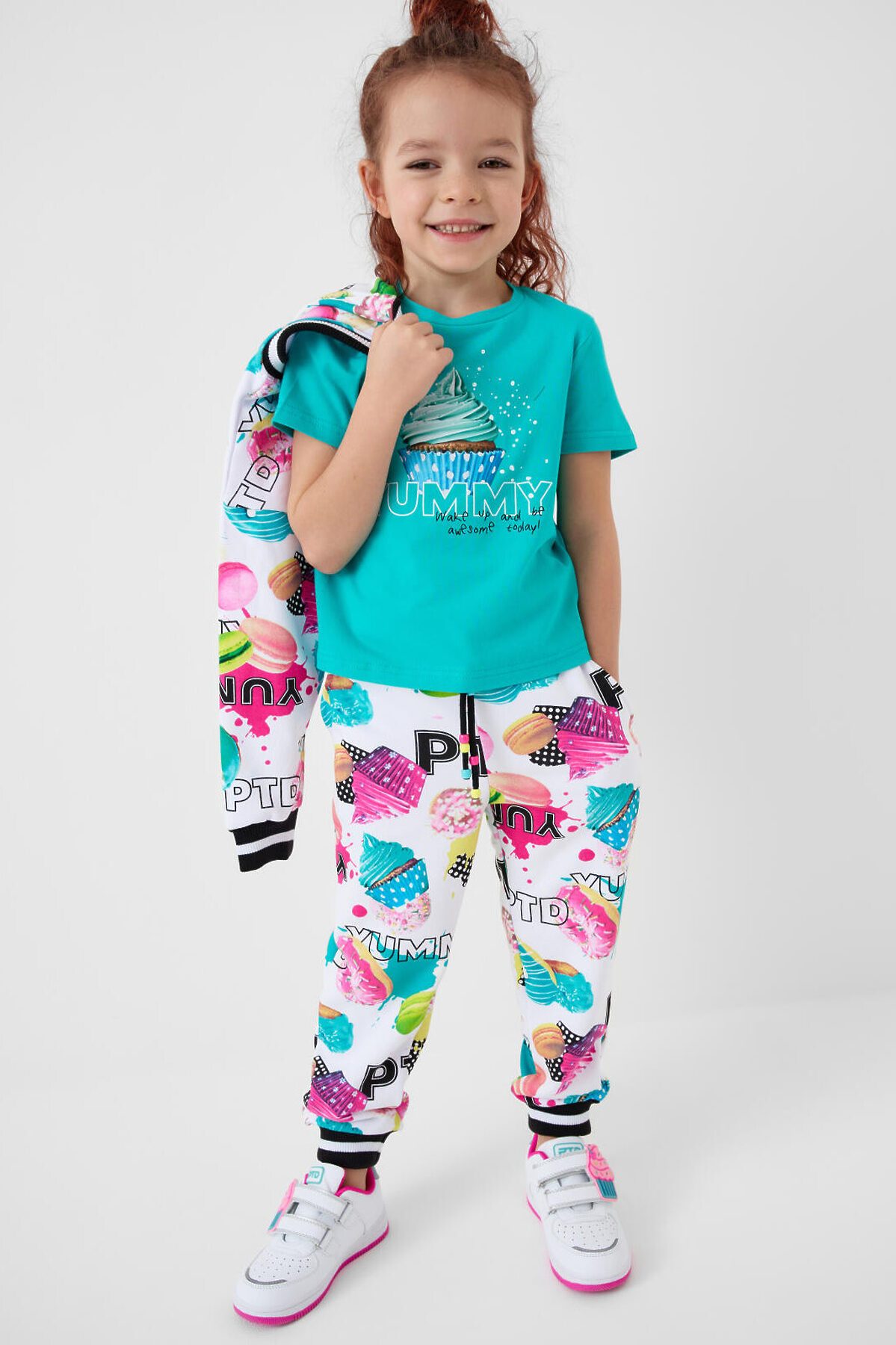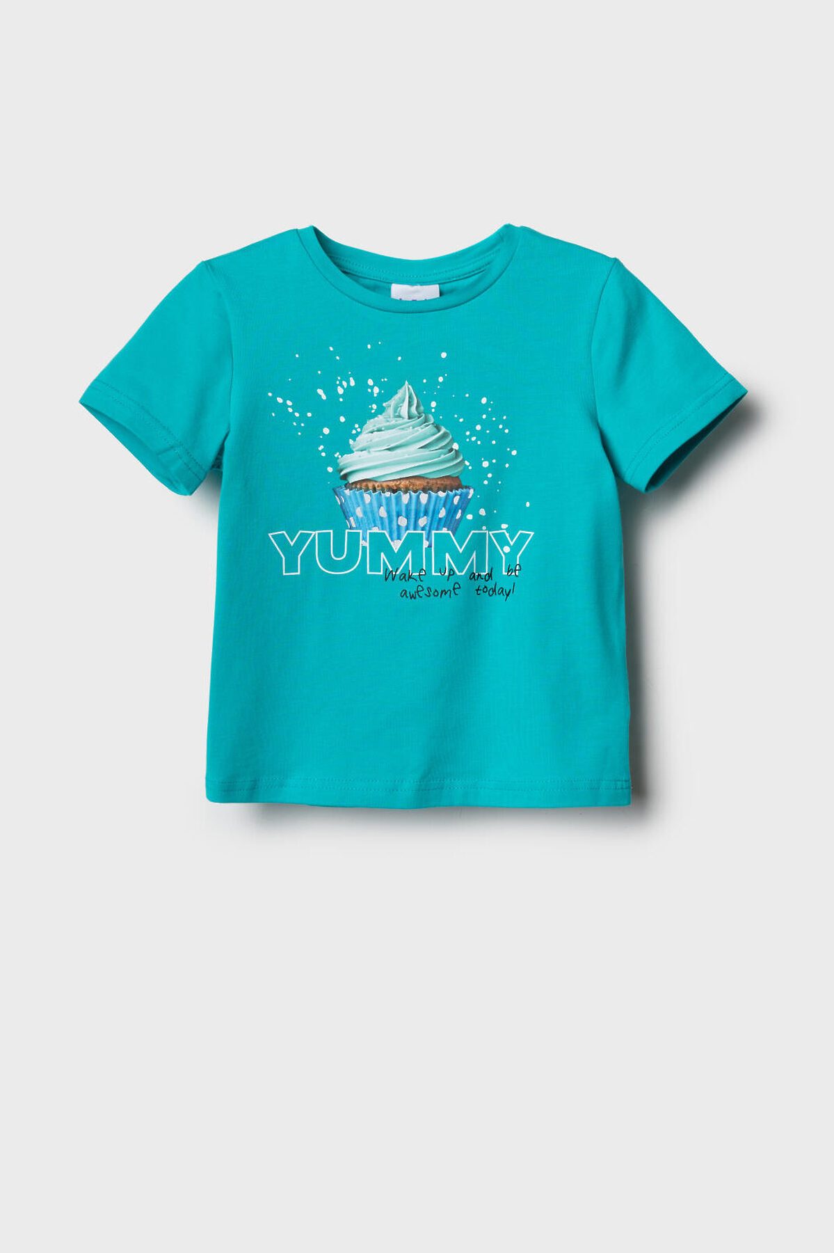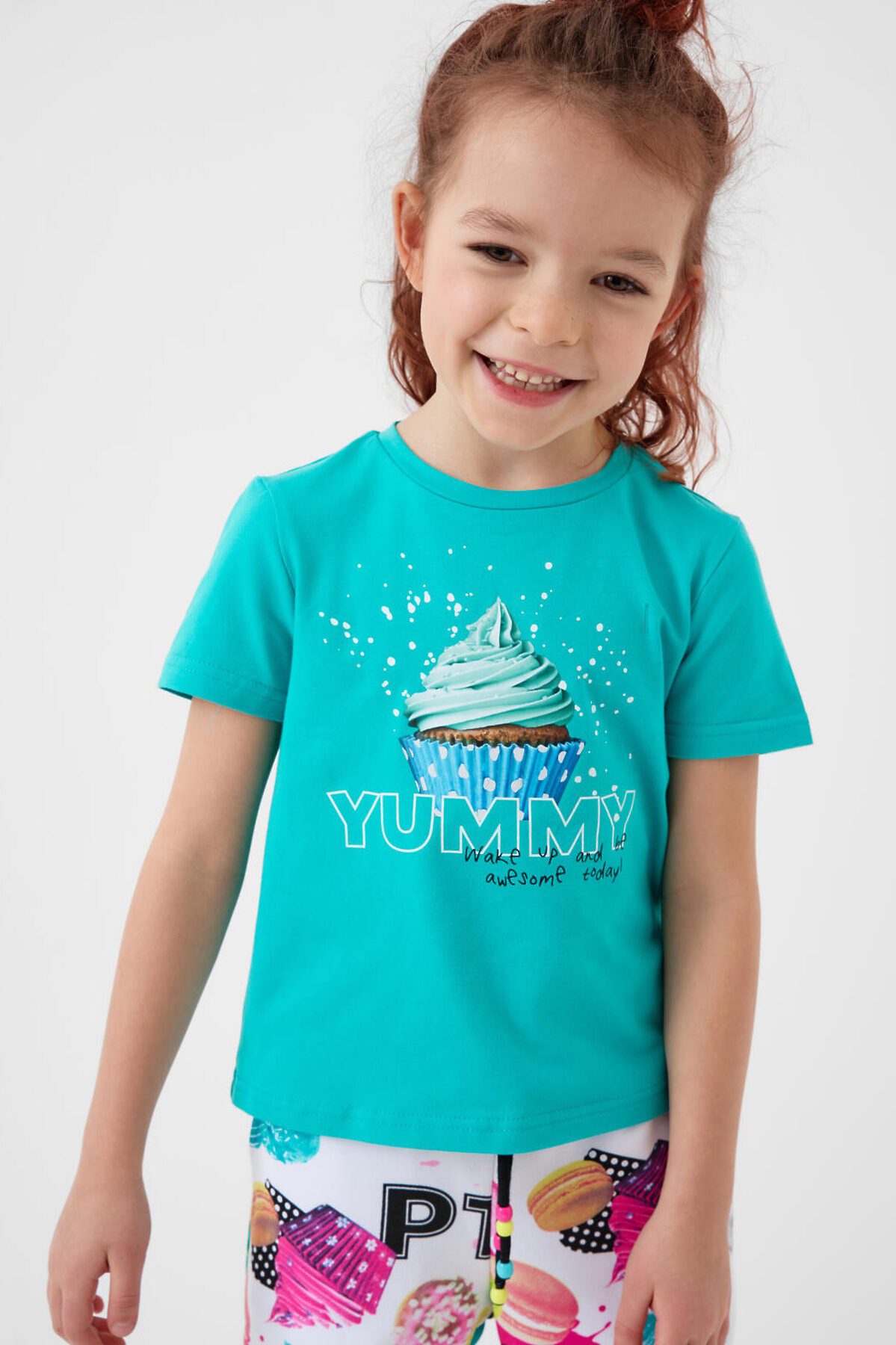 Детская футболка для девочки. Модель прямого кроя, выполнена из эластичного хлопкового трикотажа джерси. Спереди расположен крупный принт с капкейком. Горловина круглая.