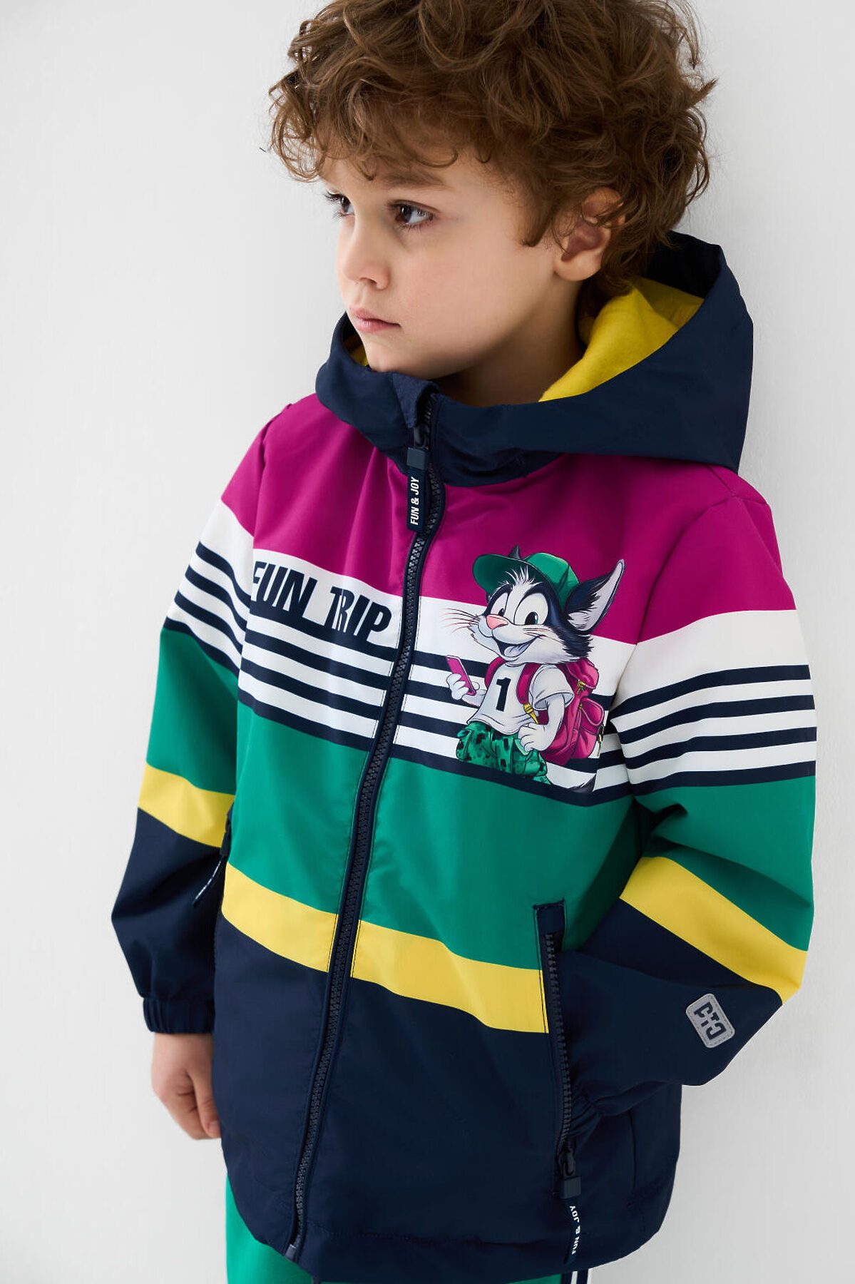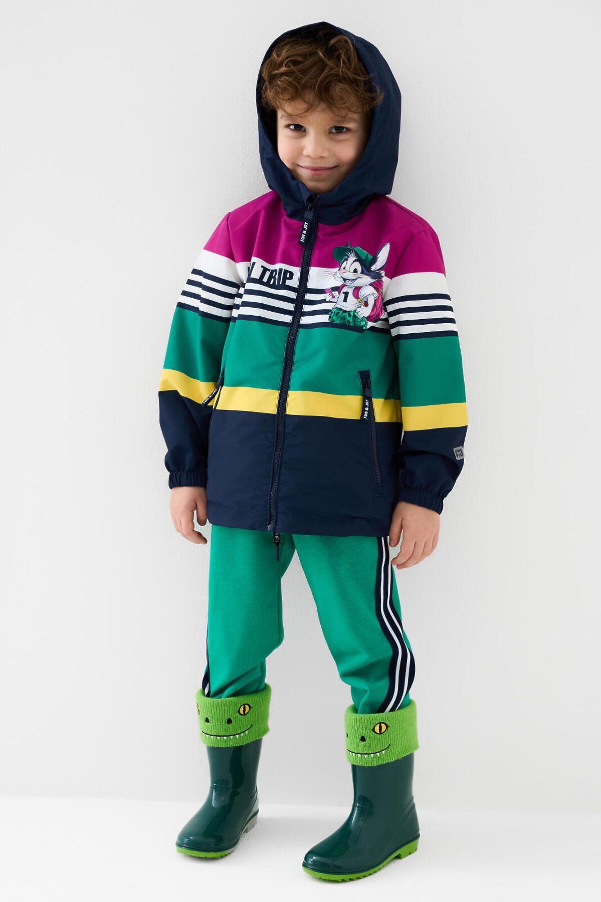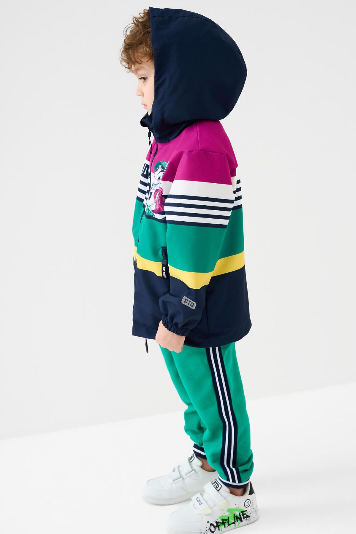 Детская ветровка с мембраной для мальчика. Температурный режим от +20С до +10С. Ткань с мембранным покрытием 5000х5000 обеспечивает защиту от ветра и влаги. Внутри мягкая подкладка из трикотажа для комфортной носки. Модель прямого кроя средней длины с ярким дизайном. Капюшон несъёмный, регулируется резинкой со стопперами для плотного прилегания. Центральная застёжка — молния, дополнена внутренней планкой от ветра. По бокам расположены два кармана на молнии. Низ изделия с утяжкой стопперами. Манжеты на резинке для защиты от продувания. На рукавах и спинке размещены светоотражающие элементы для дополнительной безопасности ребёнка в тёмное время суток.