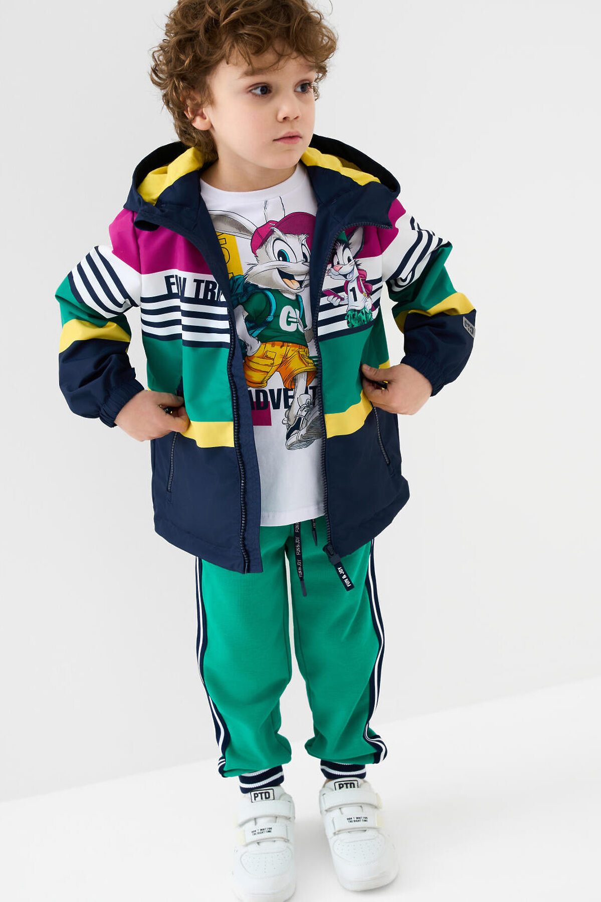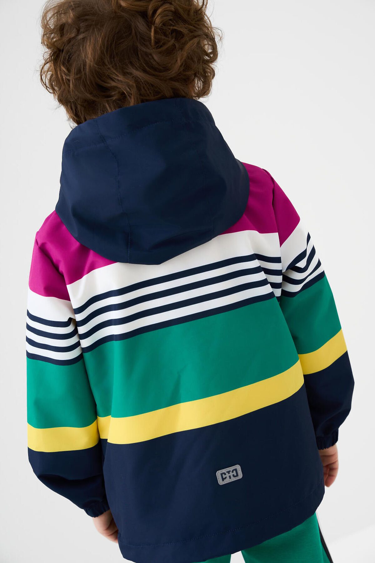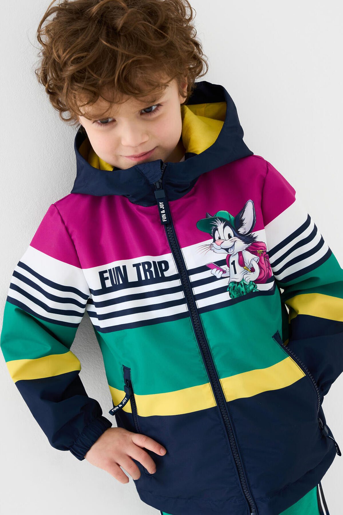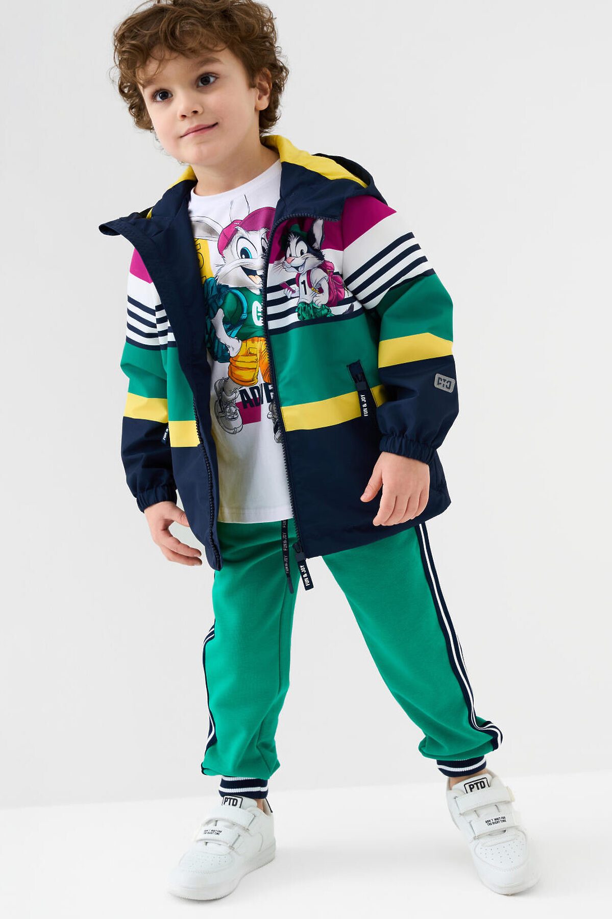 Детская ветровка с мембраной для мальчика. Температурный режим от +20С до +10С. Ткань с мембранным покрытием 5000х5000 обеспечивает защиту от ветра и влаги. Внутри мягкая подкладка из трикотажа для комфортной носки. Модель прямого кроя средней длины с ярким дизайном. Капюшон несъёмный, регулируется резинкой со стопперами для плотного прилегания. Центральная застёжка — молния, дополнена внутренней планкой от ветра. По бокам расположены два кармана на молнии. Низ изделия с утяжкой стопперами. Манжеты на резинке для защиты от продувания. На рукавах и спинке размещены светоотражающие элементы для дополнительной безопасности ребёнка в тёмное время суток.