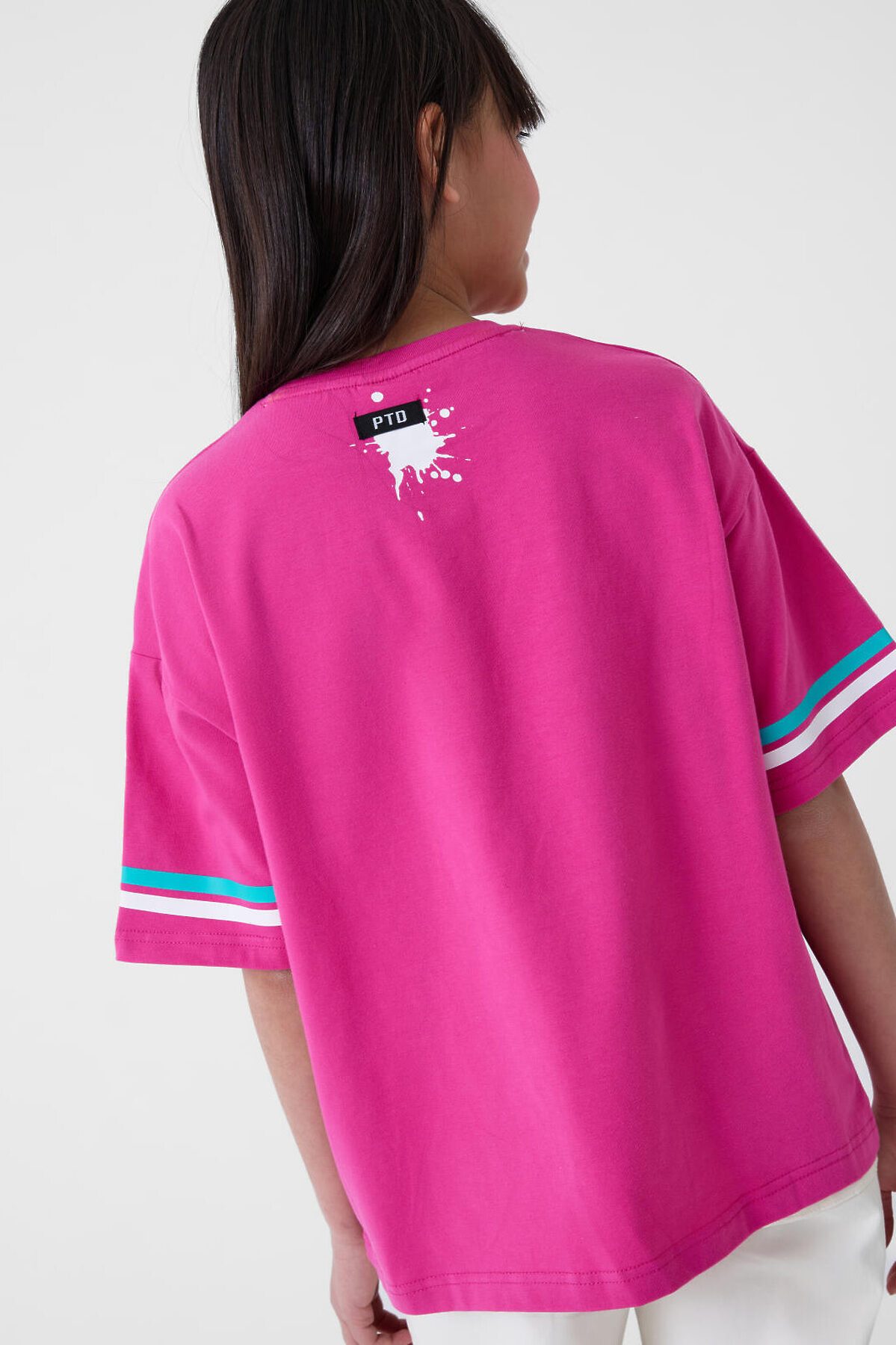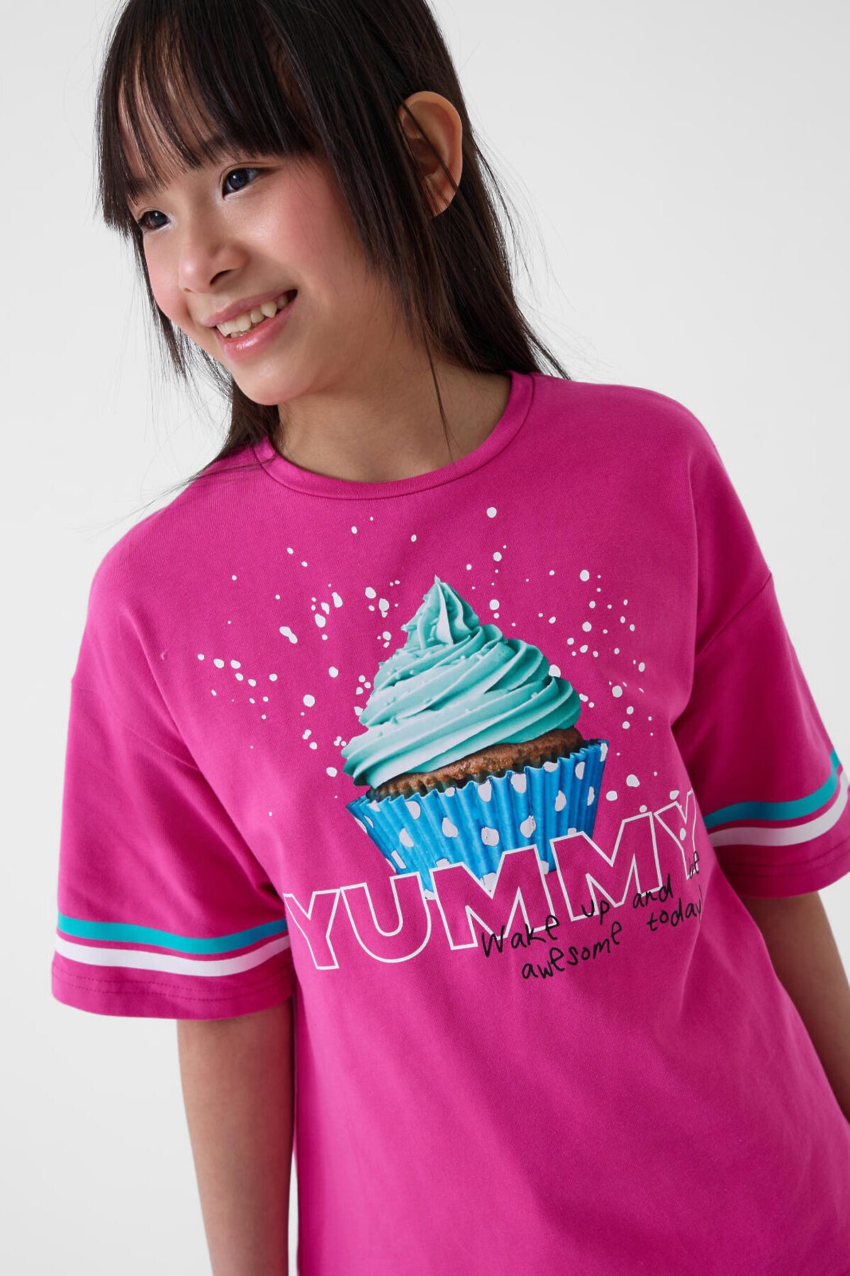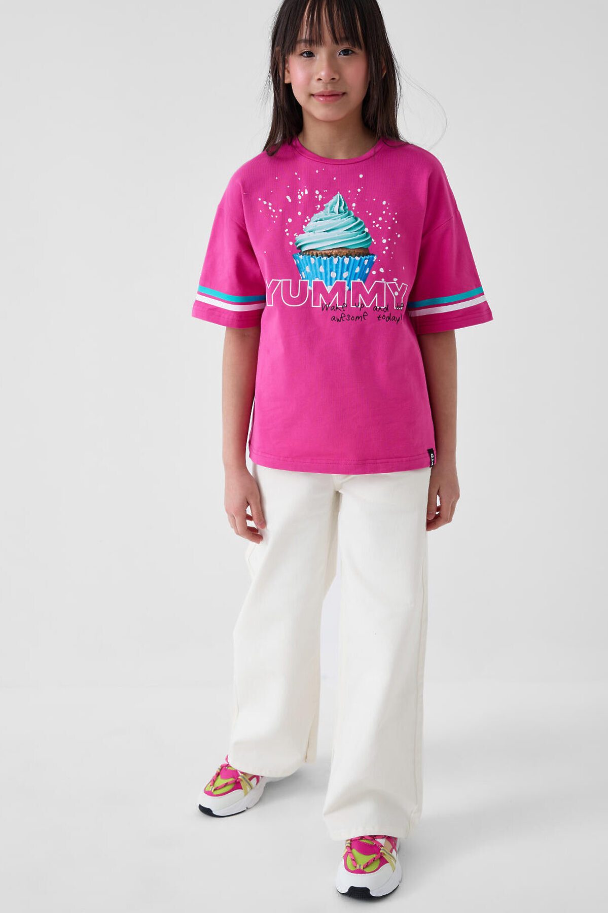 Футболка оверсайз для девочки подростка. Модель выполнена из эластичного хлопкового трикотажа джерси. На груди расположен крупный принт с изображением капкейка. Горловина круглая. В нижней части — небольшая нашивка.