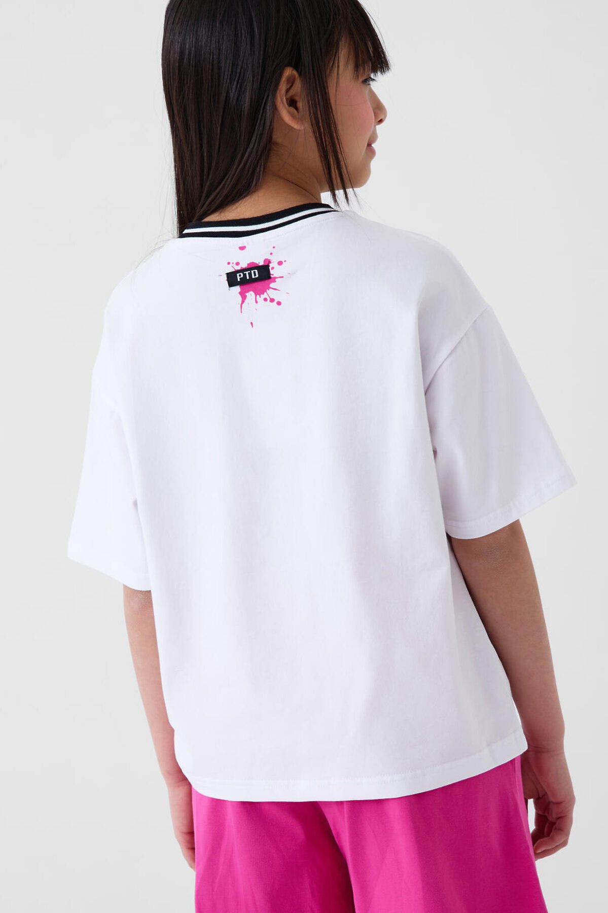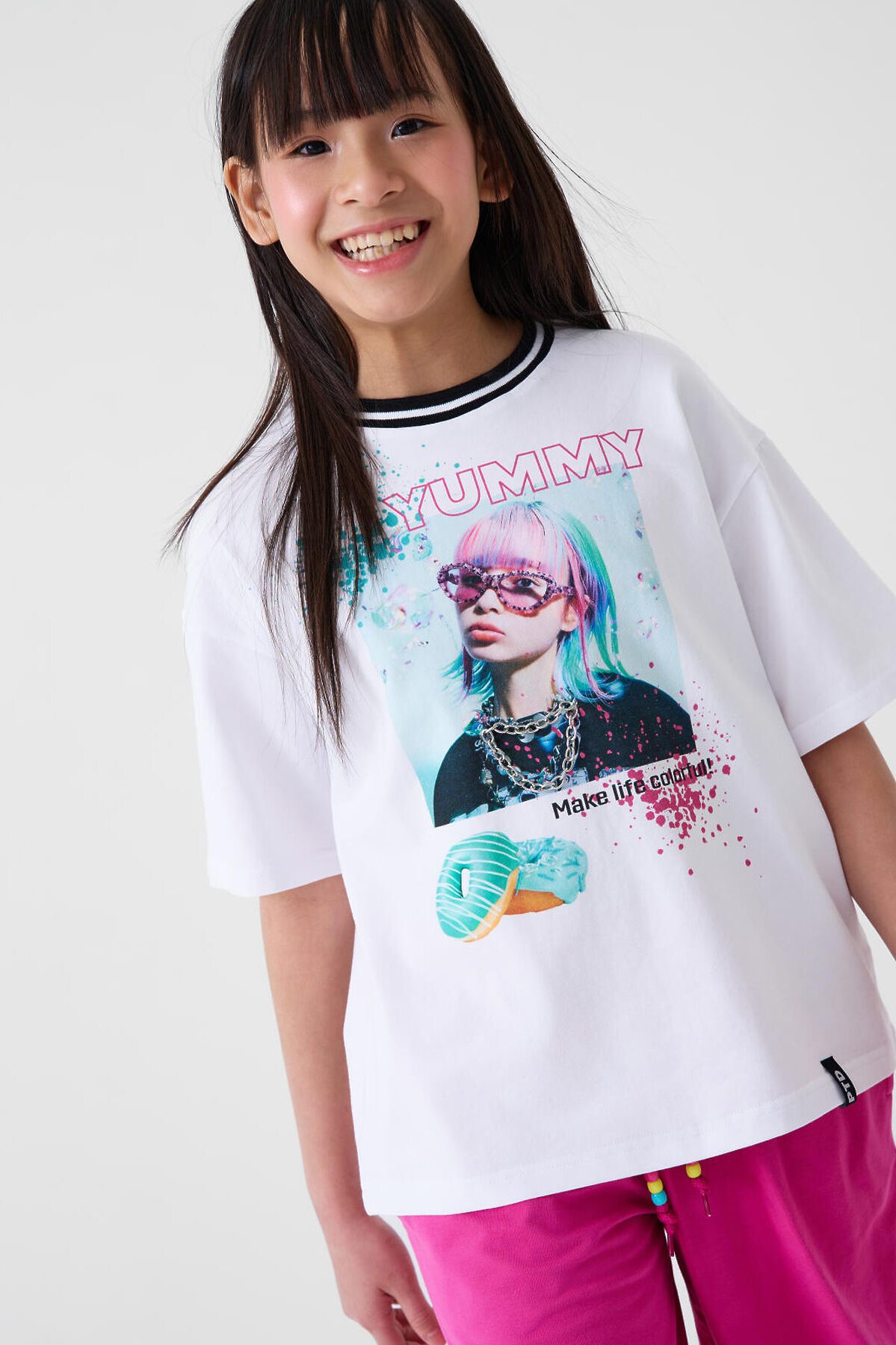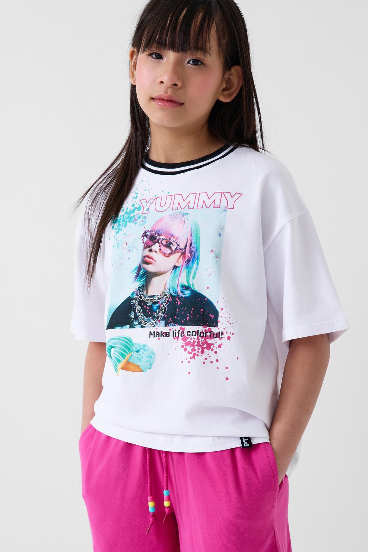 Футболка оверсайз для девочки подростка. Модель выполнена из эластичного хлопкового трикотажа джерси. На груди расположен крупный красочный принт. Горловина круглая, обработана эластичным рибом. В нижней части — небольшая нашивка.