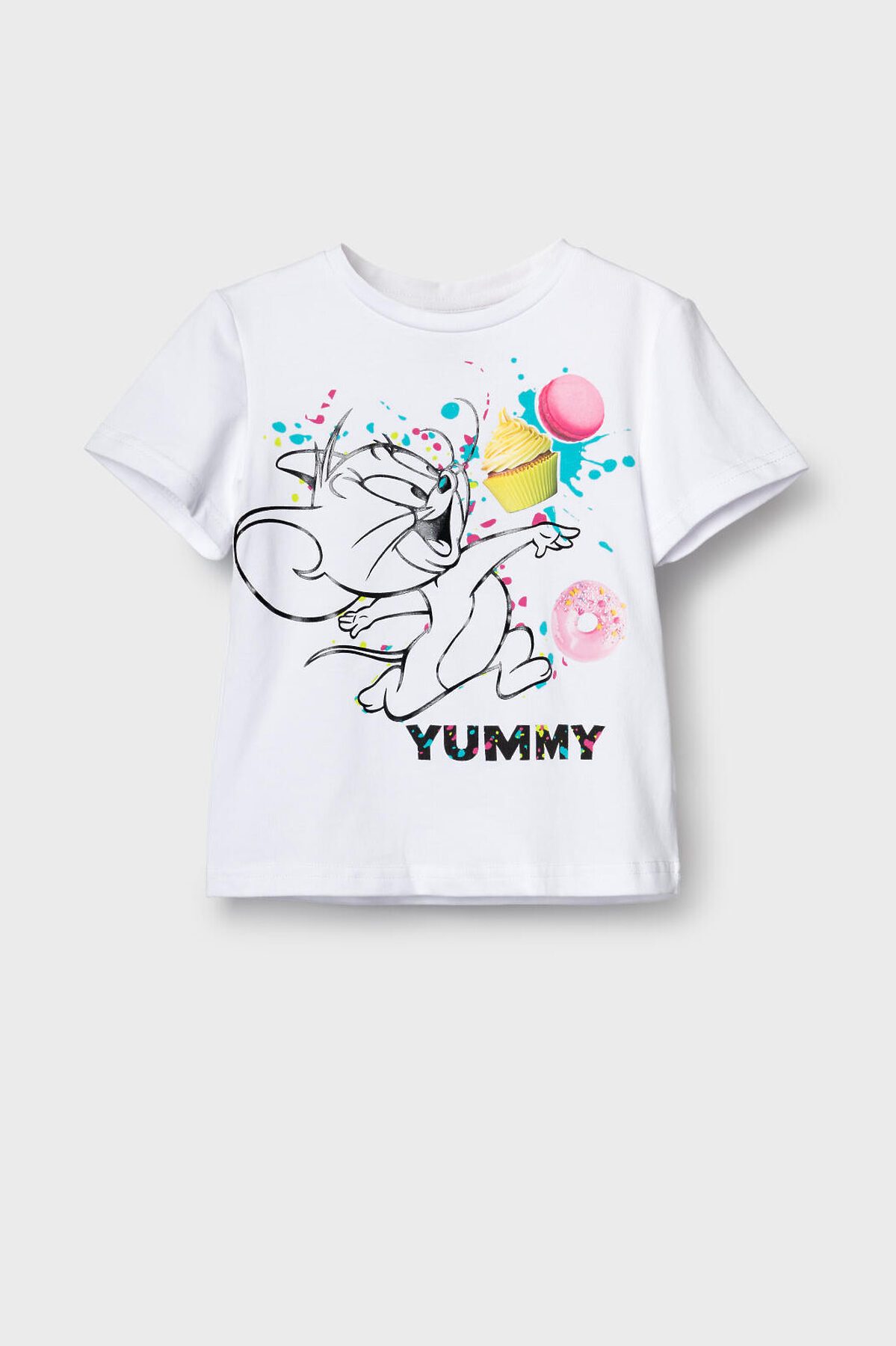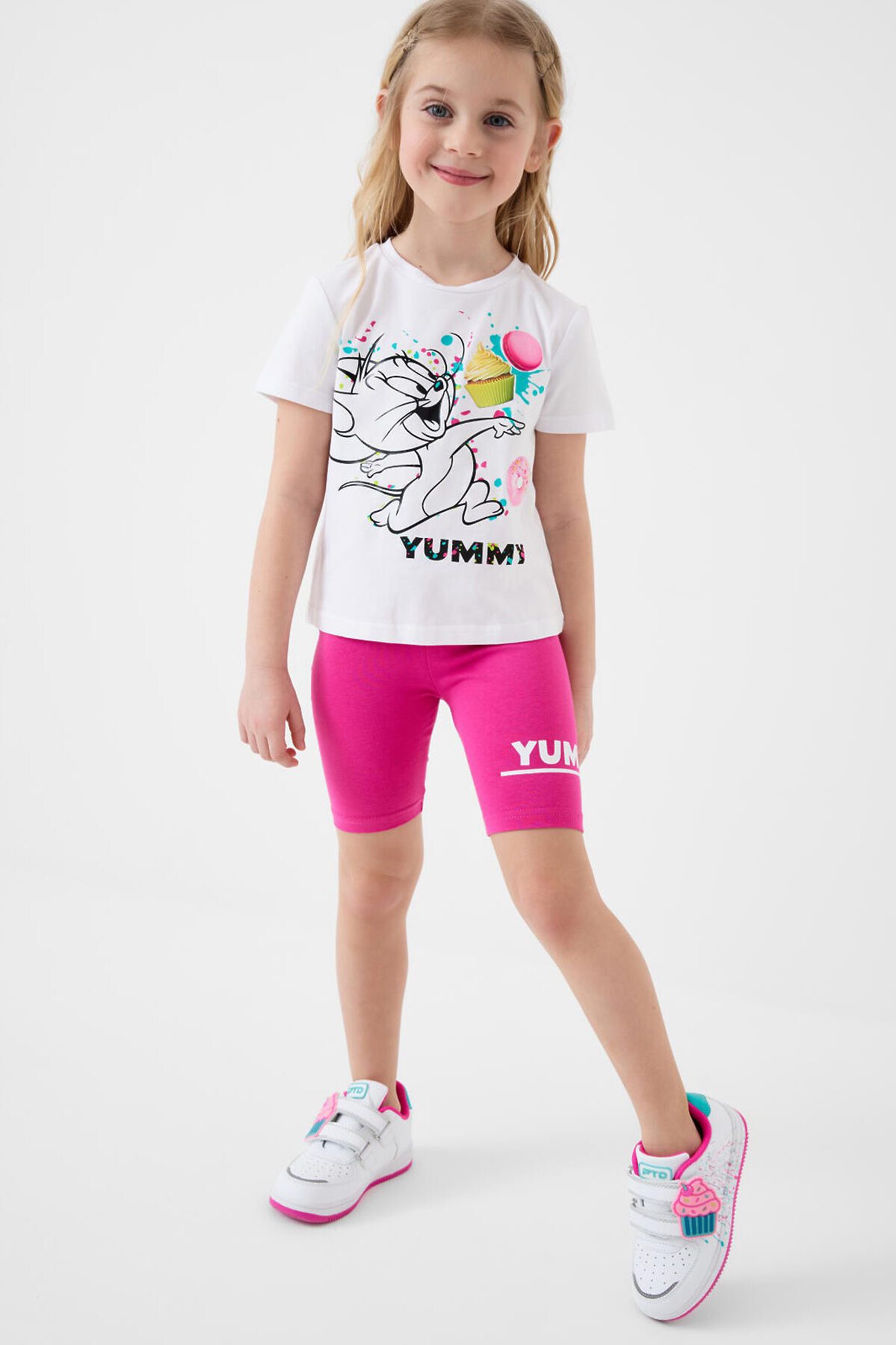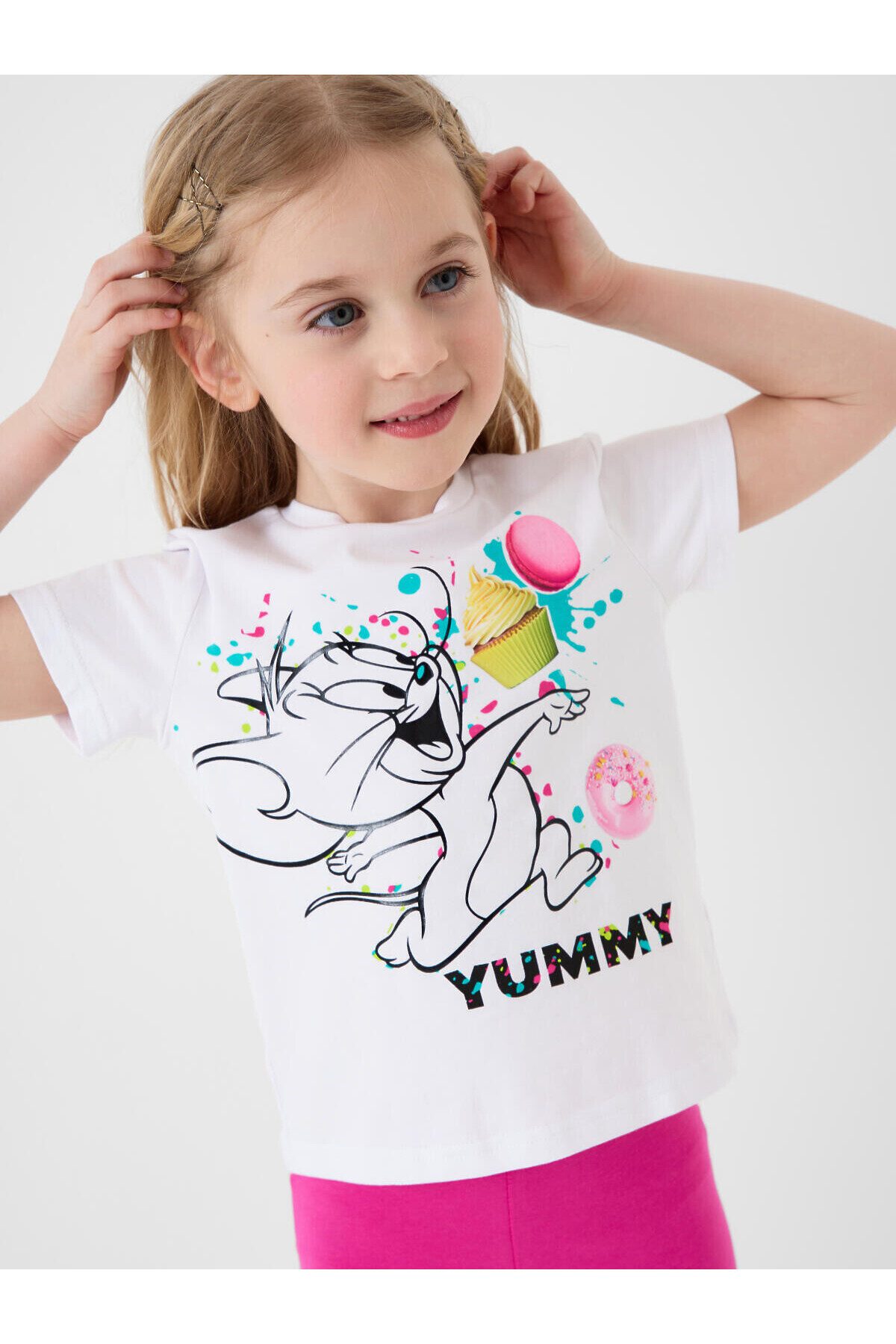 Детская футболка для девочки. Модель прямого кроя, выполнена из эластичного хлопкового трикотажа джерси. Спереди расположен крупный принт с любимым персонажем "Том и Джерри".