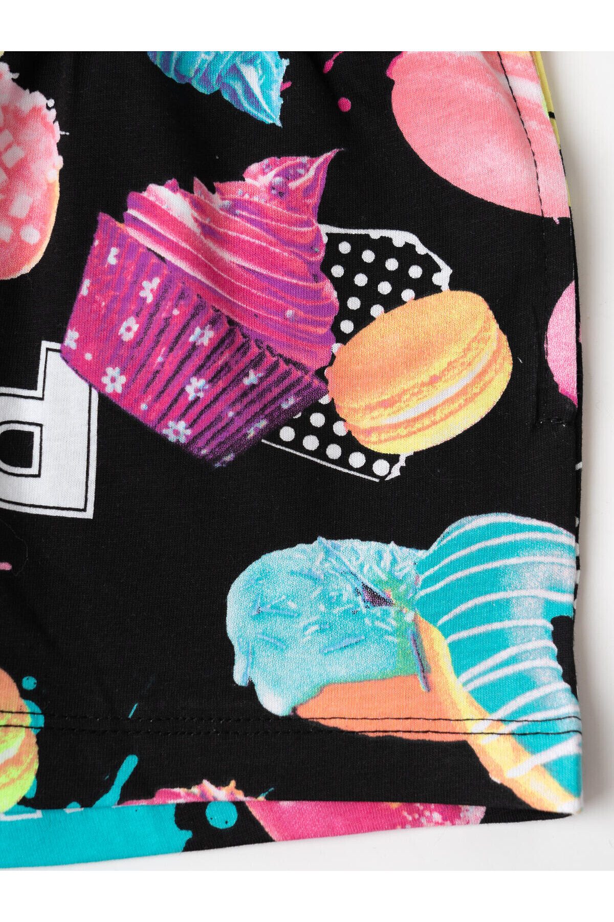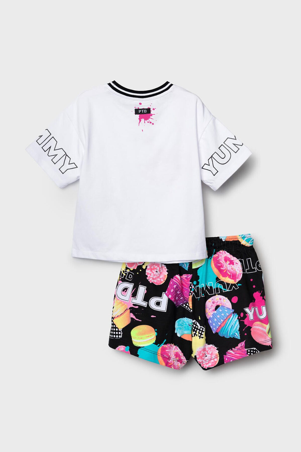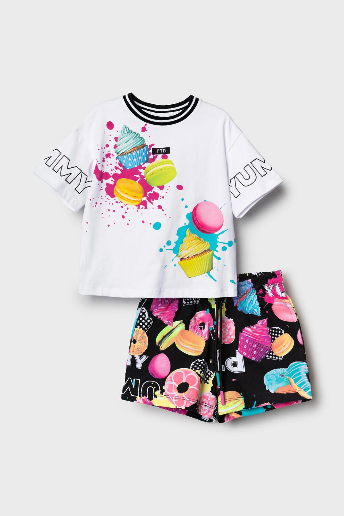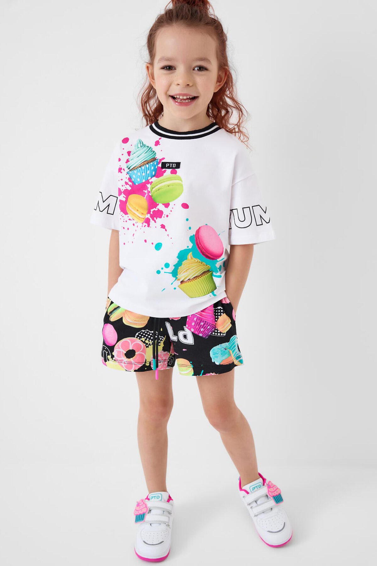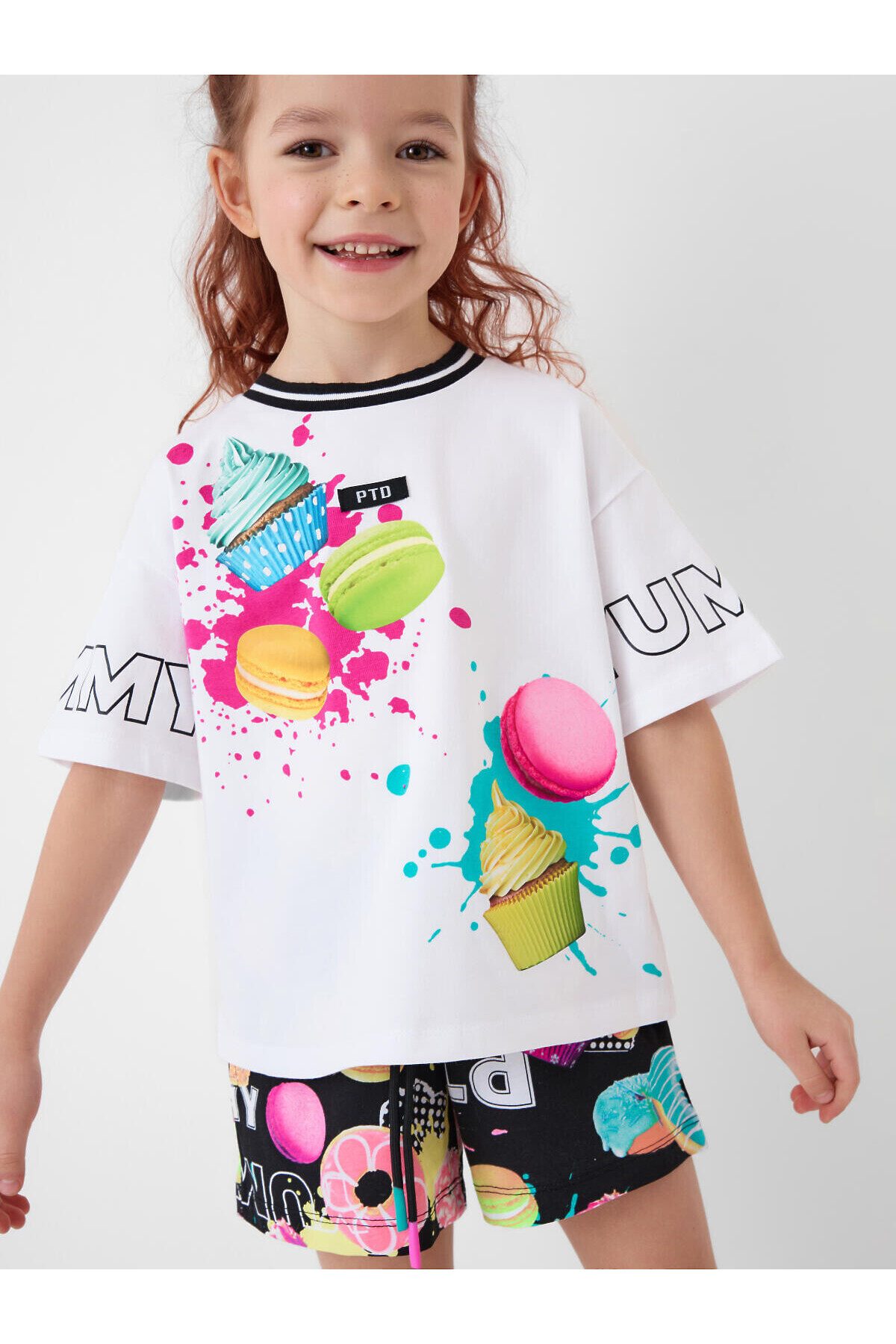 Детский костюм для девочки. Состоит из футболки с коротким рукавом и шорт. Выполнен из хлопкового трикотажа. Футболка оверсайз с красочным принтом. Шорты свободные, короткие, хорошо сидят на талии благодаря эластичному поясу и регулирующему шнурку. Удобные боковые карманы.