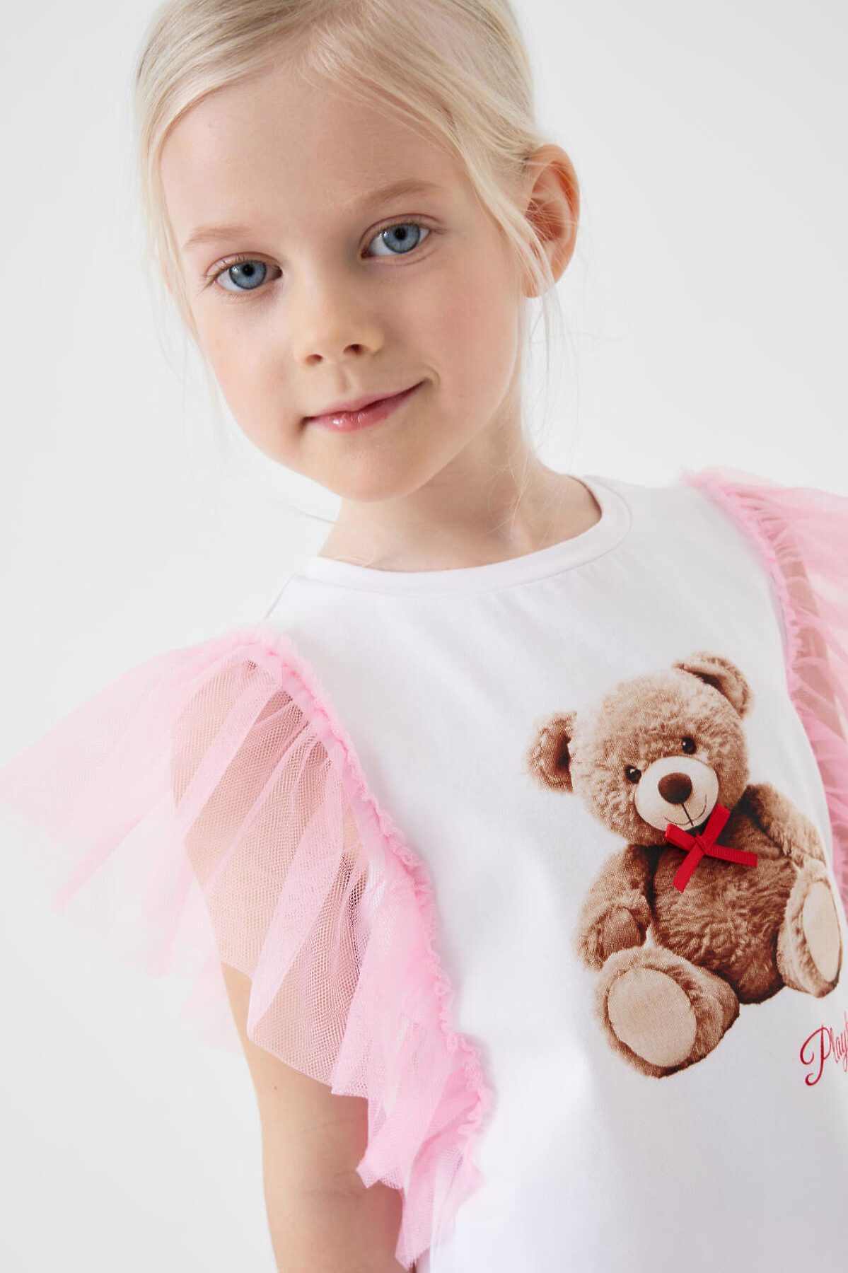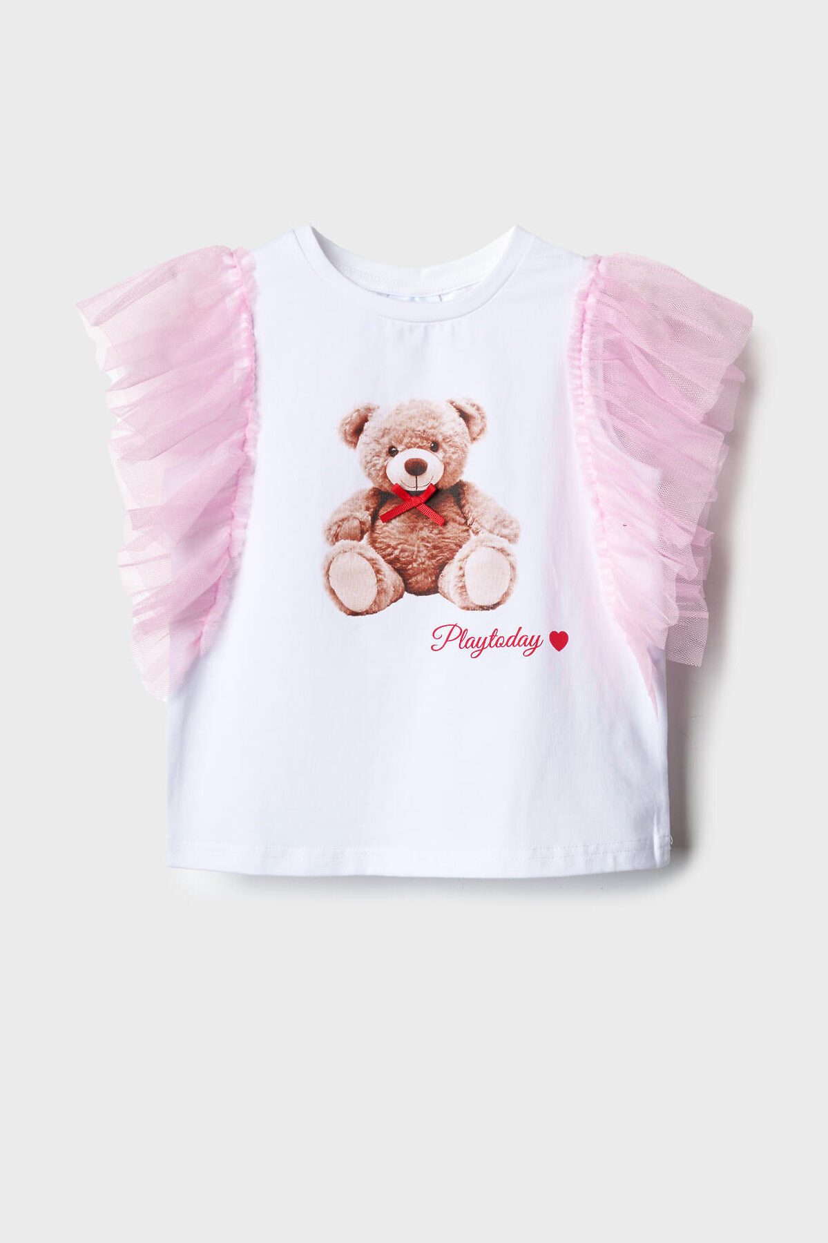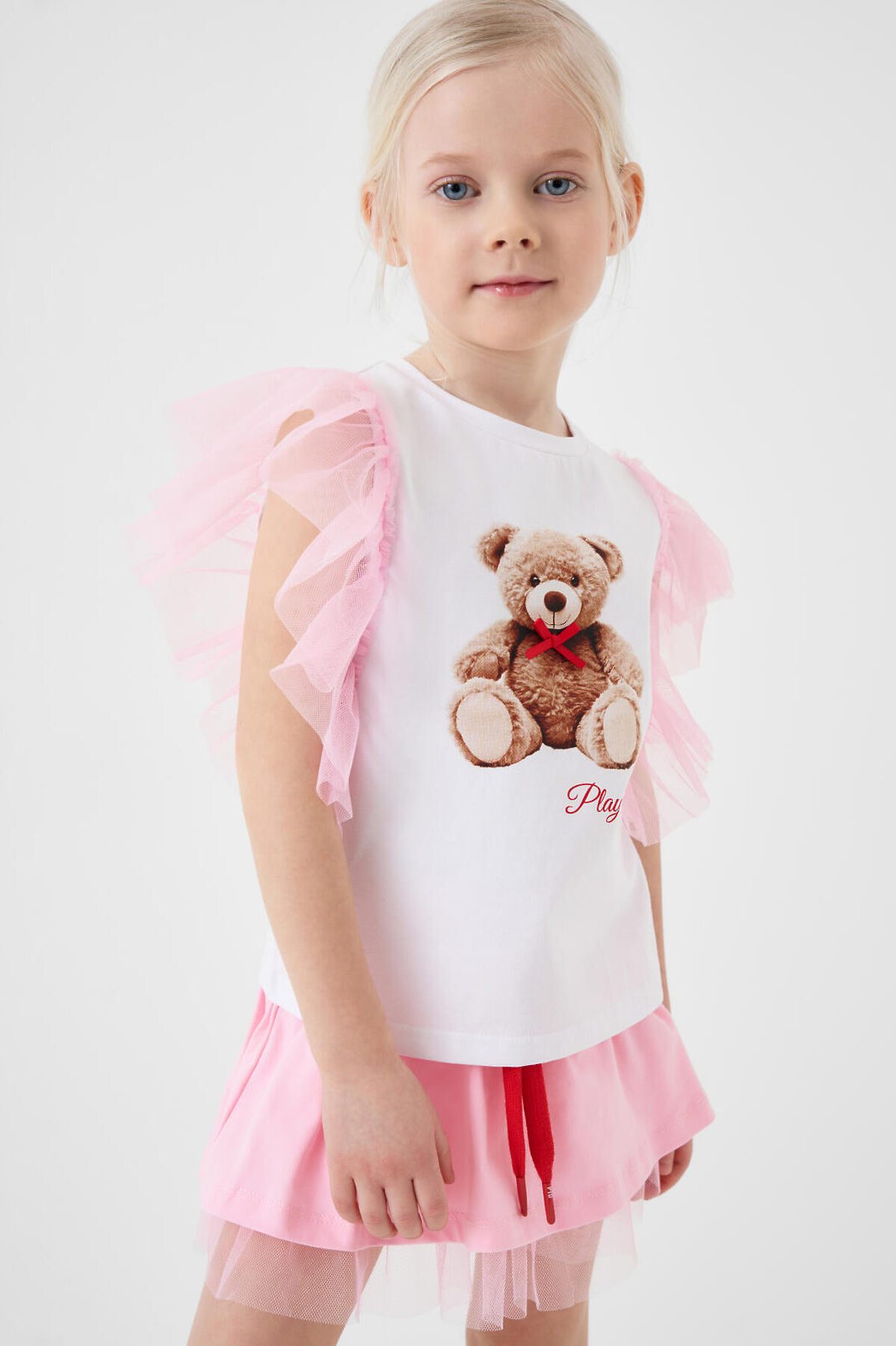 Детская футболка для девочки. Модель прямого кроя, выполнена из эластичного хлопкового трикотажа джерси. Спереди - принт с милым мишкой. Горловина круглая. Рукава-крылышки из сетки.
