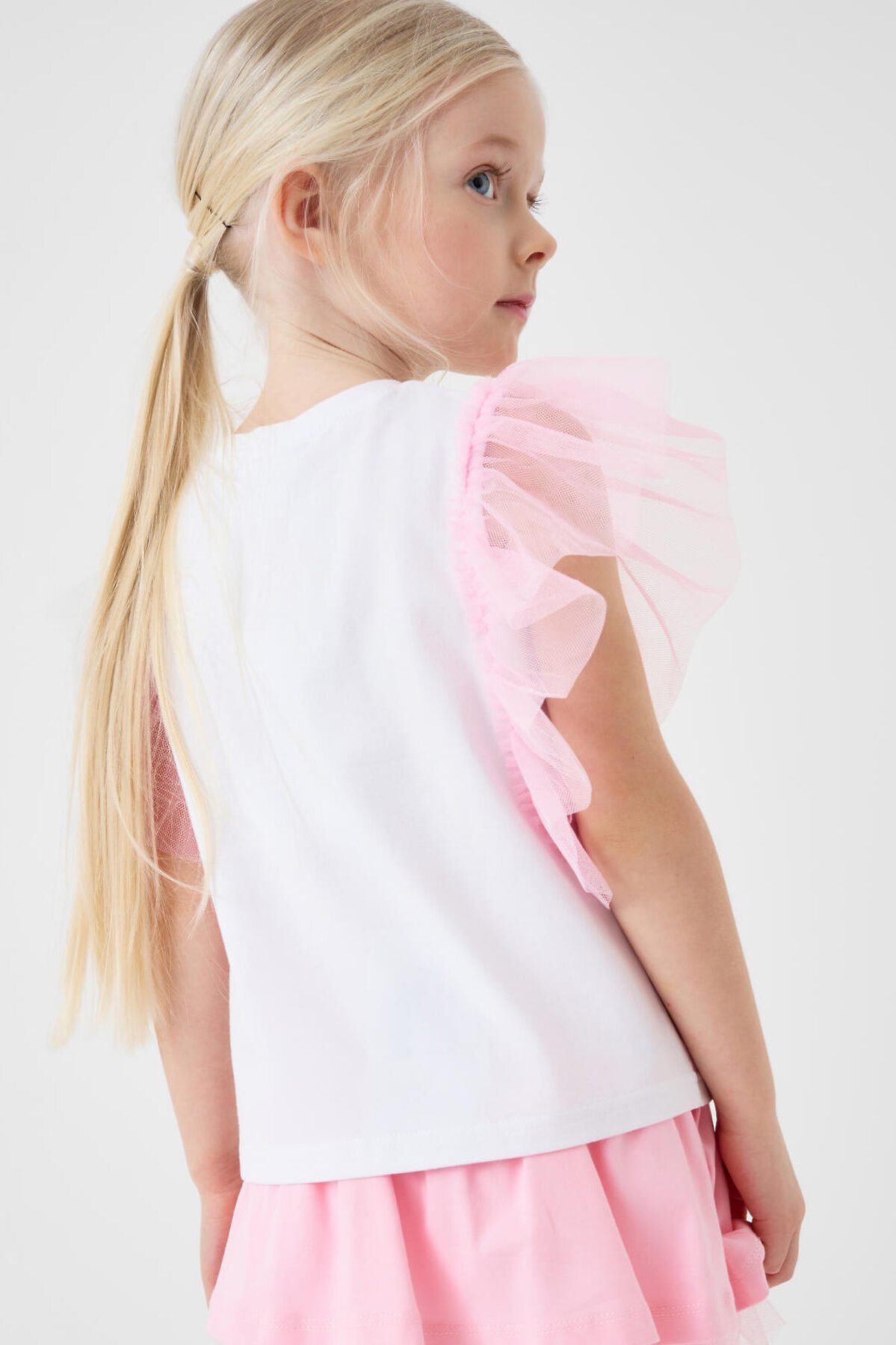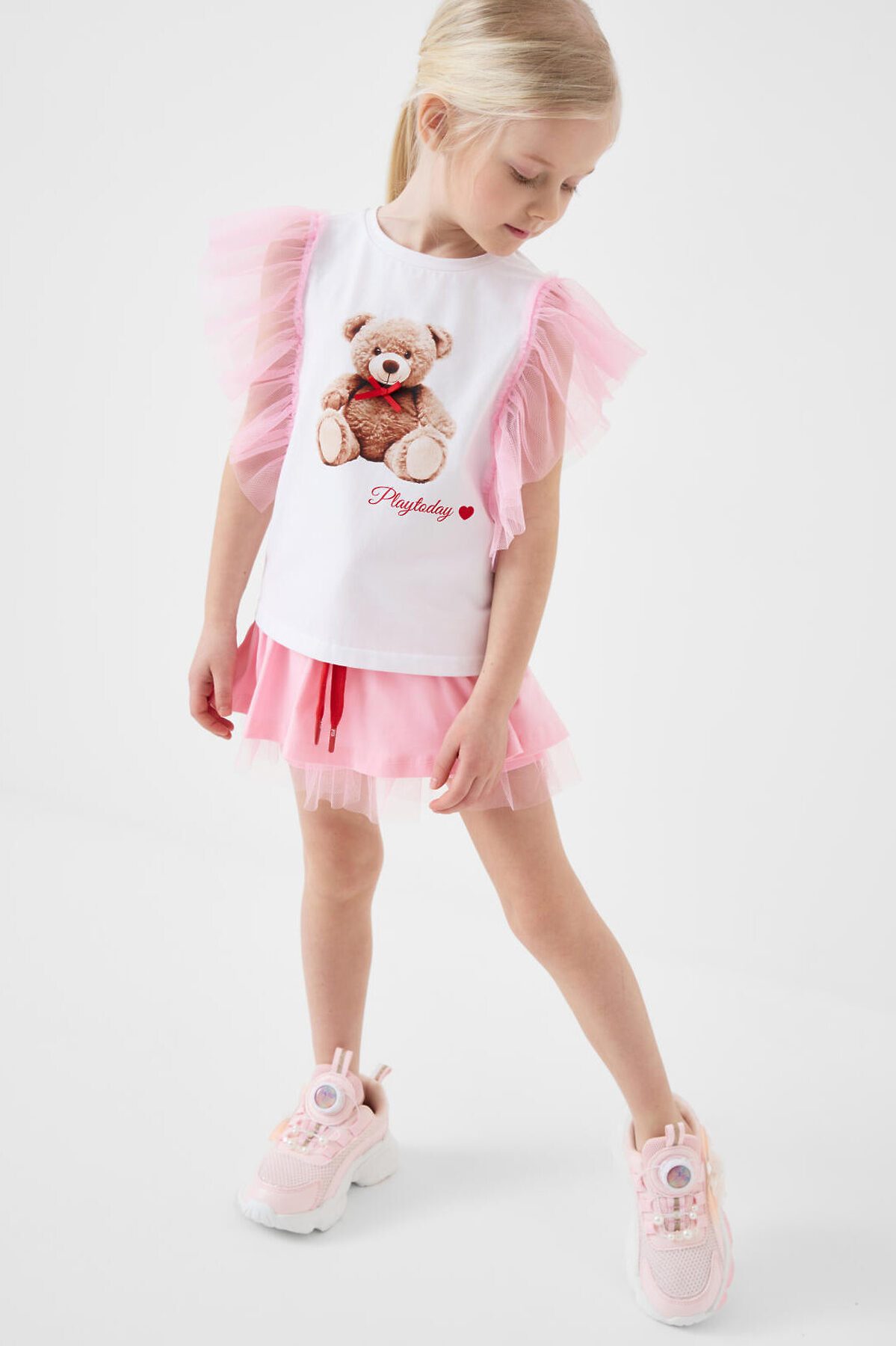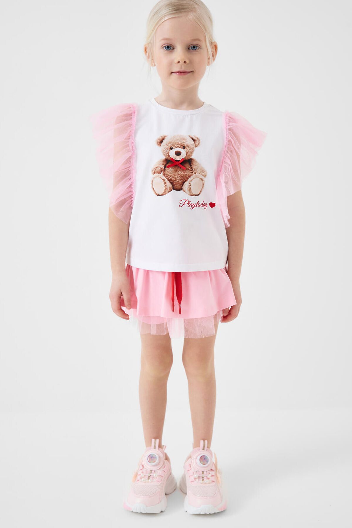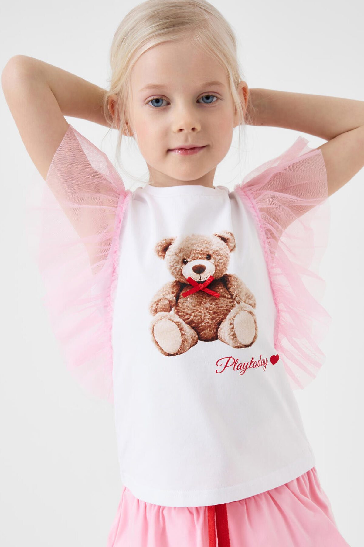 Детская футболка для девочки. Модель прямого кроя, выполнена из эластичного хлопкового трикотажа джерси. Спереди - принт с милым мишкой. Горловина круглая. Рукава-крылышки из сетки.