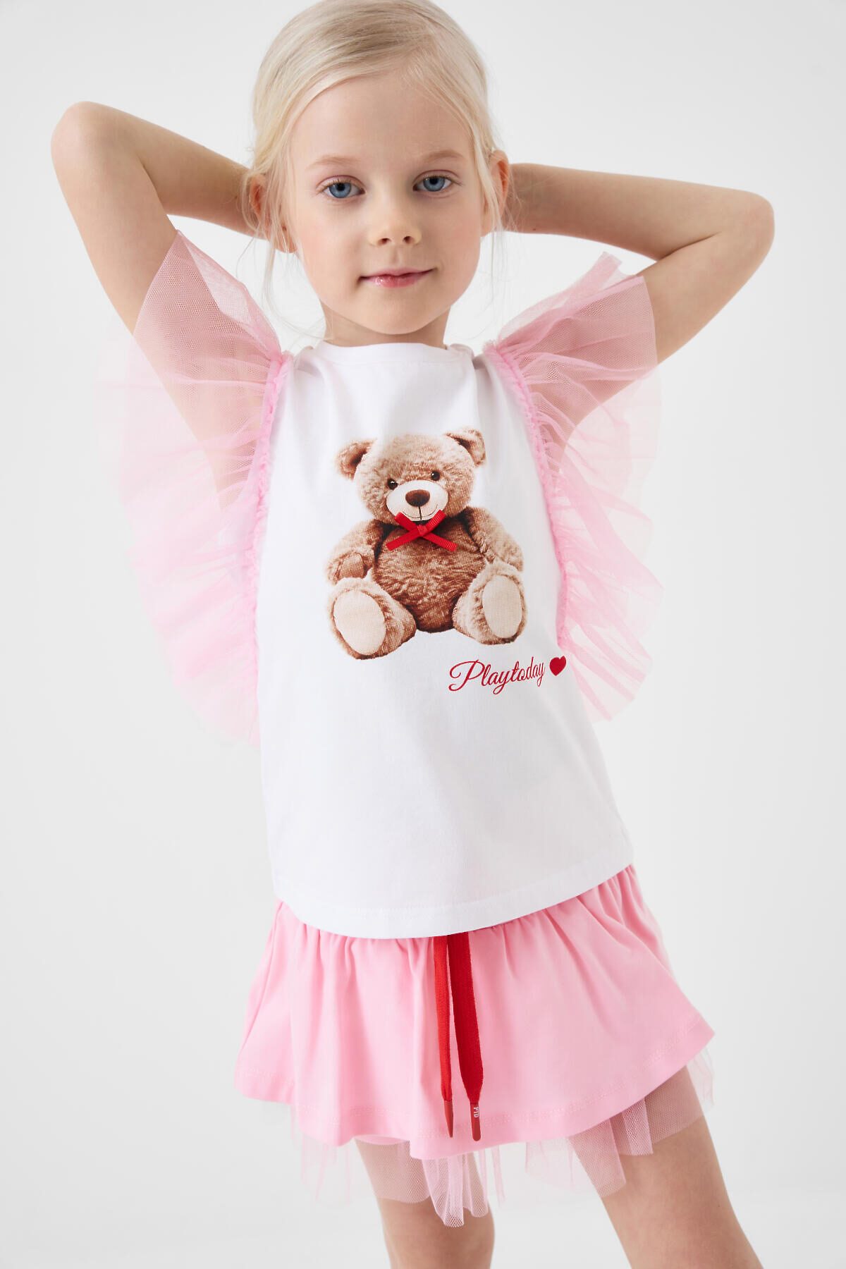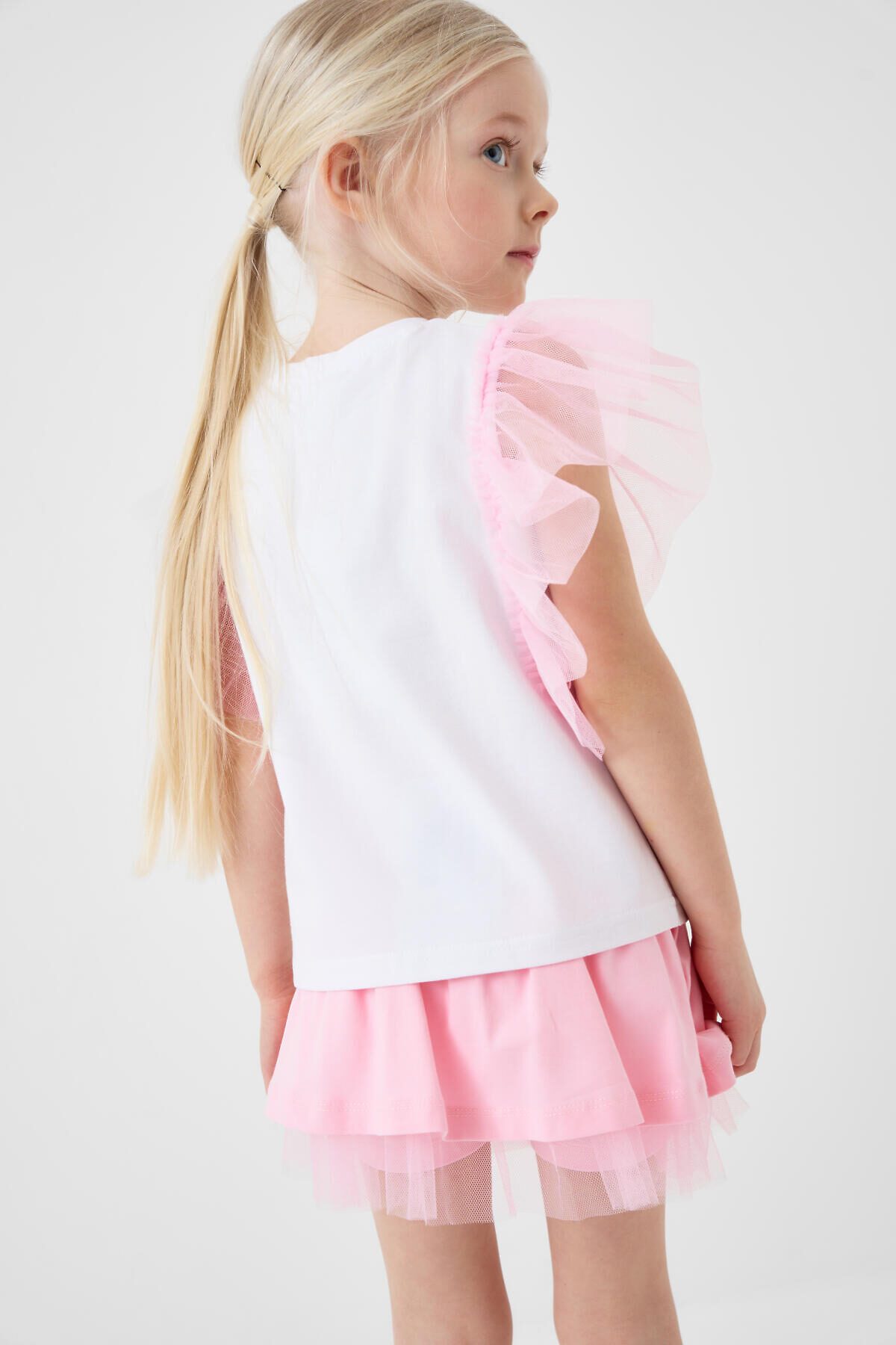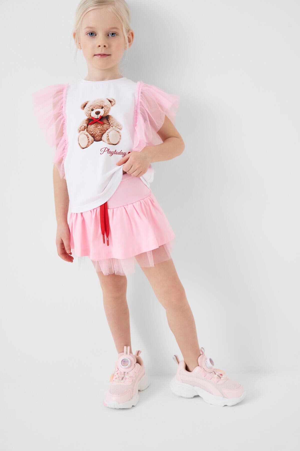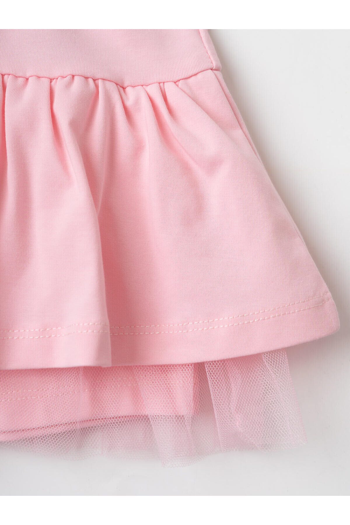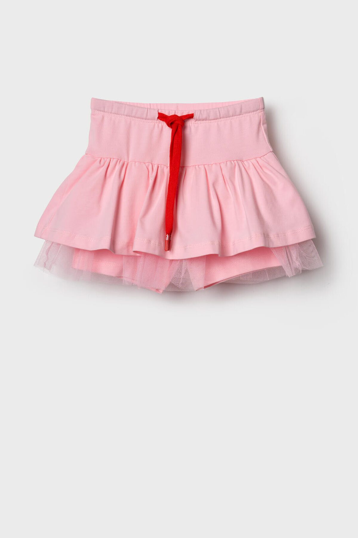 Детская юбка-шорты для девочки. Модель из мягкого хлопкового трикотажа джерси. Внешне выглядит как короткая юбка, но внутри вшиты удобные шорты, что делает модель комфортной для активного отдыха. Пояс широкий и эластичный, с декоративным шнурком. По низу юбки — легкая сетка, придающая изделию воздушность и дополнительный объём.