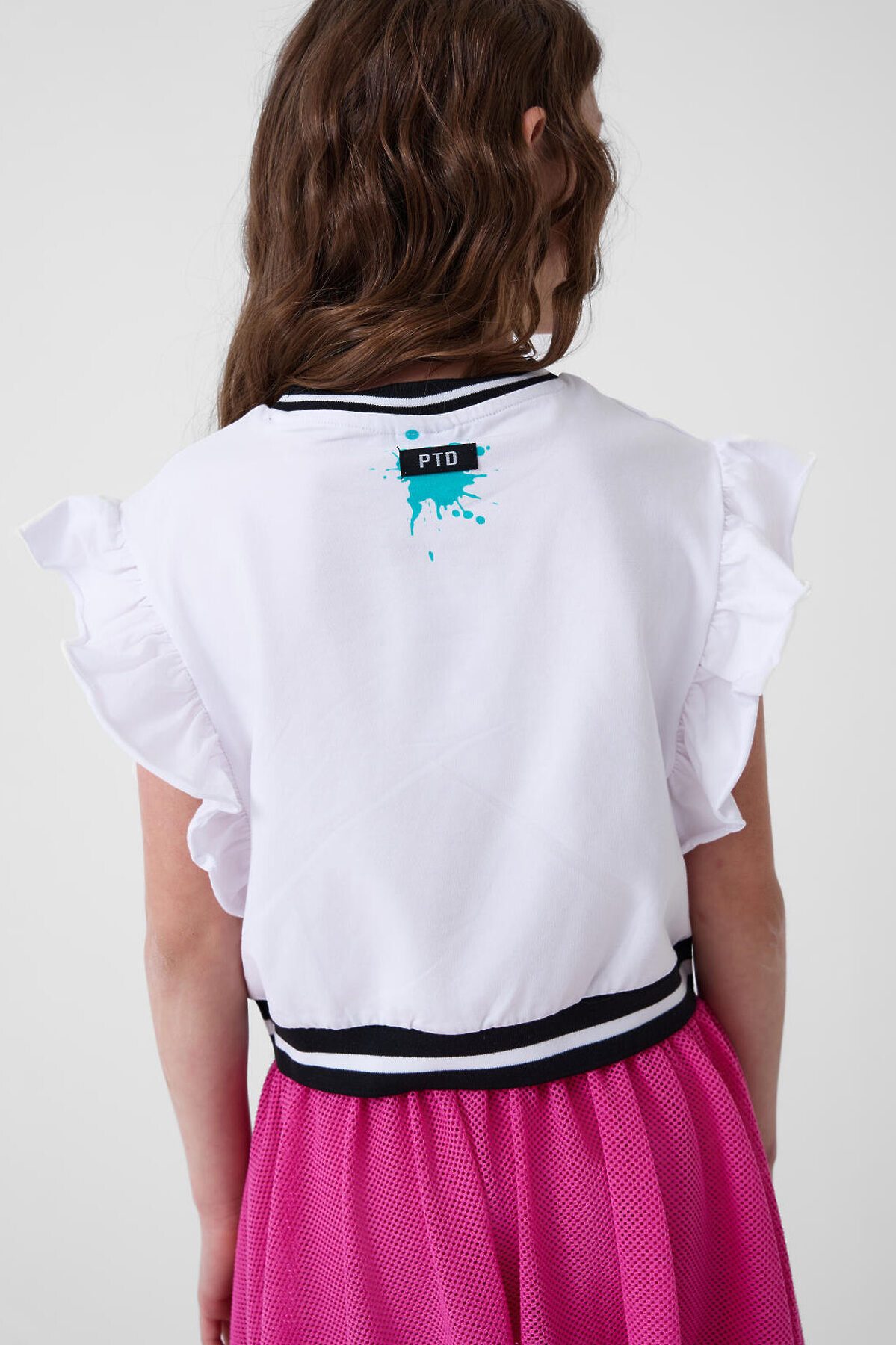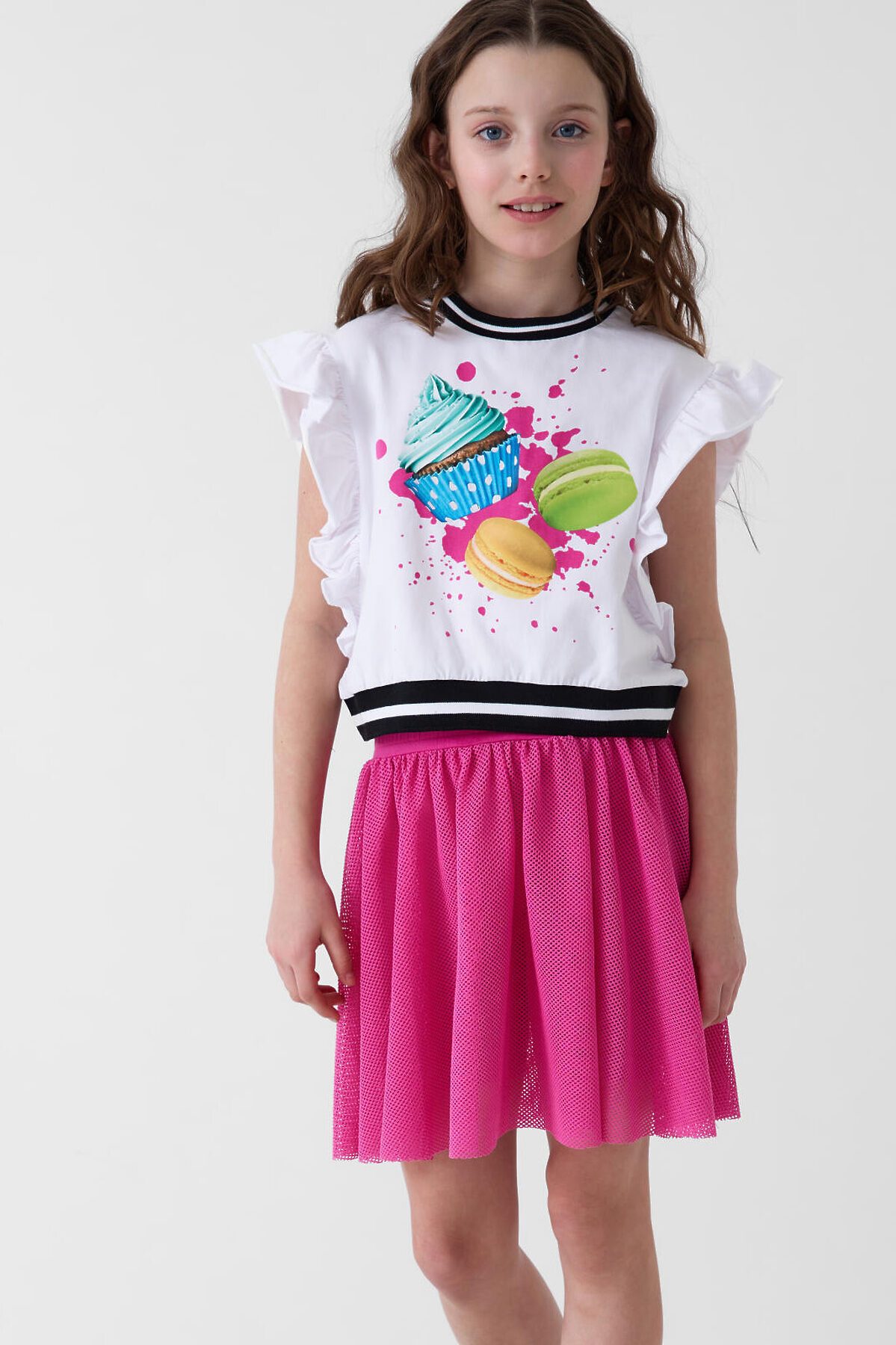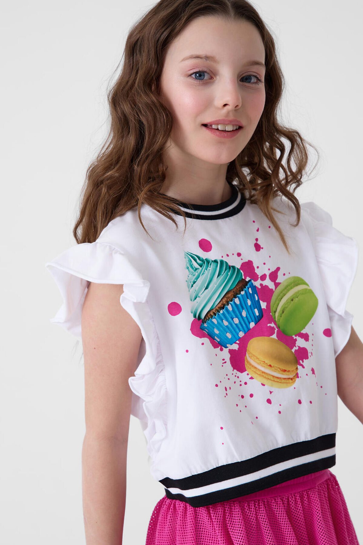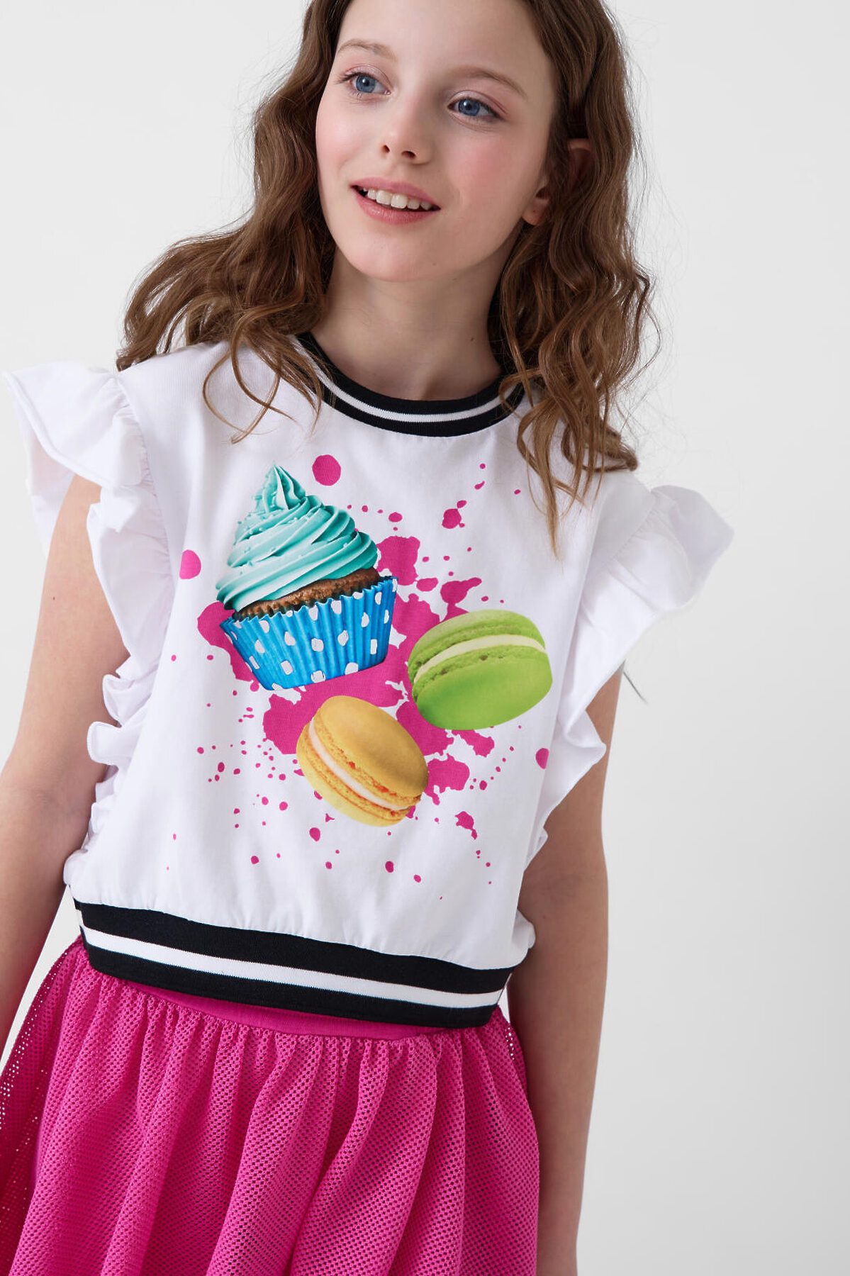 Футболка для девочки подростка. Модель укороченная, выполнена из эластичного хлопкового трикотажа джерси. На груди расположен красочный принт с изображением капкейков и макарунов. Горловина и низ изделия, обработаны эластичным рибом. Рукава - крылышки.