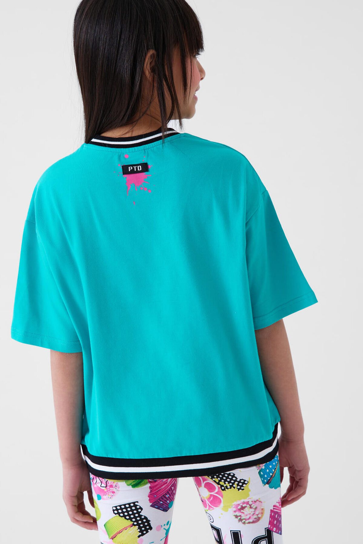 Футболка оверсайз для девочки подростка. Модель выполнена из эластичного хлопкового трикотажа джерси. На груди расположен крупный красочный принт. Горловина и низ обработаны эластичным рибом.
