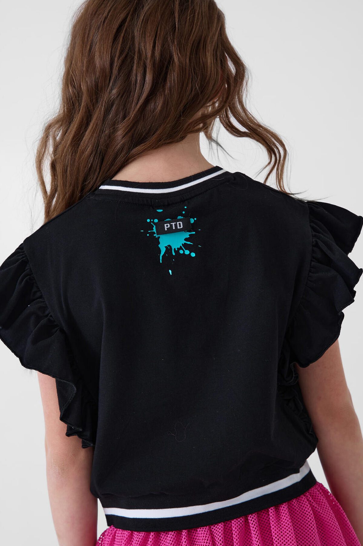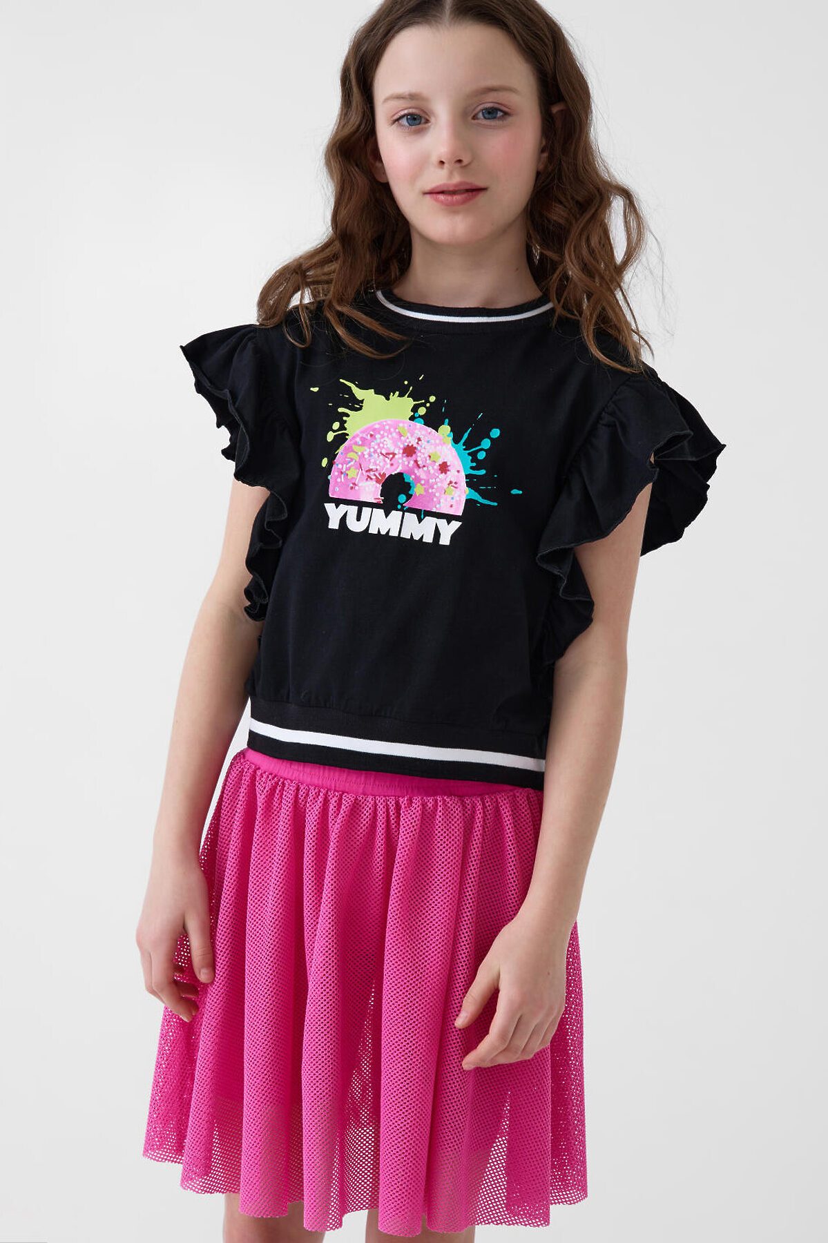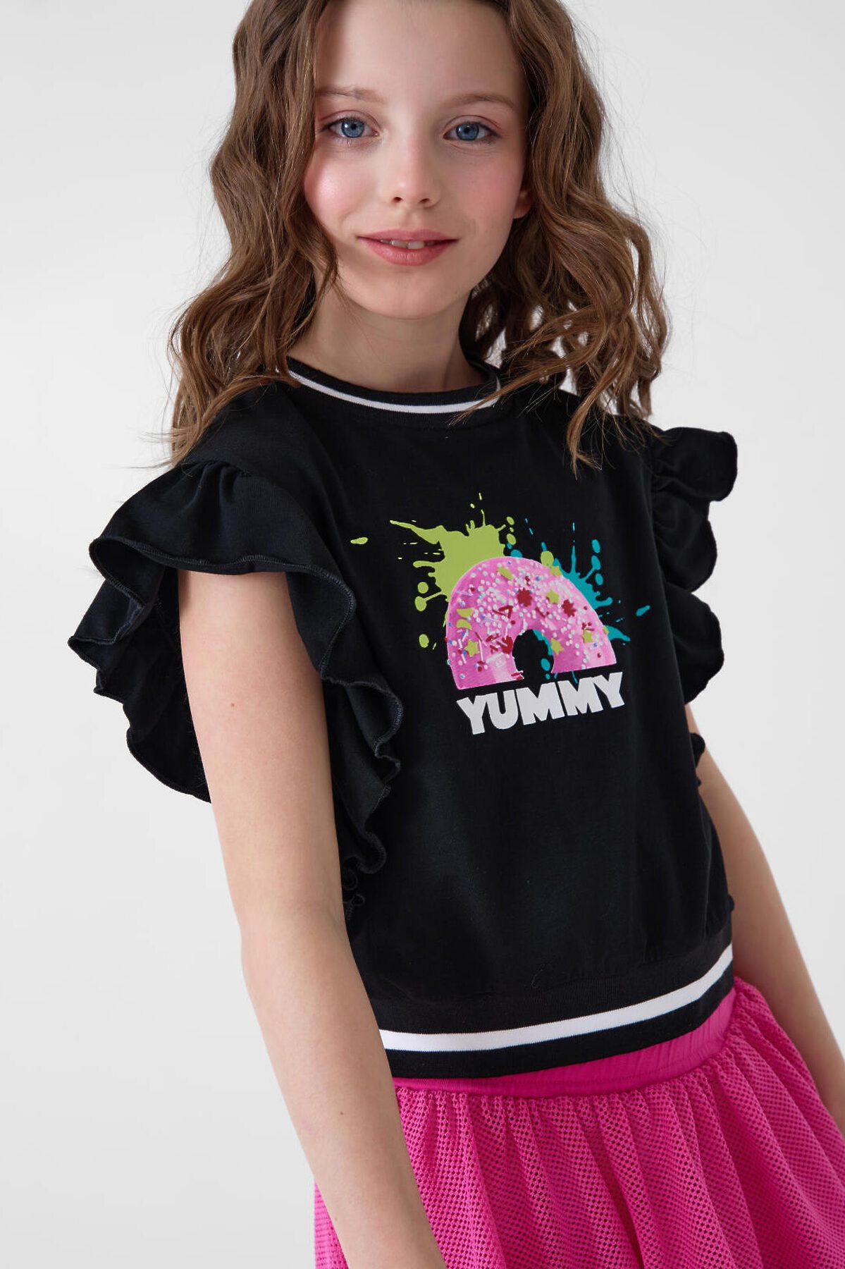 Футболка для девочки подростка. Модель укороченная, выполнена из эластичного хлопкового трикотажа джерси. На груди расположен красочный принт с изображением доната. Горловина и низ изделия, обработаны эластичным рибом. Рукава - крылышки.