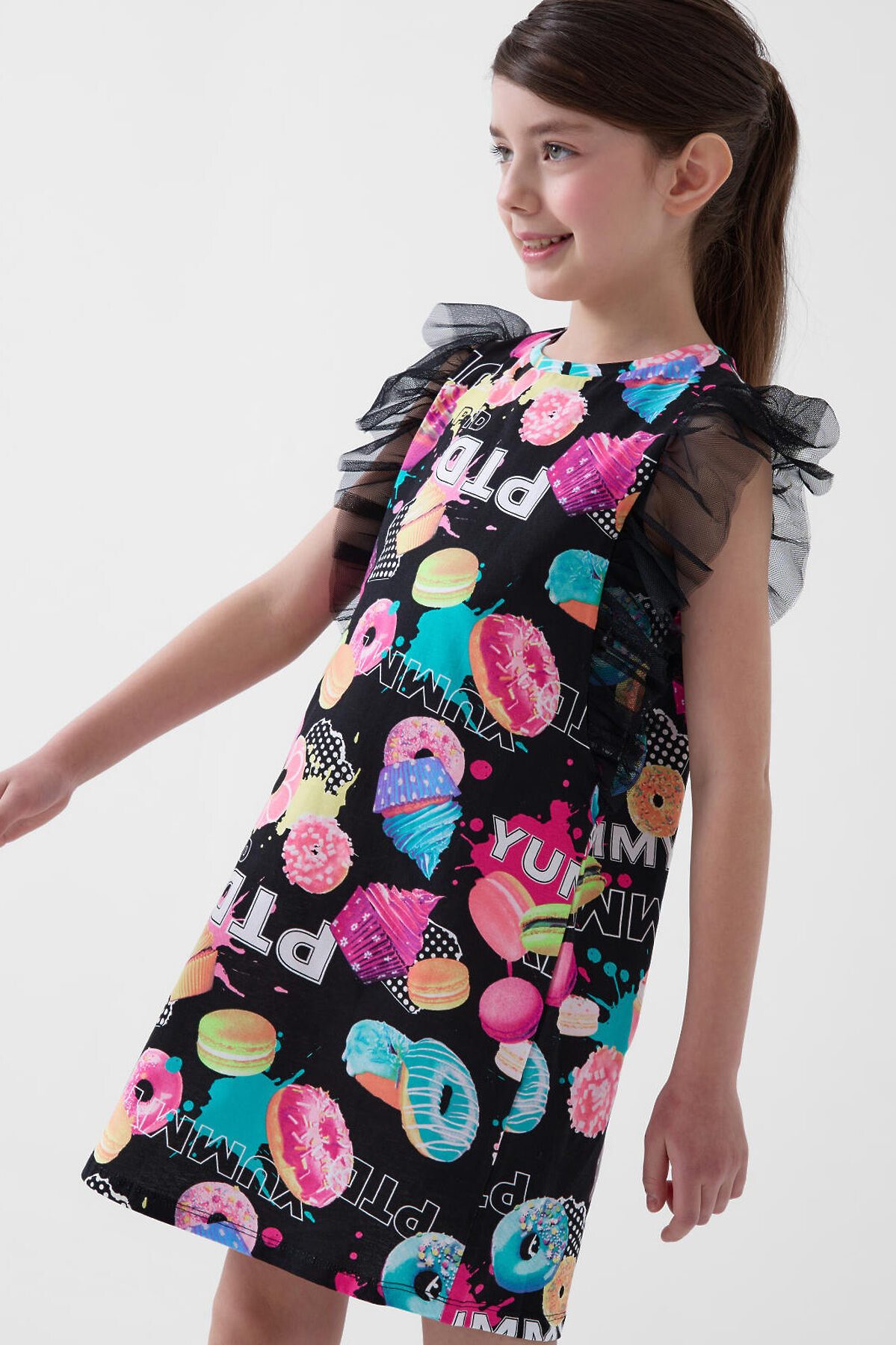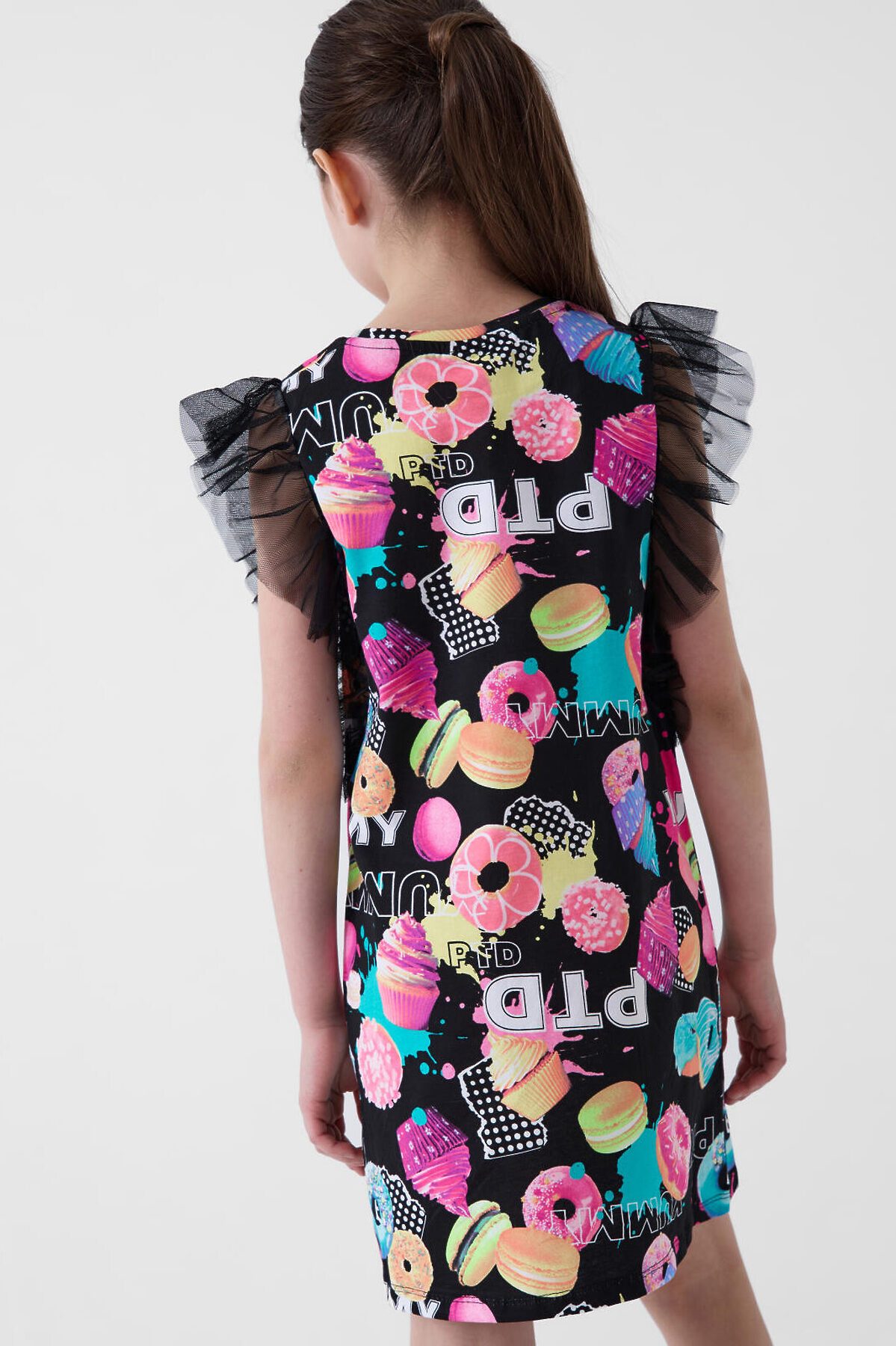 Яркое платье для девочки подростка. Выполнено из мягкого хлопкового трикотажа джерси с оригинальным многоцветным принтом. Дизайн украшен изображениями пирожных, пончиков и ярких сладостей. По рукавам — декоративные крылышки из лёгкой двухслойной сетки, которые придают образу воздушность. Круглый вырез горловины с аккуратной отделкой. Платье прямого силуэта и укороченной длины — чуть выше колена.